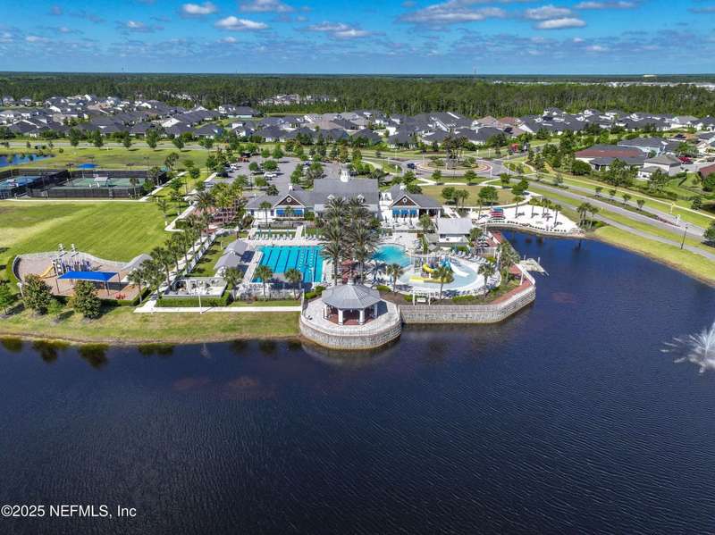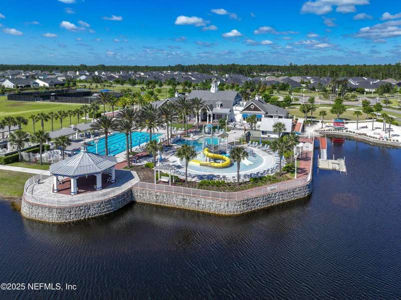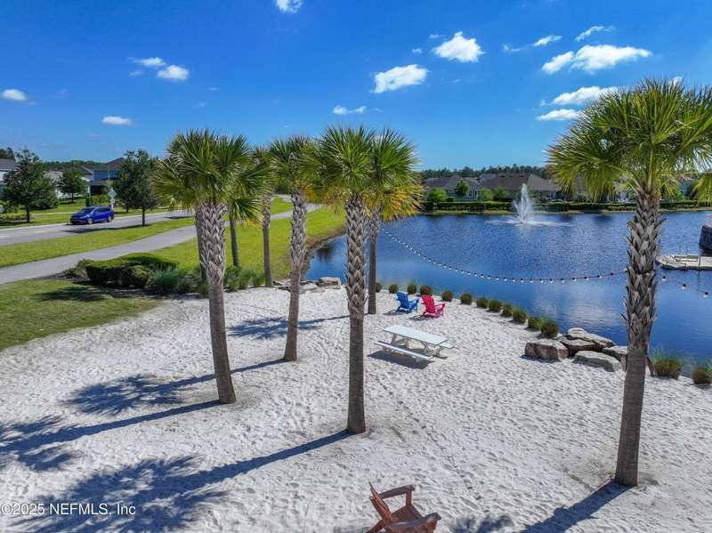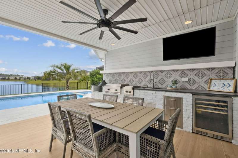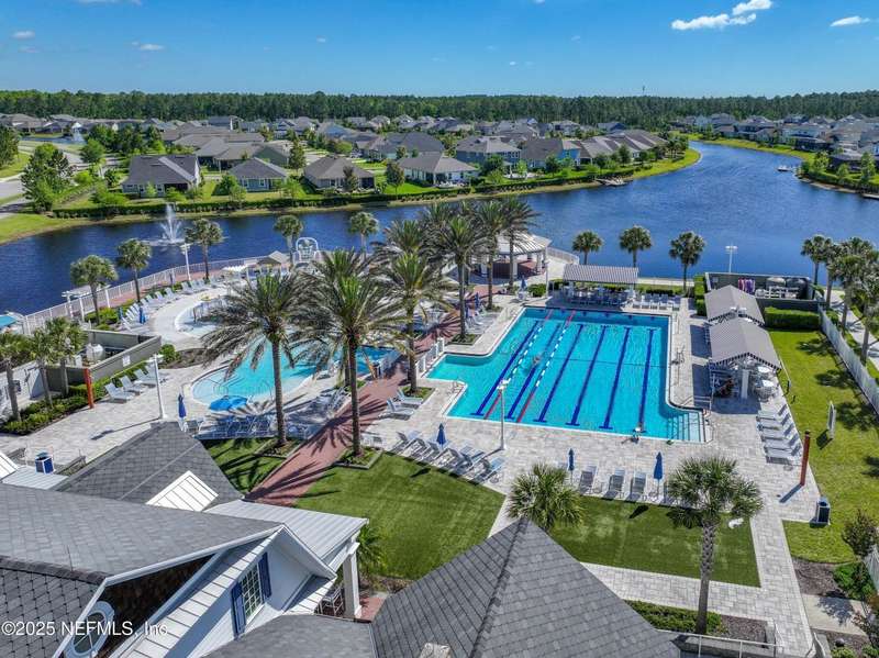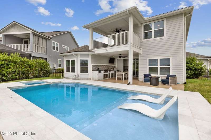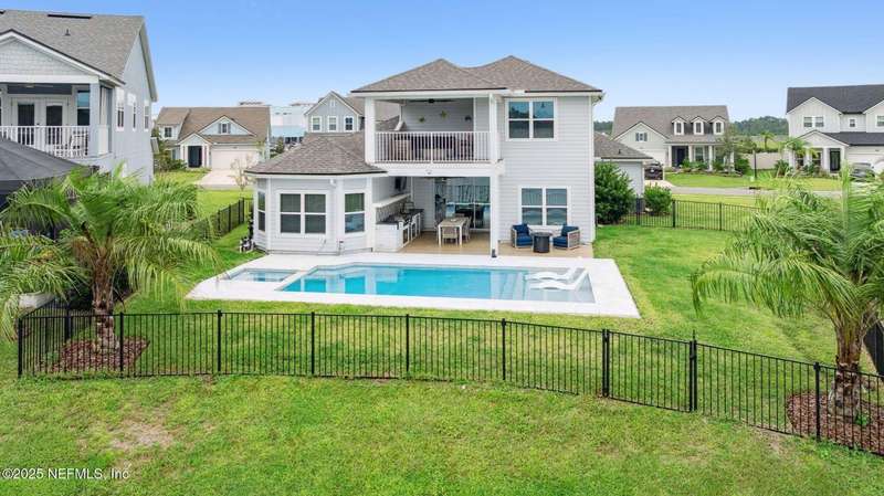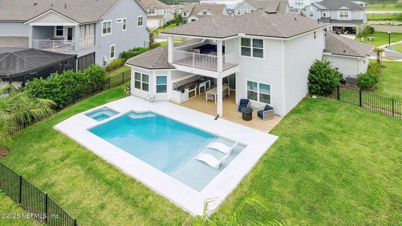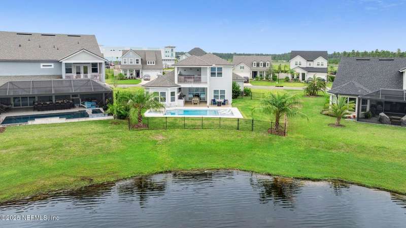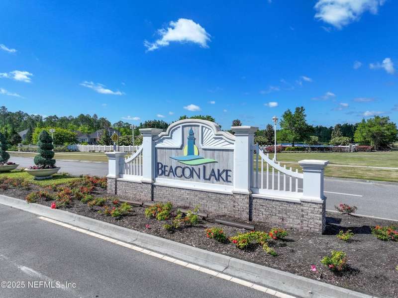 Come fall in love with this stunning pool home located on a peaceful lake in the highly desirable community of Beacon Lake. Vacation in your own backyard!! Pool is heated AND cooled so you can swim year round. Pool features a sun deck with built in recliners, large spa and all surrounded by a marble patio. Custom summer kitchen has green egg, gas flat top grill, dbl burner, fridge and sink. Step inside to this stunning home w/ upgraded LVP floors throughout the home. Chefs kitchen w/ large island, tile backsplash opens to eat in area w/ custom cabinets overlooking the oversized family room and all opening to covered patio with fenced yard and incredible views. Master suite is a dream with glamour bath with oversized walk in shower, dbl vanities and closet w/ organizers. Two more bedrooms on first floor. Upstairs is large bedroom/2 closets/full bath and a balcony overlooking backyard. Home is within walking distance to K-8 school, amenity center with its stunning Lakehouse!