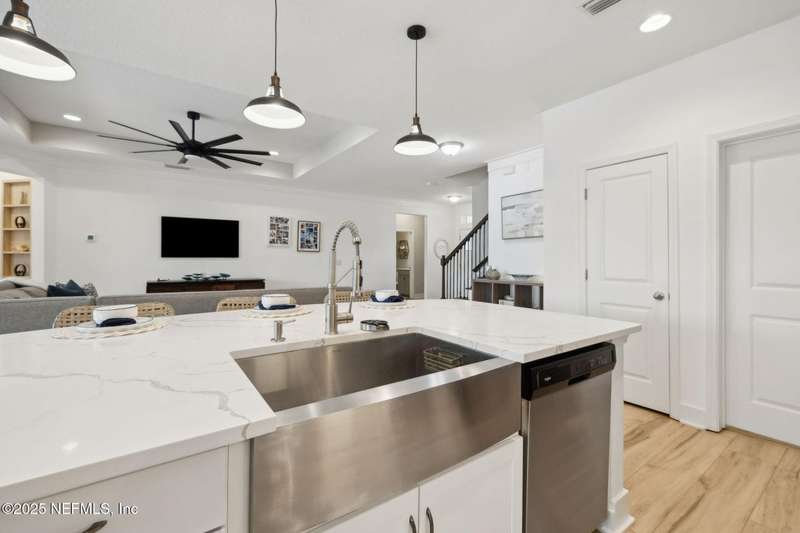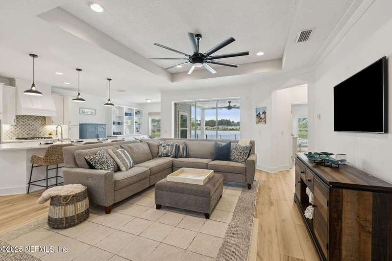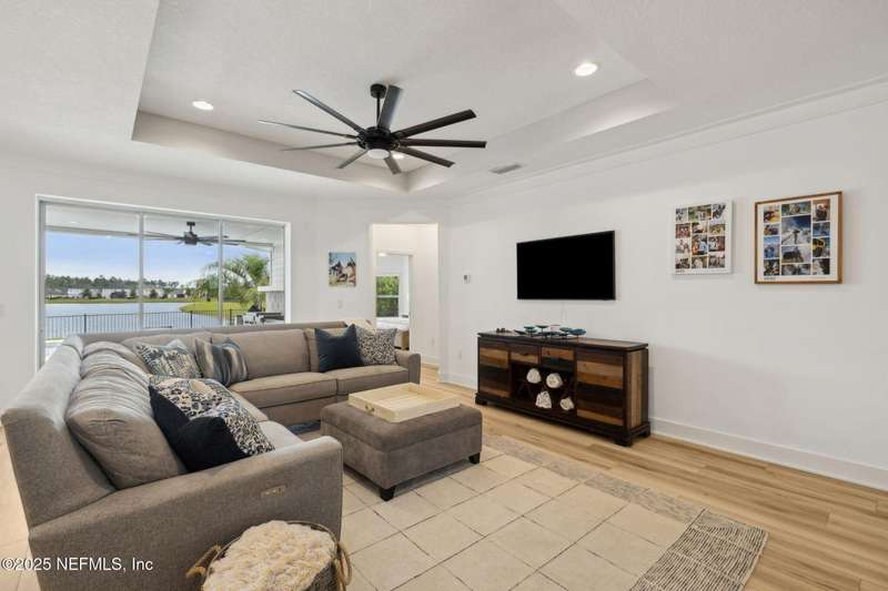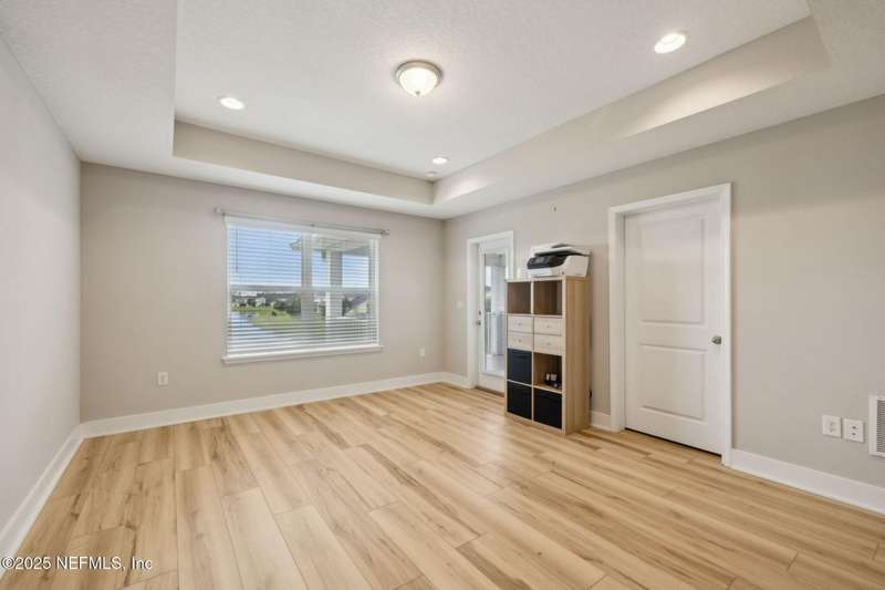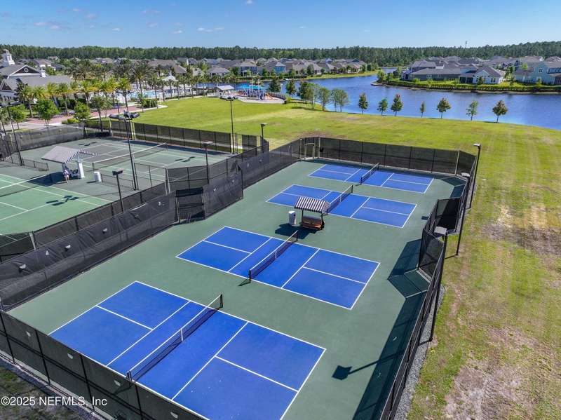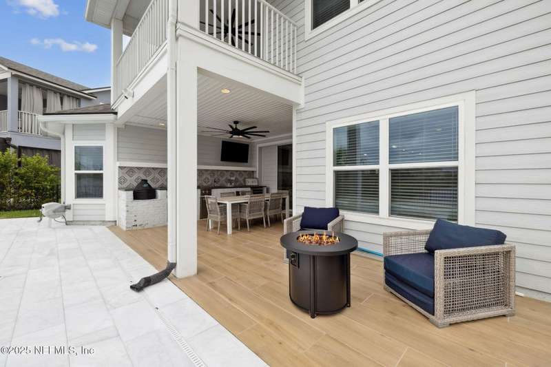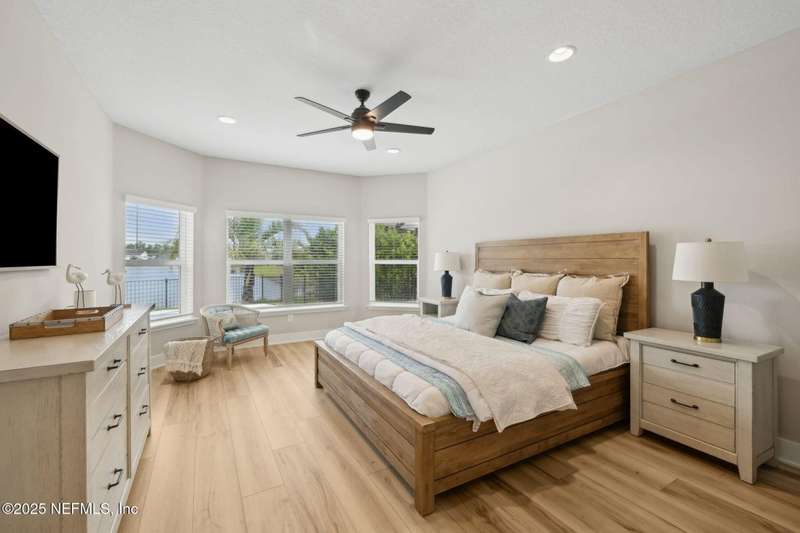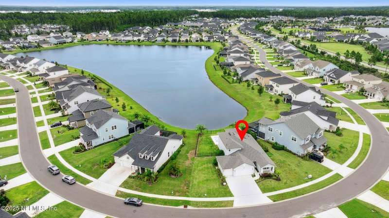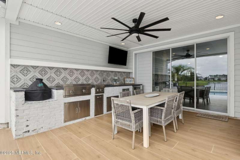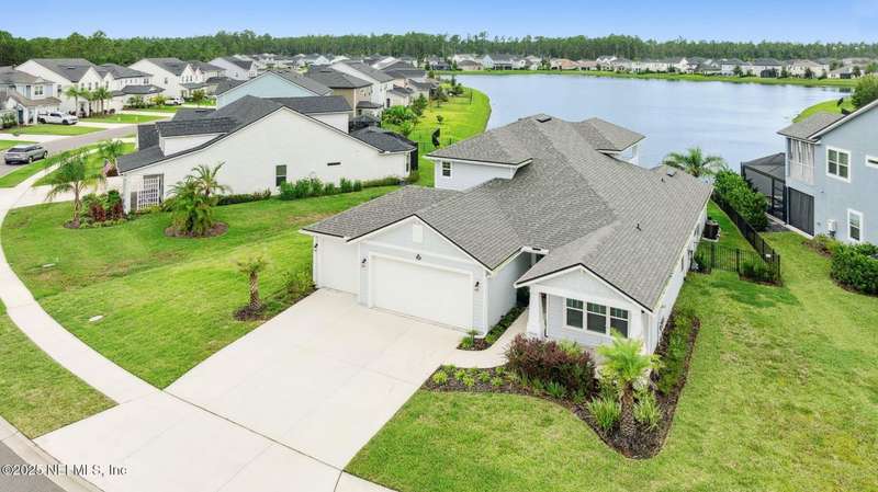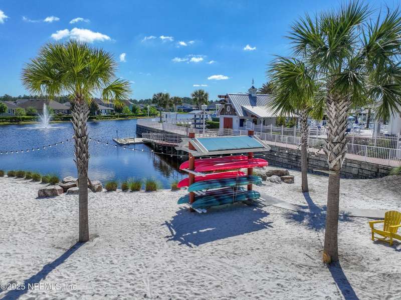 Come fall in love with this stunning pool home located on a peaceful lake in the highly desirable community of Beacon Lake. Vacation in your own backyard!! Pool is heated AND cooled so you can swim year round. Pool features a sun deck with built in recliners, large spa and all surrounded by a marble patio. Custom summer kitchen has green egg, gas flat top grill, dbl burner, fridge and sink. Step inside to this stunning home w/ upgraded LVP floors throughout the home. Chefs kitchen w/ large island, tile backsplash opens to eat in area w/ custom cabinets overlooking the oversized family room and all opening to covered patio with fenced yard and incredible views. Master suite is a dream with glamour bath with oversized walk in shower, dbl vanities and closet w/ organizers. Two more bedrooms on first floor. Upstairs is large bedroom/2 closets/full bath and a balcony overlooking backyard. Home is within walking distance to K-8 school, amenity center with its stunning Lakehouse!