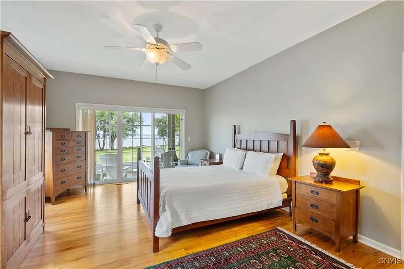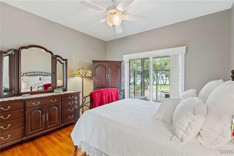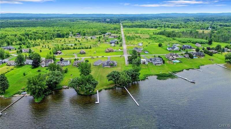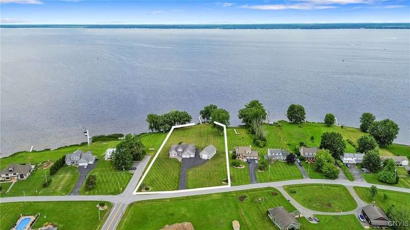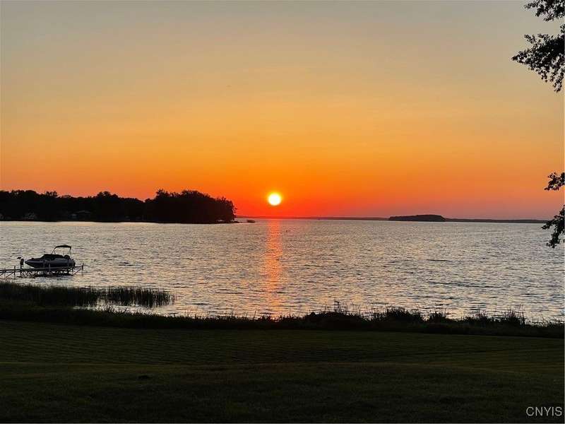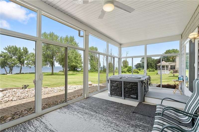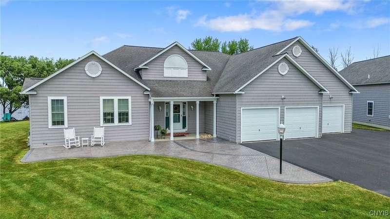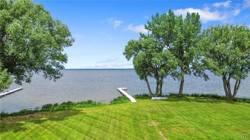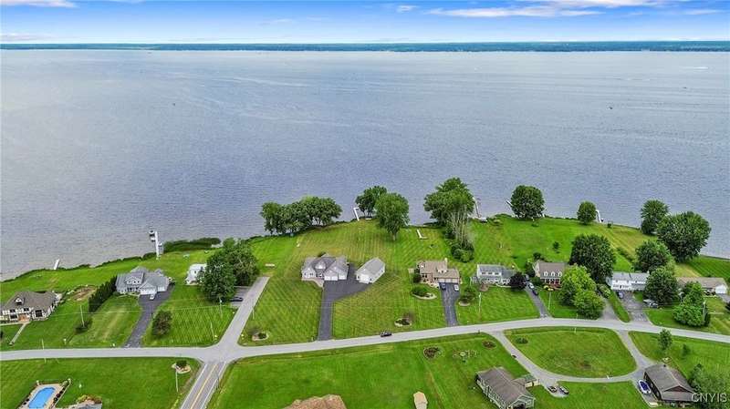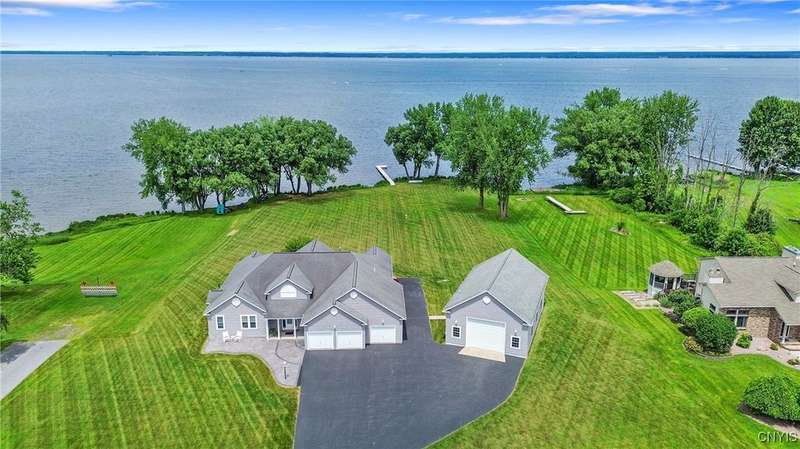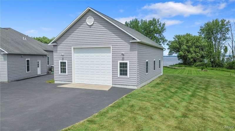 Located on nearly 2.5 acres in a beautifully maintained neighborhood, and offering approximately 214 feet of stunning water frontage on the south shore of Oneida Lake, this property offers stunning panoramic views that stretch endlessly in every direction. This one owner custom built stunning four-bedroom ranch offers a perfect blend of comfort and style. The home features two enclosed patios with spectacular views of the lake, ideal for relaxing or entertaining, complete with a hot tub for ultimate relaxation. The blonde maple kitchen cabinets complemented by elegant quartz countertops add a touch of modern sophistication. A charming handmade barn door leads to the pantry, adding rustic charm. The living room impresses with soaring cathedral ceilings accented by beautiful Hickory beams. The primary suite offers a large walk-in closet, full bath, and office nook leading to another bedroom, private den, or family room. Completing the main floor are two additional bedrooms and 2 full baths, with each room having endless views of the lake. The full basement is spotless and dry with epoxy floor and fully waterproofed. Also included on the property is a 1500 sq. ft. 2nd garage with a 12 x 14 ft overhead door, perfect for your auto and recreational needs. The heated garage is equipped with a bathroom, car lift and ample workspace, ideal for car enthusiasts with drains for washing your toys! There's plenty of room to store boats, jet skis, snowmobiles! Upstairs is an additional 700 sq. ft of space waiting to be customized - whether you envision a studio, workshop, or income potential with an airB&B guest suite, the possibilities are endless. Flood Insurance is NOT required! Don't miss out on this opportunity to own this exquisite property and all that lake living has to offer!