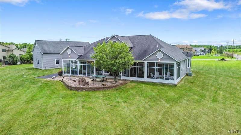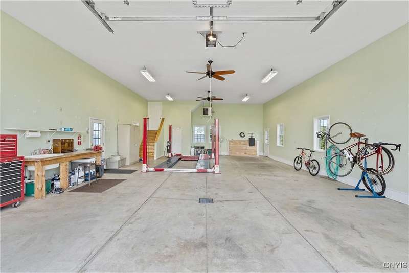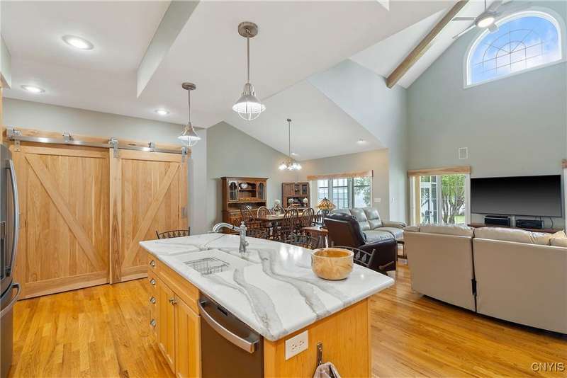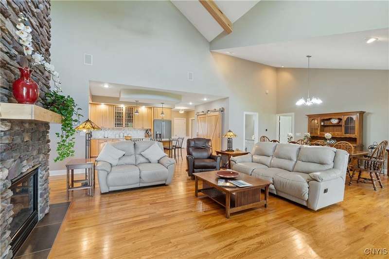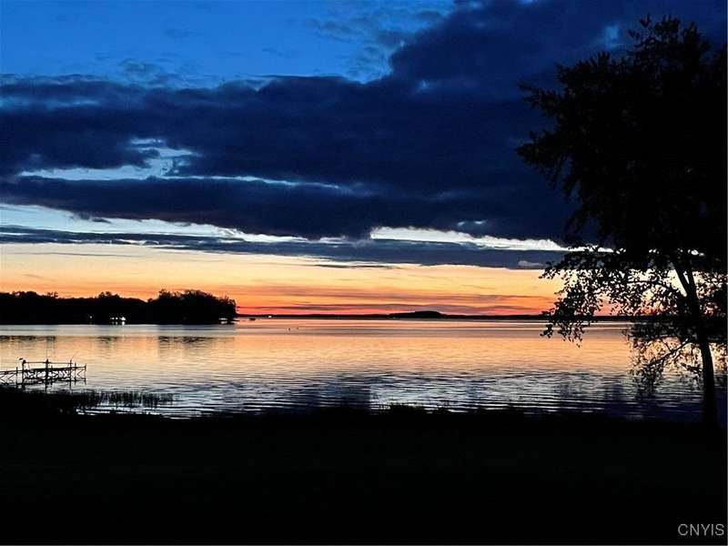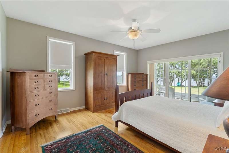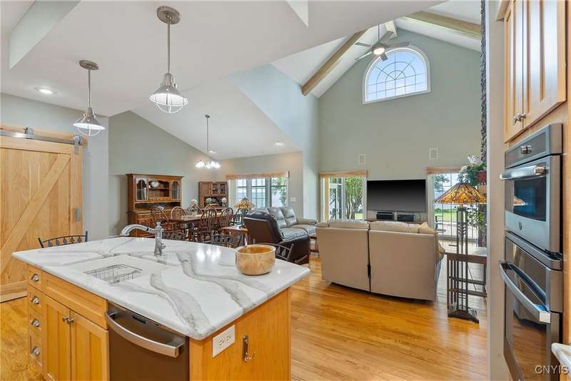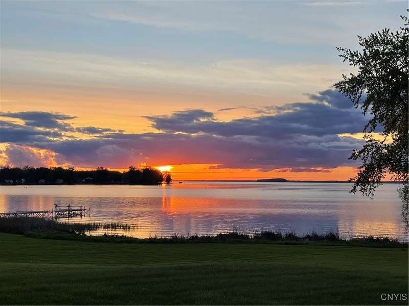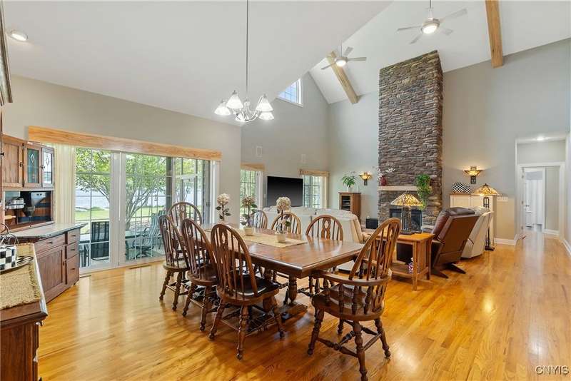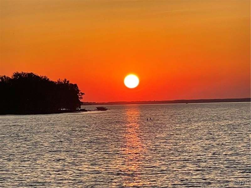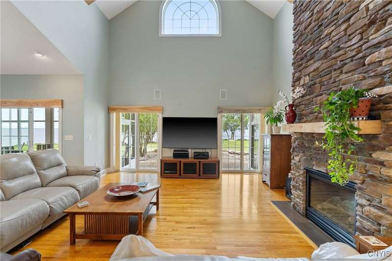 Located on nearly 2.5 acres in a beautifully maintained neighborhood, and offering approximately 214 feet of stunning water frontage on the south shore of Oneida Lake, this property offers stunning panoramic views that stretch endlessly in every direction. This one owner custom built stunning four-bedroom ranch offers a perfect blend of comfort and style. The home features two enclosed patios with spectacular views of the lake, ideal for relaxing or entertaining, complete with a hot tub for ultimate relaxation. The blonde maple kitchen cabinets complemented by elegant quartz countertops add a touch of modern sophistication. A charming handmade barn door leads to the pantry, adding rustic charm. The living room impresses with soaring cathedral ceilings accented by beautiful Hickory beams. The primary suite offers a large walk-in closet, full bath, and office nook leading to another bedroom, private den, or family room. Completing the main floor are two additional bedrooms and 2 full baths, with each room having endless views of the lake. The full basement is spotless and dry with epoxy floor and fully waterproofed. Also included on the property is a 1500 sq. ft. 2nd garage with a 12 x 14 ft overhead door, perfect for your auto and recreational needs. The heated garage is equipped with a bathroom, car lift and ample workspace, ideal for car enthusiasts with drains for washing your toys! There's plenty of room to store boats, jet skis, snowmobiles! Upstairs is an additional 700 sq. ft of space waiting to be customized - whether you envision a studio, workshop, or income potential with an airB&B guest suite, the possibilities are endless. Flood Insurance is NOT required! Don't miss out on this opportunity to own this exquisite property and all that lake living has to offer!