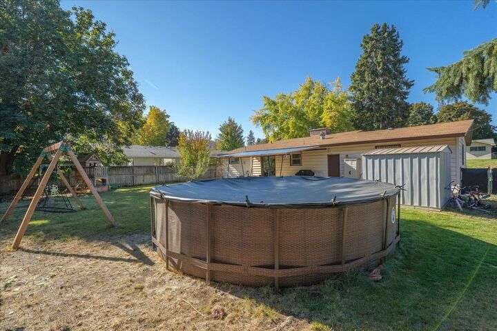 Immaculate and charming 4 bed, 1.5 bath rancher in the South Valley! Only one block away from the beautiful Dishman Mica nature trails where you can walk, hike, bike for miles. Gorgeous masonry fireplace, hardwood floors, 3 bdrms and laundry on main floor, formal dining room and abundant storage space! Updated York furnace and A/C in 2019. Rinnai instant-hot in kitchen. Above ground pool and two spacious sheds in large fenced backyard with plenty of room for all your gardening equipment and tools. RV parking; no HOA. This gem won't last long!