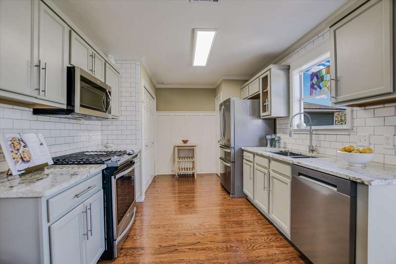 The kitchen offers a Whirlpool stainless steel Golden Series convection oven, a five-burner cooktop, granite countertops, and classic white subway tile--ideal for both everyday cooking and entertaining.