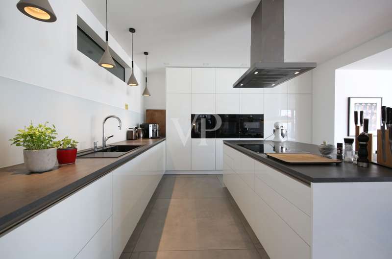 The apartment with a total of 214 m² of living space was extensively renovated and modernized in 2021. The historic first floor was given new extensions in timber frame construction, which made the floor plan more spacious and open. The entire lower level of the apartment has underfloor heating supplied by an air-to-water heat pump. All windows and doors are fitted with electric blinds and ensure bright, light-flooded rooms. The entrance door leads to a large lounge area, which is seamlessly connected to the open-plan kitchen, dining and living area. On cool evenings, a fireplace provides cozy warmth and cozy hours. The modern kitchen with cooking island, numerous built-in cupboards and high-quality appliances leaves nothing to be desired. The adjoining dining area flows into the bright living room, from where you have a wonderful view of the garden with pool and direct access to the terrace. The master bedroom has a spacious dressing room with direct access to the stylish master bathroom, which is equipped with a shower and bathtub. There are two further bedrooms and a utility room. Both bathrooms impress with their high-quality fittings and modern design with views of the vineyards and the Spitzhaus. Only high-quality materials were used throughout the house and special details were cleverly staged. Large tiles measuring 1.20 m x 1.20 m - except in the bedrooms - create an elegant ambience. The ingenious lighting concept sets further accents. The apartment is characterized by its extremely energy-efficient construction. An air-to-water heat pump and a solar system for heating water ensure low operating costs. The garden has already been roughly landscaped. The materials for the path and patio coverings are available and only need to be laid. This item alone has a high five-figure value. The pool is under construction and awaits completion.