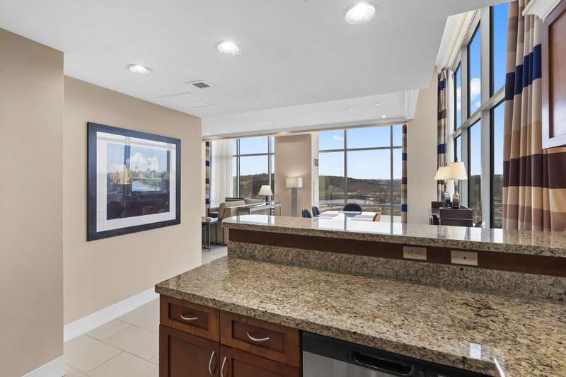 Luxurious penthouse condo with views for days! This unit is managed by the Hilton and owners get 21 days per year of personal use. Within walking distance of Branson Landing, with many amenities on site. This unit has wonderful rental history and comes fully furnished, making it a perfect turn-key investment opportunity for anyone looking to vacation in Branson, while bringing in income. All units within this Hilton location will be renovated within the next 6 months, which will increase income. Ask your agent for renderings!