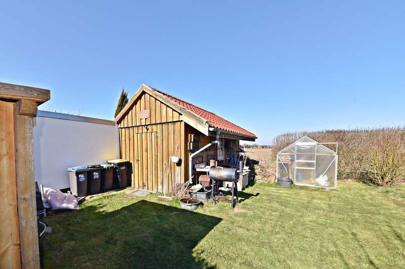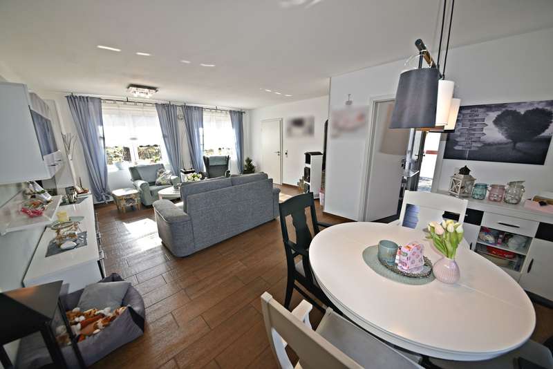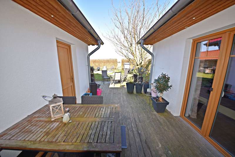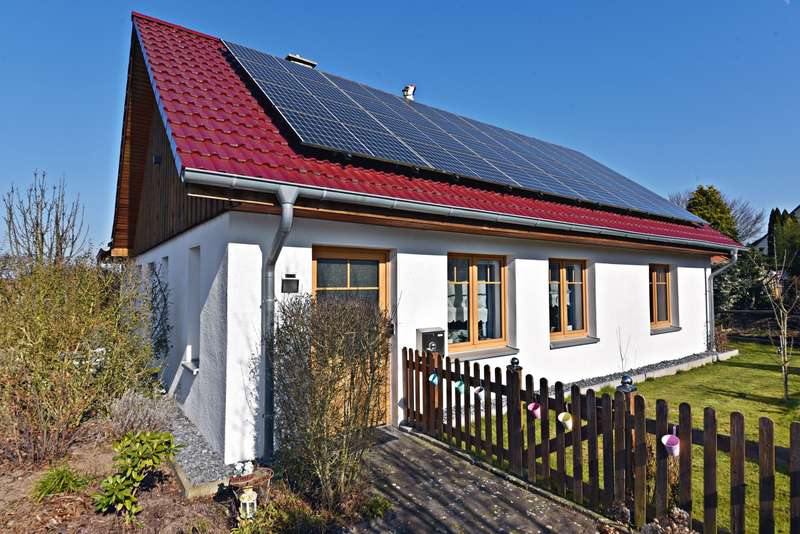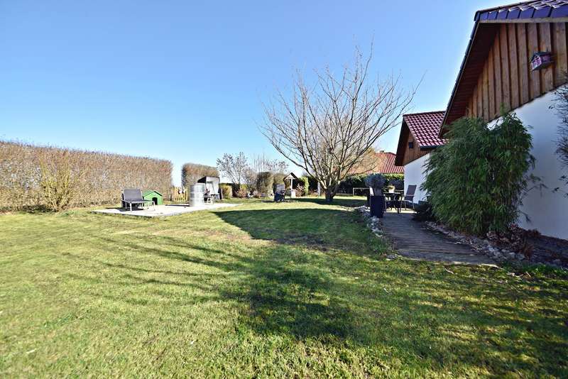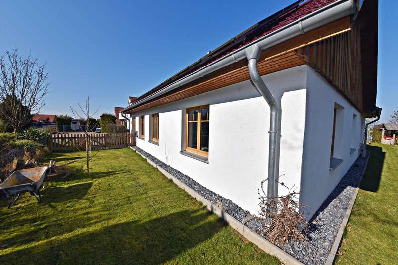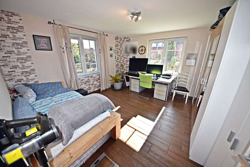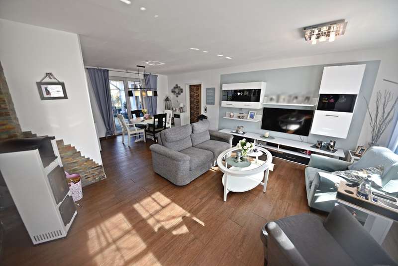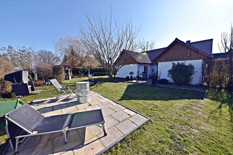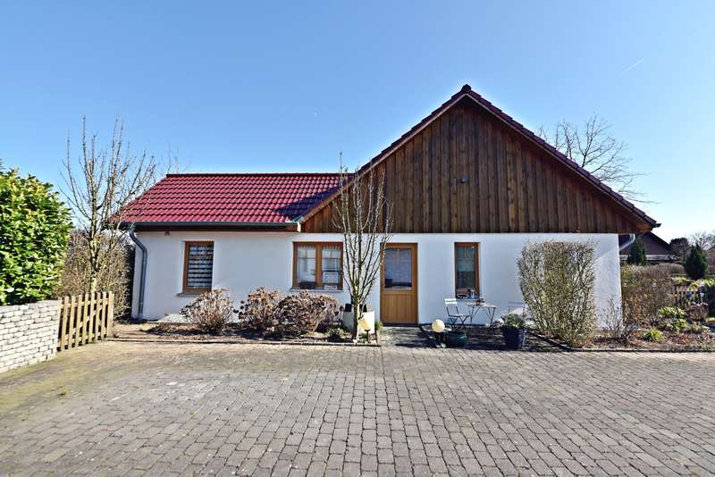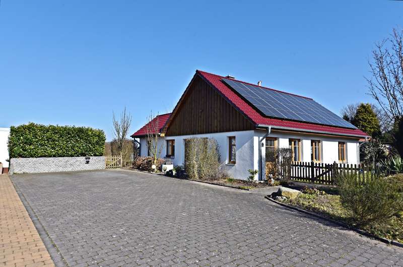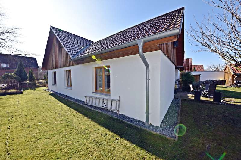 Modern and energy-efficient bungalow from 2012 in Hespe The property impresses with a living space of approx. 107 m² and is located on a plot of approx. 803 m². The architecture of the house combines contemporary comfort with a well thought-out room layout that meets the high demands of modern living. The bungalow has a total of 3 rooms, including a light-flooded living room with a cozy fireplace that creates a cozy atmosphere. The living room offers direct access to the terrace, which invites you to spend relaxing hours outdoors. The rooms are bright and friendly thanks to the large window fronts, and the triple glazing with elegant wooden cladding in a mullion look not only provides an aesthetic eye-catcher, but also excellent thermal insulation. The bathroom and a guest WC also contribute to the high level of living comfort. A special attraction of the house is the expansion reserve, which offers flexible usage options for future projects or extensions. The well-tended garden is easy to maintain and creates a pleasant feel-good atmosphere. A practical shed completes the offer and provides additional storage space. The bungalow is equipped with modern, environmentally friendly and energy-saving technologies. Underfloor heating provides even heat, while the integrated photovoltaic system with storage and the heat pump ensure an efficient and sustainable energy supply. The latter also has a cooling function that makes the living climate pleasant even on hot days. The combination of insulation, PV system and heat pump also guarantees a high level of energy efficiency. For future vehicle requirements, there is already an option to build an approved double carport. A wallbox for electric vehicles is also available and rounds off the environmentally friendly concept of the property. The connection to the fiber optic network enables a fast internet connection, which is particularly advantageous for home office work and digital applications. All in all, this bungalow not only offers a first-class location and generous living space, but also energy-efficient fittings that are ideal for modern requirements. The combination of thoughtful design, sustainable technology and an attractive outdoor area makes this property an appealing home for discerning buyers.