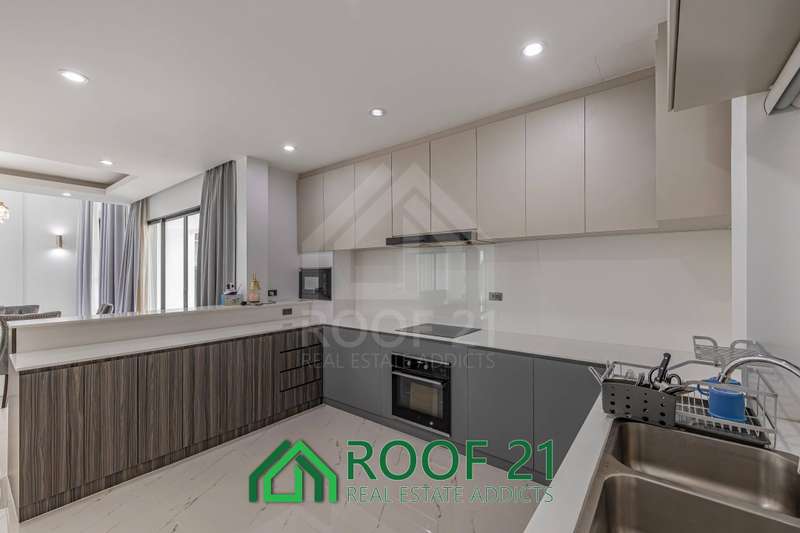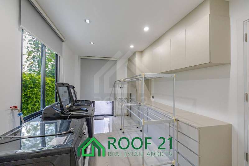 This charming and stylish house comes with 4 bedrooms and 4 bathrooms, plus 2 glass rooms that are perfect for a home office or a personal gym. The built-in kitchen has a nice countertop, and there's also a storage room that can be used for shoes or as a multi-purpose space.