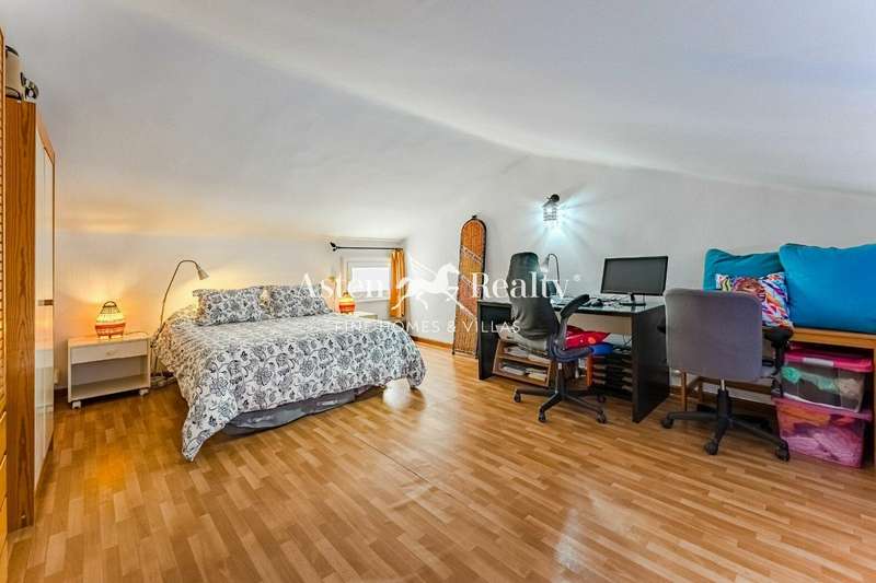 On the upper floor, accessed by a wooden staircase, is a second spacious and cozy bedroom.