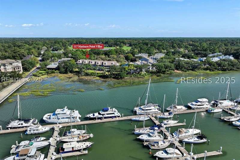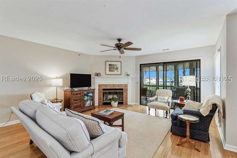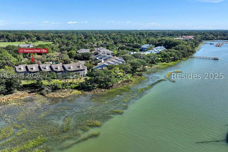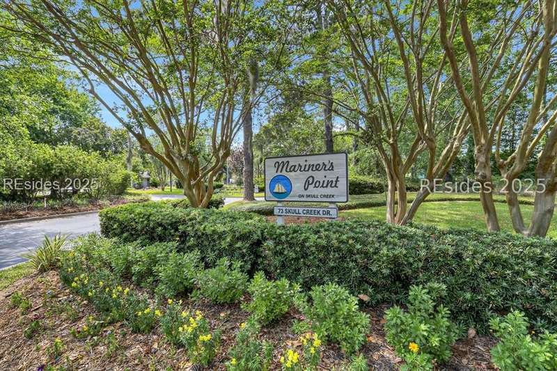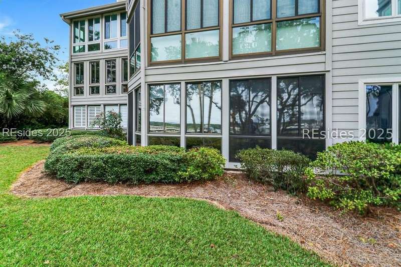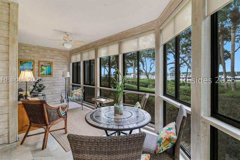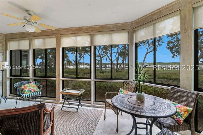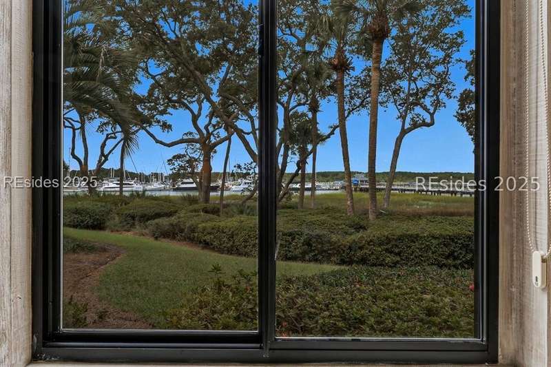 Experience panoramic ICW/Skull Creek & Marina views from this charming, updated, value priced, 2BR/2BA, 1600 SQ FT villa with convenient, much desired first floor locale in popular HHP. Features include smooth ceilings, walls of windows to view, quartz/granite counters, subway tile backsplash, attractive re-faced kitchen cabinetry, wood/tile/carpet flooring, custom window treatments, designer fixtures/hardware/lighting, ceiling fans, wood burning fireplace & impressive storage/closet space. Very livable floor plan offers updated kitchen w/island (butcher block top & breakfast bar) & stainless steel appliance package open to dining & expansive great rm, Carolina rm with shiplap walls & glass door to grounds, laundry rm and excellent BR separation featuring roomy primary suite with dual walk-in closets & well-appointed bath (dual vanities, vessel sinks & separate glass/tile surround walk-in shower) + ample guest BR suite with walk-in closet & private bath. All with covered entry, large exterior storage closet, impressive on-site pool/tennis/pickleball and prime location across street from CCHH & close proximity to shopping, dining, entertainment and all community amenities.