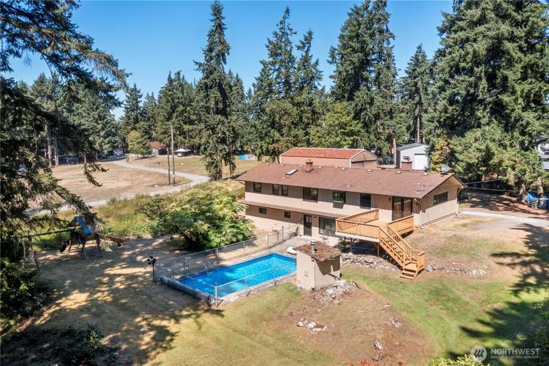 Rare Opportunity, First Time on Market in 35 Years! This 2.84-acre property is a must-see for buyers seeking a unique blend of acreage, privacy & potential. Enjoy nature on a level piece of land surrounded by mature trees, create a hobby farm, start a small business or build an ADU. The 2,900 sq ft home w/4 bdrm, 2 bath, 2 wood-burning fireplaces, living & dining rooms w/great room off kitchen & plenty of natural light. Daylight basement has 2nd kitchen & could be a private living area w/walkout leading to patio & swimming pool. 25x48 detached shop/garage w/220 power, plumbing, 6 covered parking spaces—excellent for car enthusiasts, hobbyists, or extra storage. Don’t miss out on this exceptional opportunity to own a piece of paradise!