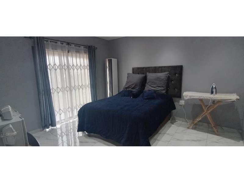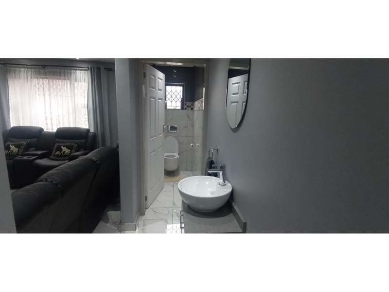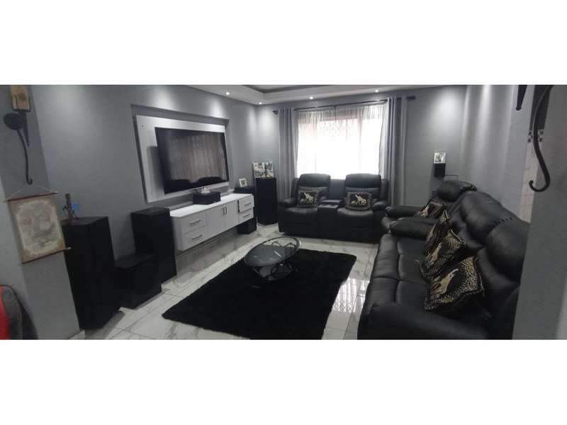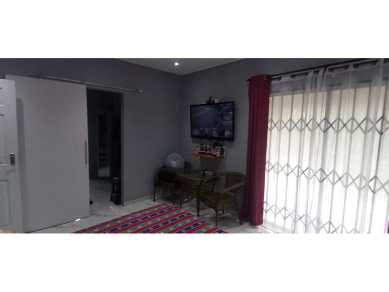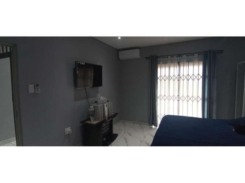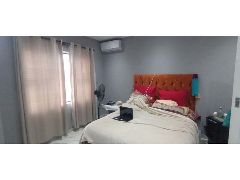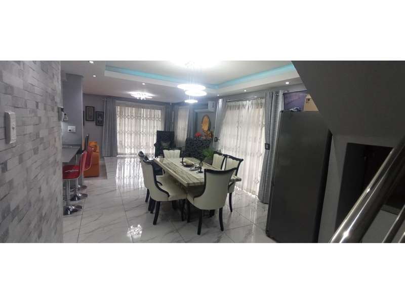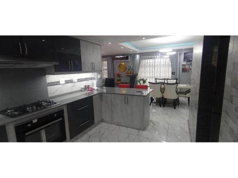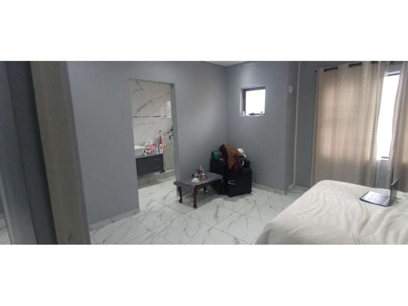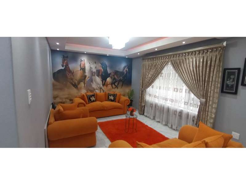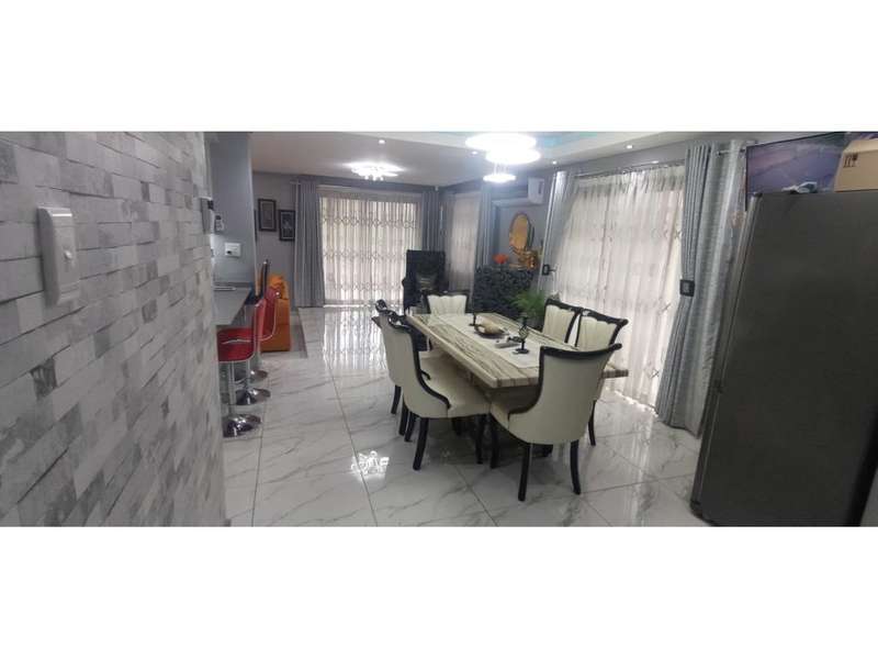 Looking for a beautiful and spacious four-bedroom double-story house? Look no further! This lovely property has two entrance areas that lead to a private lounge, dining room, and open-plan kitchen with a scullery. You'll also find a music and TV lounge with a built-in TV and bulkhead calling with channeling x6 (2 with Bluetooth) downlighters, air-conditioners, and strobe lights. This house is equipped with all the modern amenities you need, including a 5.5 KVa inverter and jojoTank, as well as quartz surfaces on all countertops in the kitchen and bathrooms. There are five air conditioners in total, including two downstairs and three in the bedrooms. Upstairs, you'll find four bedrooms, each with a walk-in closet and an ensuite shower wash base on a floating cupboard with quartz countertops. For added security, there are trailer doors on both the upstairs and downstairs entrances and all windows are sand-blasted. The main house has a bulkhead ceiling with chandeliers x6 (2 with Bluetooth), downlighters, and air-conditioners, with beautiful wallpaper in the kitchen and private lounge. There's also a built-in braai stand, an excellent drainage system, and a security camera monitoring system on-screen upstairs and downstairs. The property is surrounded by a boundary wall with double gates motorized and electric fence, a double garage with a motor, a double carport on the two flatlets and the main house, and an entertainment area. Two additional 3-bedroom flats with lounge, open plan kitchen dining room, shower and toilet, washing basin, and prepaid electricity complete this impressive property.