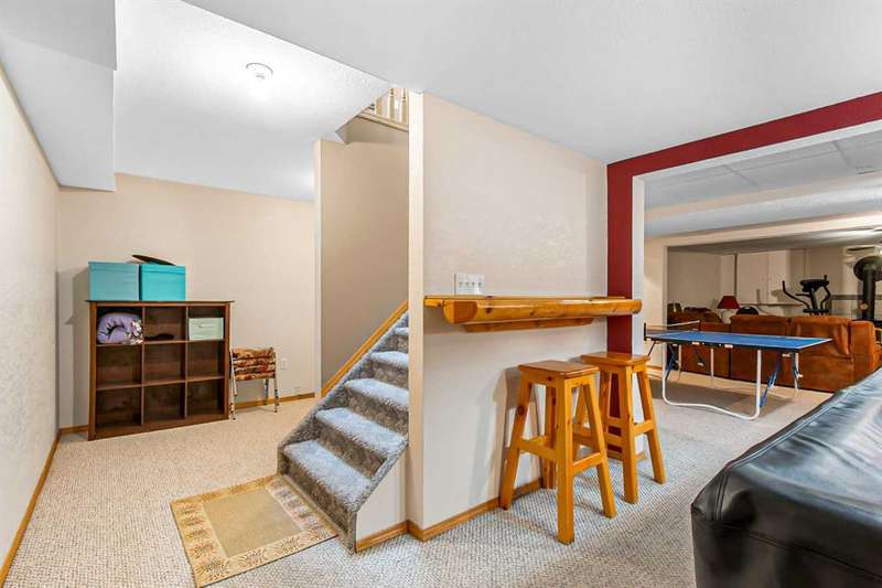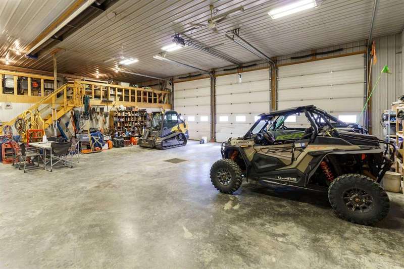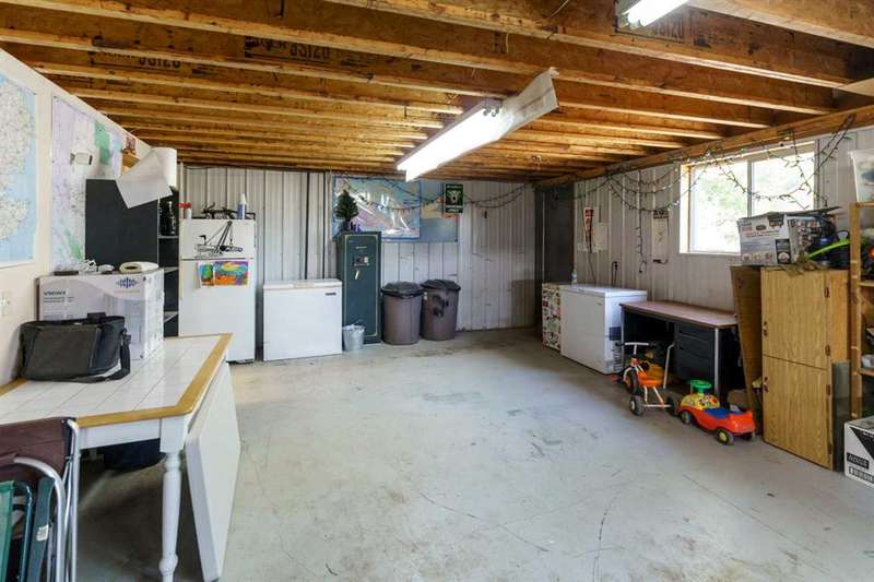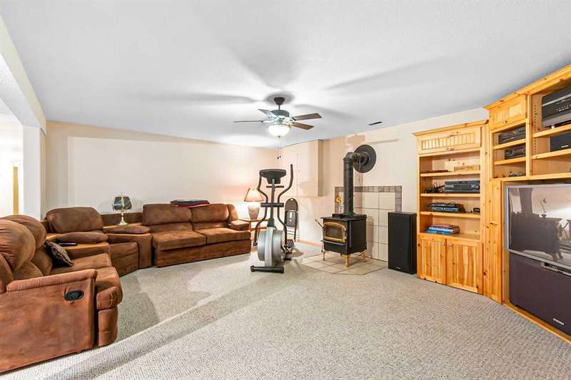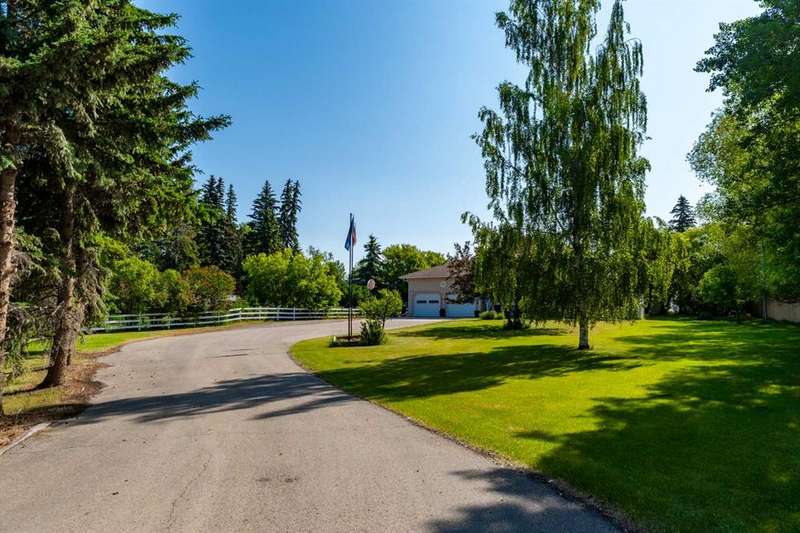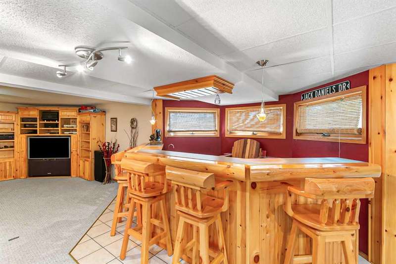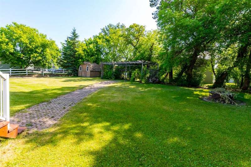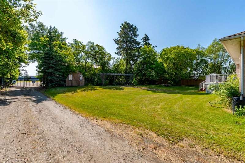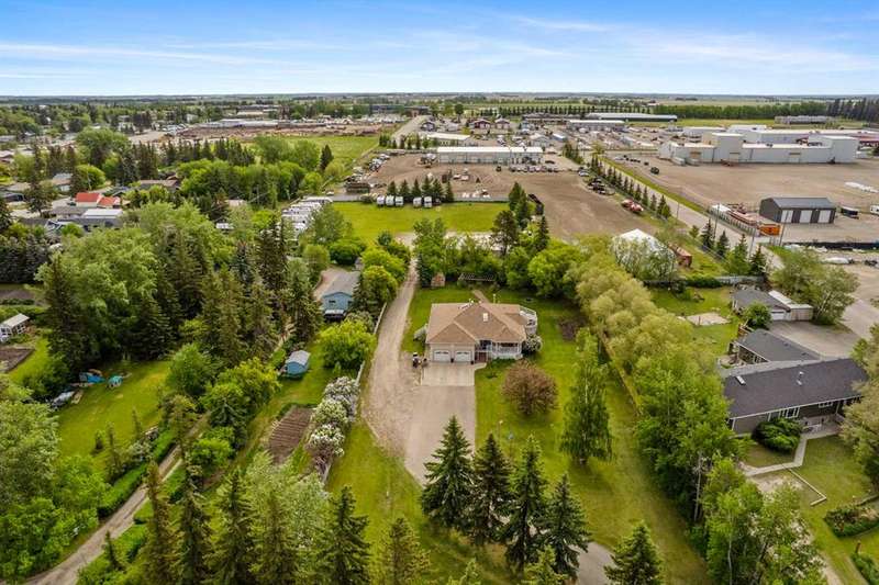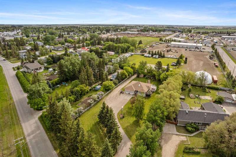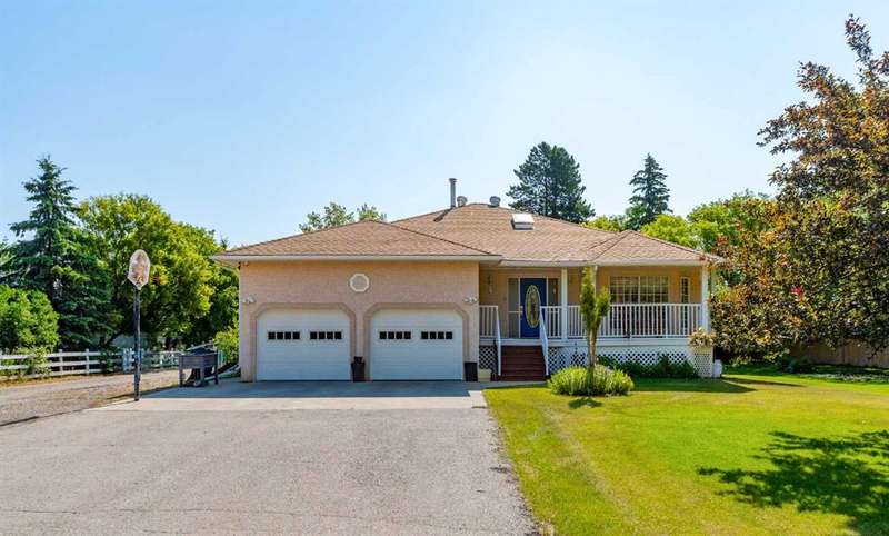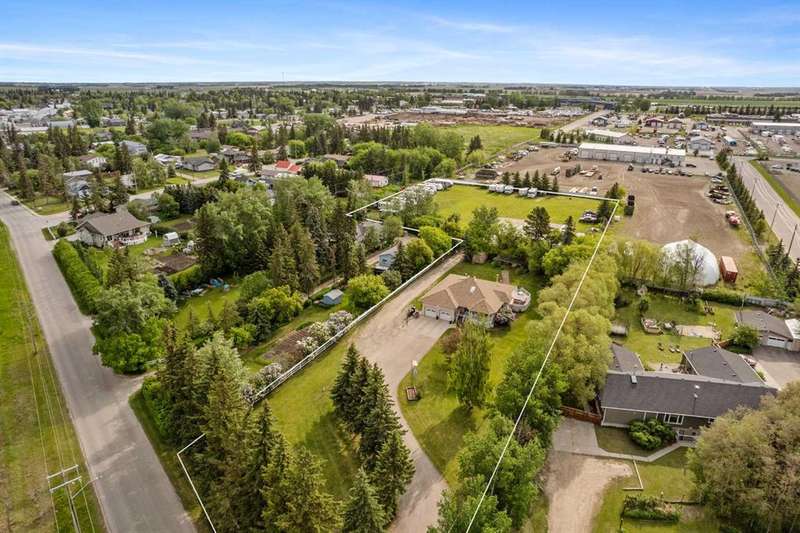 Tucked away on a spacious 2.61-acre lot within the Town of Olds, this unique property offers the privacy and freedom of country living—without giving up town services. With mature trees, a well-laid-out bungalow, and an incredible 2,496 sq.ft. (40' x 60') heated shop with an addition, this property is ideal for families, hobbyists, or anyone needing space for projects or equipment. The 1,755 sq.ft. bungalow, built in 1992, features 5 bedrooms and 3 full bathrooms, including a spacious primary suite with large closets and a 5-piece ensuite. Numerous recent updates—including new windows, updated shingles, and brand-new garage doors—offer peace of mind and curb appeal. Inside, the main level welcomes you with a sunken living room and a central kitchen outfitted with solid oak cabinetry, a large pantry, Corian countertops, and an appliance garage. A breakfast bar and cozy dining area flow into the family room with built-in shelving and a natural gas fireplace. A 4-piece bathroom, laundry area, and two additional bedrooms complete the main floor. The fully finished basement was designed for entertaining: a wet bar, games area, family room with wood stove and built-in TV center, two more large bedrooms, and another full bathroom offer plenty of space for gatherings and guests. The home is serviced by a boiler system with in-floor heat, a forced air furnace and a newer hot water tank. Step outside to your private 1.06-acre yard, surrounded by trees and fully fenced with a secure gate. The covered front porch and southeast-facing Duradeck rear deck (complete with a hot tub*) offer plenty of outdoor space to relax. Apple, plum, and lilac trees add a charming touch. At the back of the property sits a massive 40x60 heated shop, perfectly positioned on a flat, open 1.55-acre section of the lot. Three 12' wide x 14' tall overhead doors provide access, including one extended 48' bay for RV or camper storage. Inside, you'll find a concrete floor with a large sump drain, its own 100-amp service, 220V welder plug, multiple outlets, and a 16'x40' mezzanine. Below the mezzanine, a rear bay with in-floor heat and a smaller overhead door creates the perfect space for a man cave, garden tools, or a project car you’d rather keep dust-free. This hidden gem offers quiet living with pavement right to the door, tons of parking, security cameras throughout, and the freedom to run a home-based business—all within town limits and fully connected to municipal water and sewer. It’s a rare opportunity to enjoy the space of an acreage and the convenience of town living.
