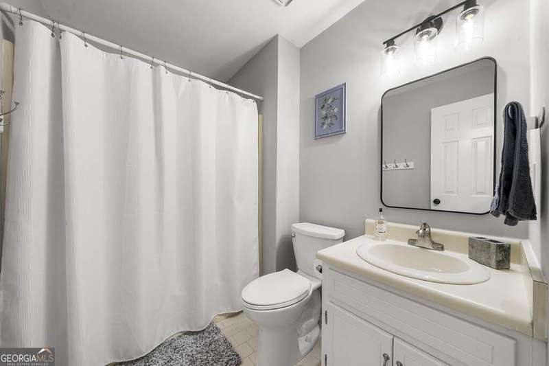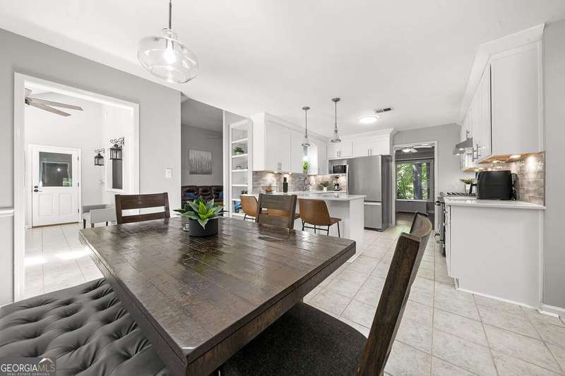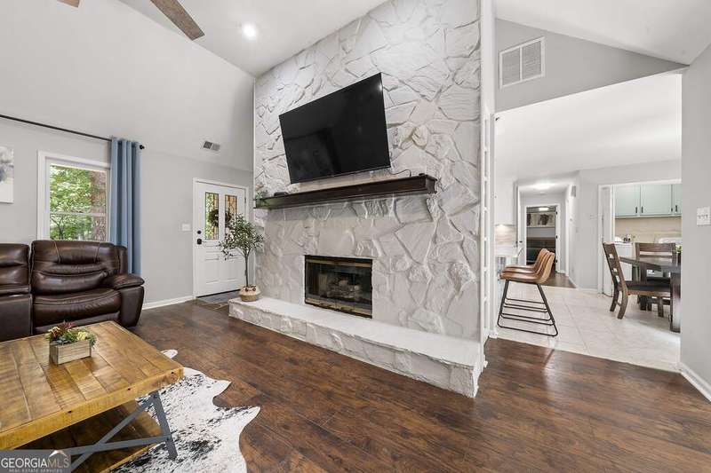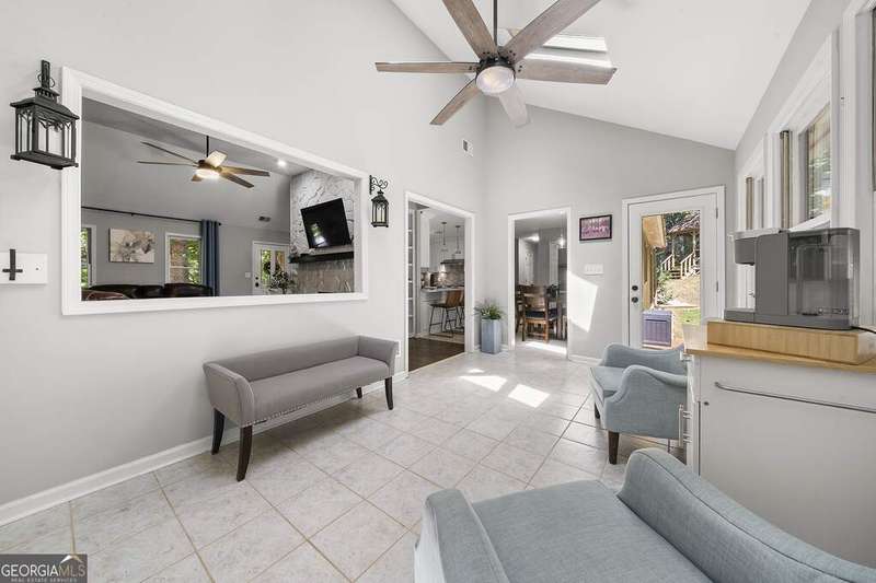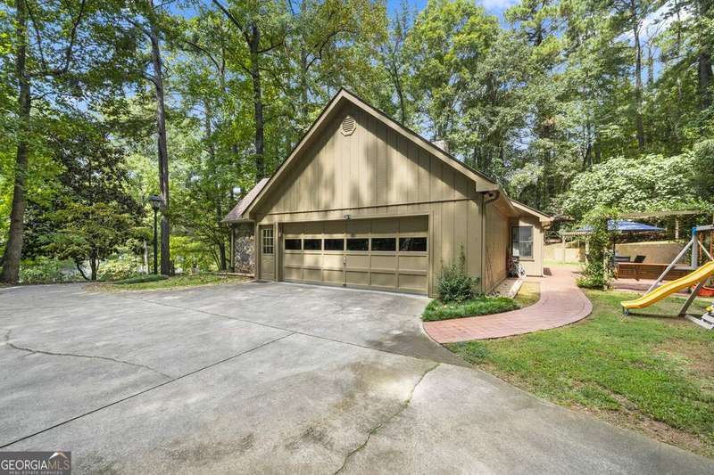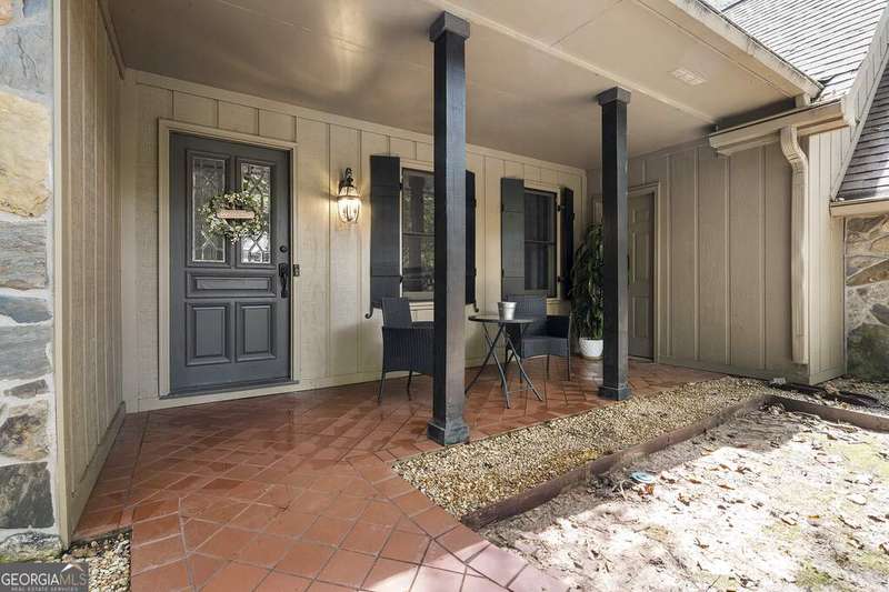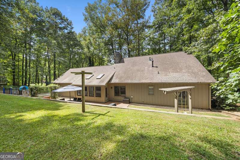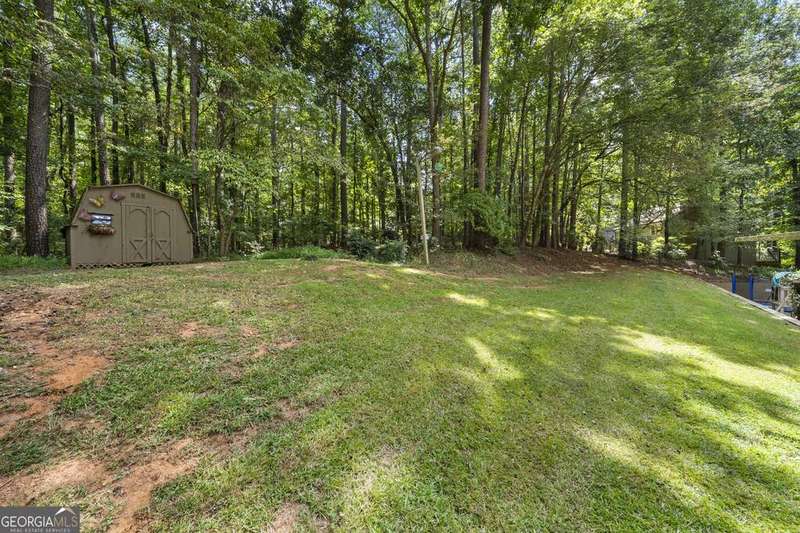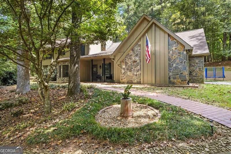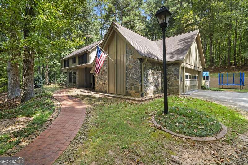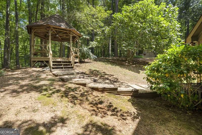 Welcome to this inviting home tucked among the trees in the wonderful community of Tyrone! Charming standalone lamp posts frame the front, while the spacious porch is perfect for enjoying your morning coffee. Step inside to find the vaulted family room with fireplace just to the right of the entry, and the dining room (also ideal as a home office) to the left, both with serene views of mature trees. The updated kitchen features crisp white cabinetry, stainless steel appliances including a gas range, under-cabinet lighting, and a classic tile backsplash. A cozy den filled with windows overlooks the backyard, while down the hall you'll find an updated half bath and the main-level primary suite. The primary bedroom includes a walk-in closet and an en suite bath with a dual sink vanity, a large whirlpool tub, and a separate shower. Upstairs offers two comfortably sized bedrooms and a full bath. Step outside to discover a backyard designed for relaxation and entertaining with a tiled patio, freestanding swings, a gazebo with seating, a terraced yard, and a storage shed. The oversized attached garage provides a workbench and sturdy built-in shelving for all your storage needs. Conveniently located just minutes from shopping, dining, and parks, with easy access to the Atlanta airport, this home combines privacy, comfort, and convenience. Don't miss the video tour!