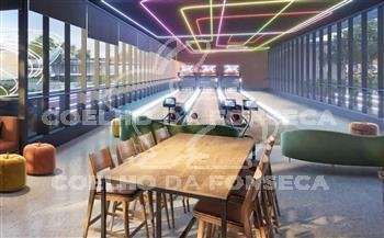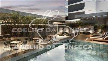 Apartamenro com Hall social privativo; Living (Estar e jantar); Lavabo; Cozinha; Terraço gourmet; WC de serviço; Terraço de serviço; 2 suítes, sendo a suíte master com terraço.