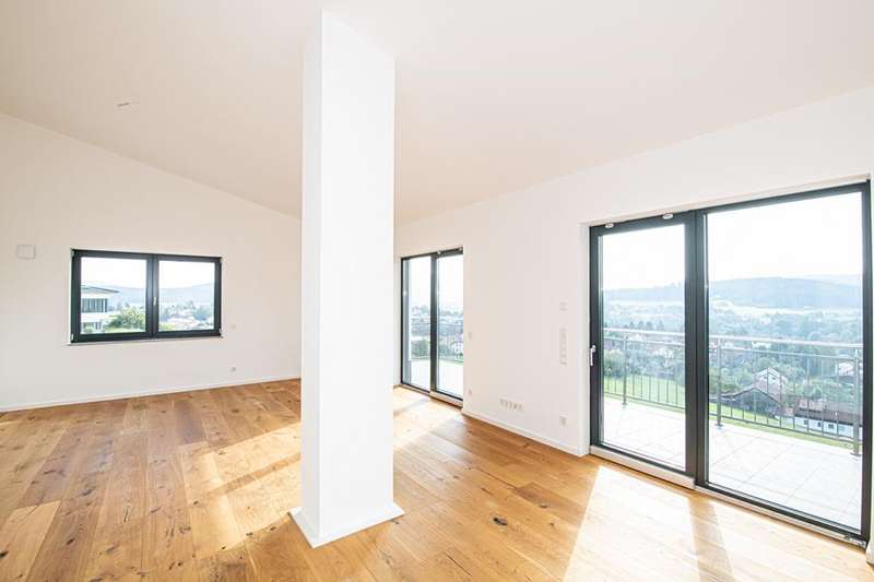 By fall 2023, six new condominiums will be built to the KfW 55 EE standard in Bad Kötzting's absolute best location in the coveted residential area "Am Schinderbuckel", some with unobstructed views. Construction is now well advanced; arrange a viewing appointment with us and see for yourself on site. The architecture is modern, bright and friendly. Appealing color schemes and clear shapes, high-quality materials in combination with clear lines and a lovingly thought-out, exclusive room layout create a unique living feeling. The approx. 115 m² 4-room apartment on the first floor can be reached at ground level directly from the building entrance via the staircase. The apartment has the following rooms: Daylight bathroom with shower and toilet, 3 bedrooms, storage room and the bright, light-flooded living / dining and cooking area. Impressive is the balcony with a wonderful panoramic view, which rounds off the entire living concept. If desired, a fireplace or pellet stove can also be installed; a centrally located chimney is already available. All living units are equipped with underfloor heating. From a pre-selected assortment, the materials for the interior finishing (tiles, parquet or vinyl flooring, interior doors and sanitary objects) can still be individually sampled according to your ideas. For shading, electrically operated Venetian blinds will be installed. The sanitary objects are purchased from well-known manufacturers such as Grohe or Geberit. The heat is generated energy-efficiently via an air/heat pump. In the entire residential complex, great importance is attached to energy-saving construction methods. Examples include the aluminum windows with triple thermal insulation glazing, the solid brick construction (stone on stone) and the decentralized ventilation of the living space. The purchase price already includes an outdoor parking space.