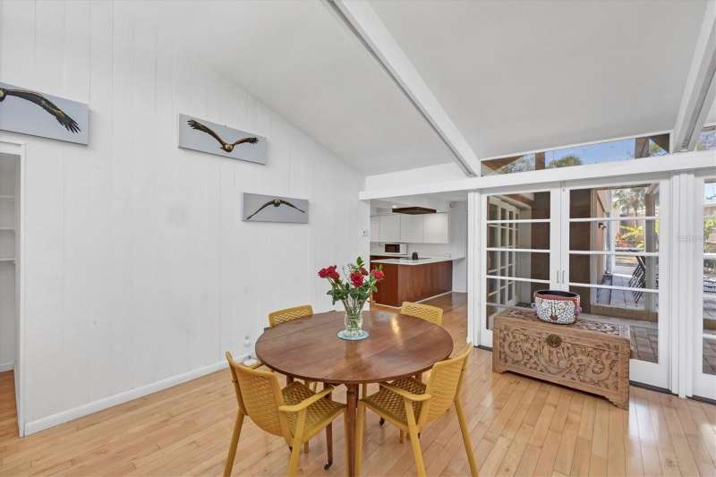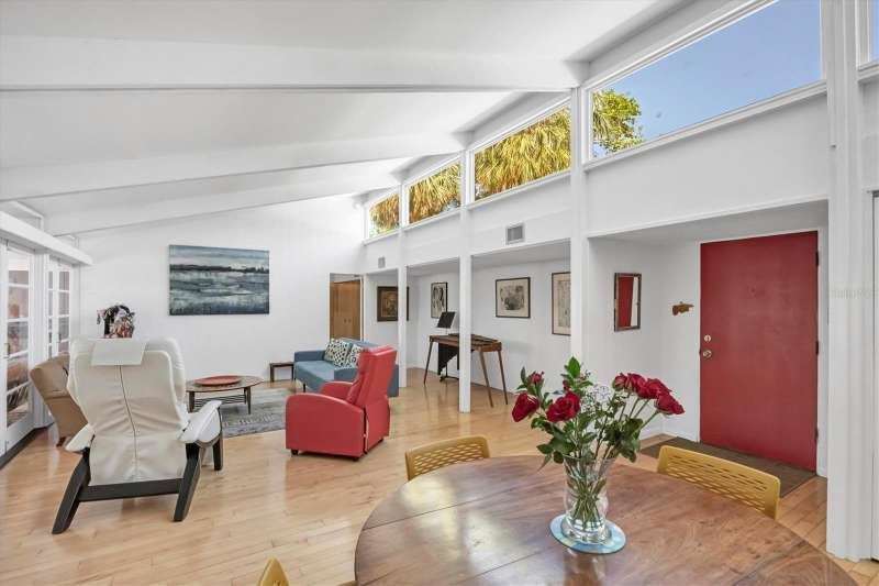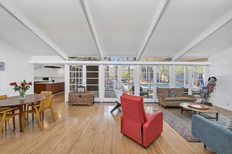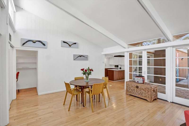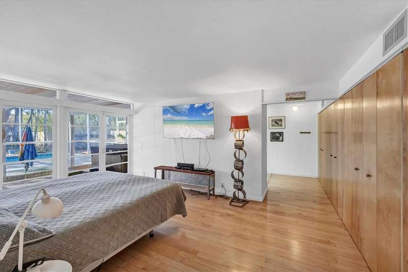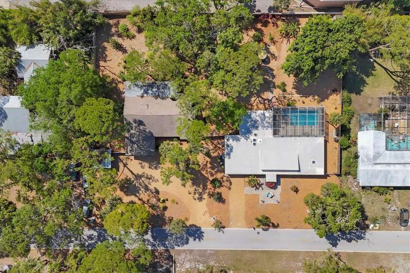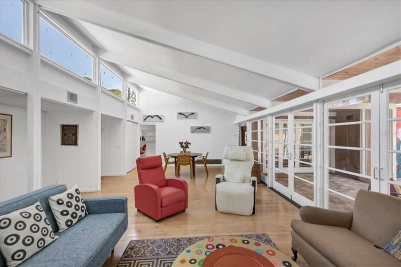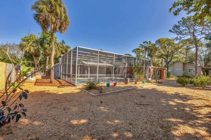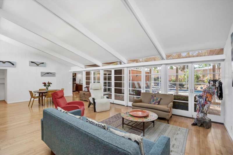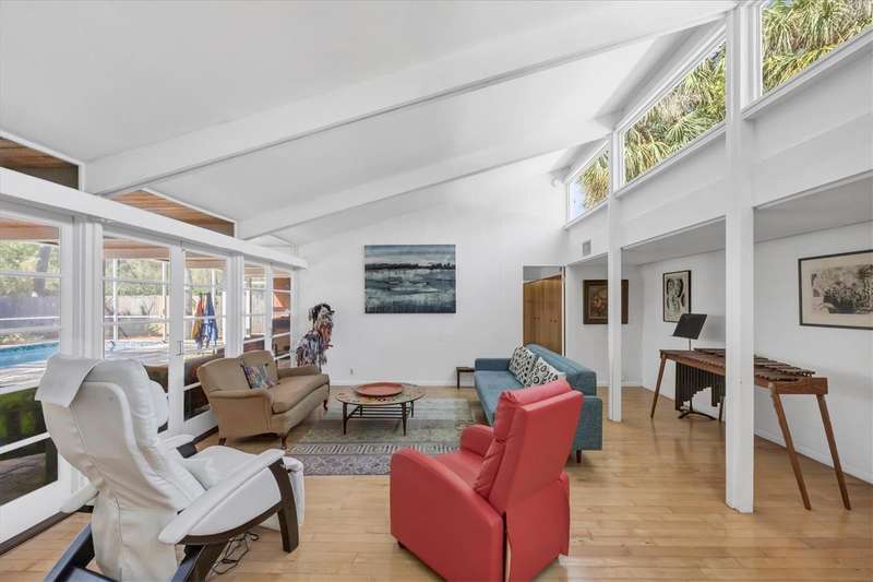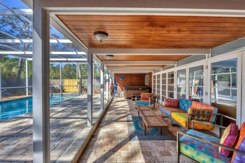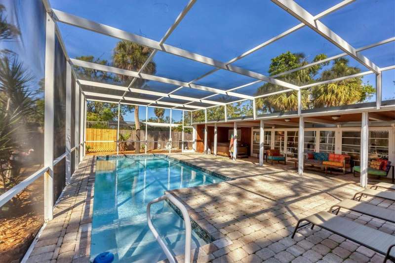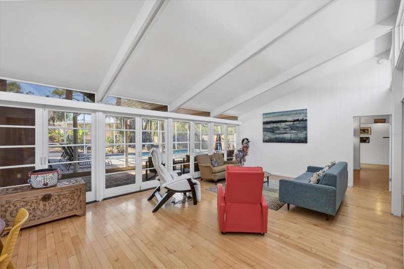 "WEST OF TRAIL" THE SELLER IS MOTIVATED. BRING OFFERS. PRICED BELOW FEB APPRAISAL. Discover this stunning home, showcasing the best of mid-century architecture. Situated on an expansive 100 x 170 lot, the grounds are adorned with fruit trees and lush landscaping. The large open living room features clerestory windows, with backyard and pool views through all glass doors. There is a small office nook as well. The 40x10 lanai, heated screened pool, and hot tub offer a relaxed and enjoyable outdoor space, as do the large front and back yards. There is gorgeous wood flooring throughout. The primary bedroom boasts a wall of closets, a beautiful pool view, and a distinctive large bathroom with unique shower featuring tile and glass block. The second and third bedrooms are designed as a separate suite featuring privacy and and extra storage. The open kitchen, enhanced by a skylight and pantry, is both spacious and inviting. The studio/library, illuminated by cove lighting, includes built-in shelving and a lovely backyard view and could easily be converted to a 4th bedroom. The home has a propane driven whole house generator, mostly hurricane impact windows and hurricane shutters as needed. The home abuts the 100 acre New College campus affording huge greenspace views and trails. It is just down the street to the Sarasota Bayfront for breathtaking sunsets, and abundant bird and marine life viewing . The Ringling Museum and Asolo theater are minutes away. Don't miss this opportunity to make this extraordinary home your own.