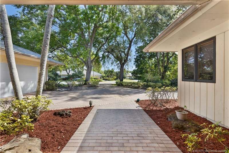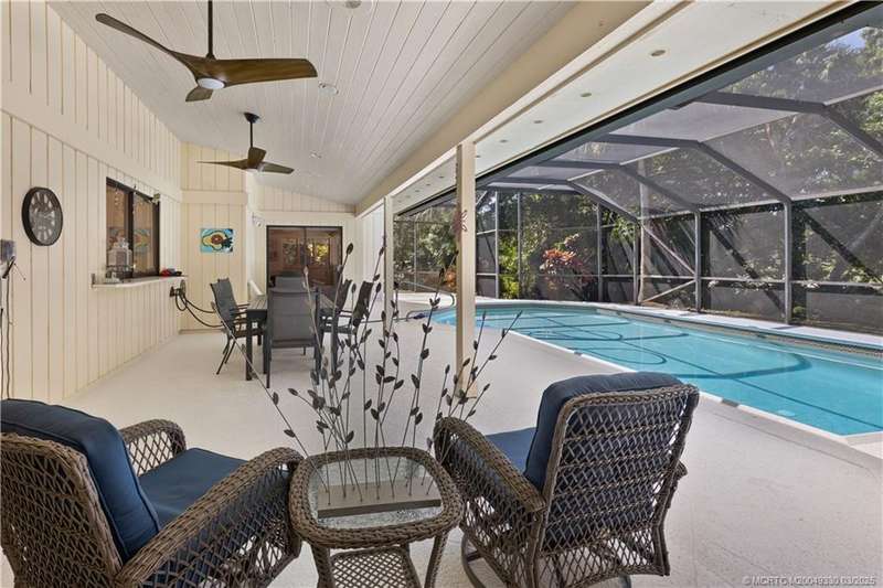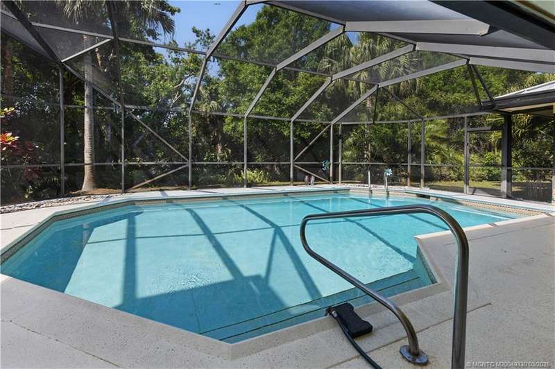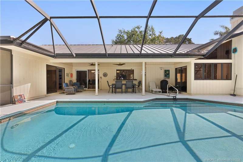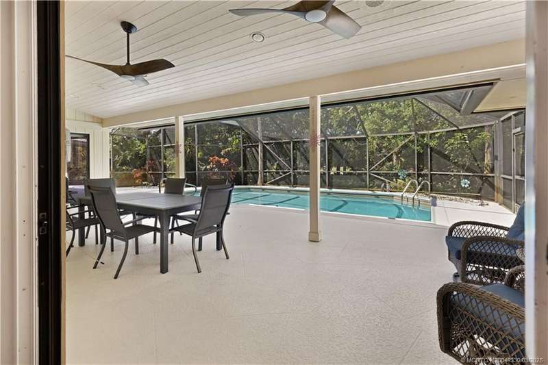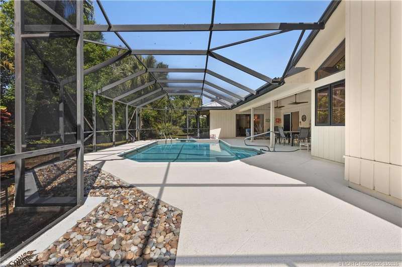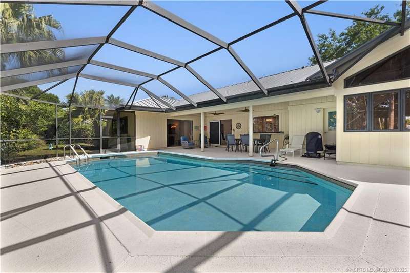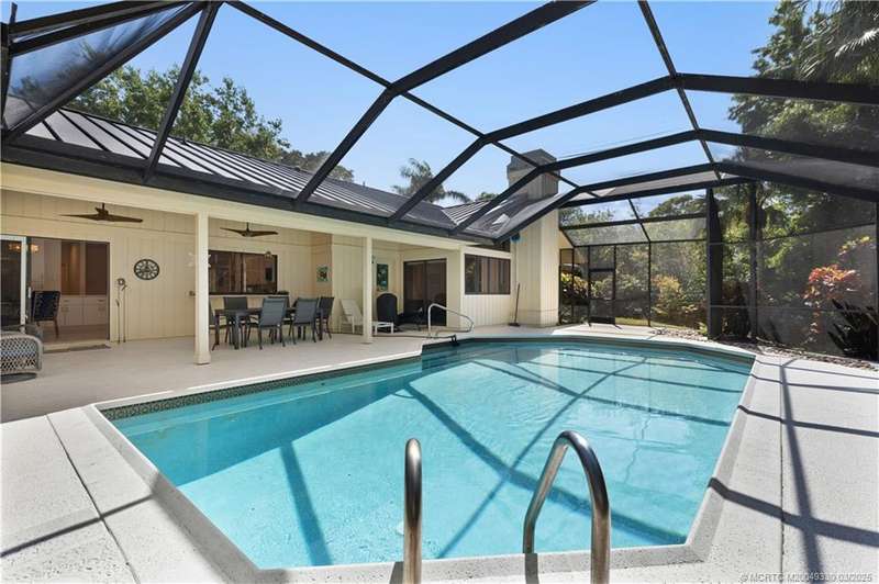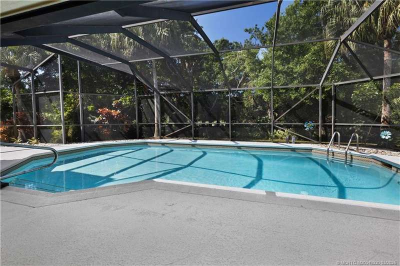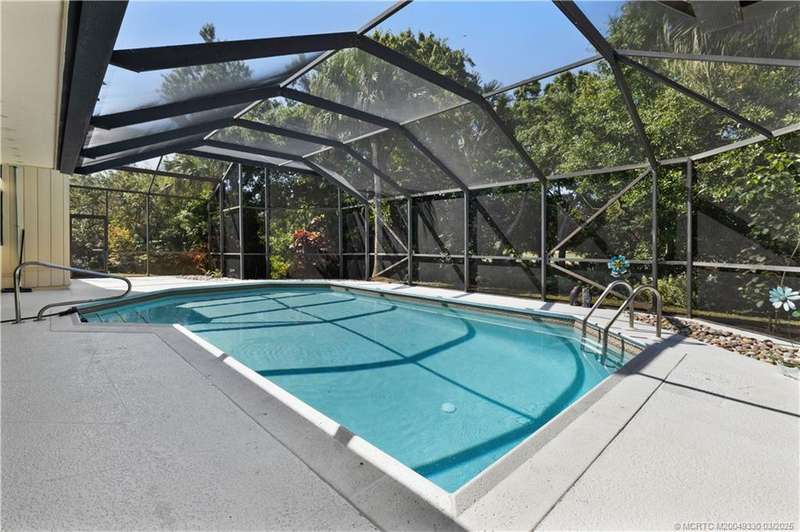 Welcome to 6221 SW Thistle Terr, a stunning custom home on a quiet cul-de-sac in the prestigious Pipers Landing Yacht & Country Club. Just steps from the golf course & clubhouse, this home offers a perfect blend of luxury & comfort. The impressive living room features soaring cathedral ceilings & a cozy fireplace, while the fully renovated kitchen boasts quartz countertops, stainless steel appliances, a wet bar, & a wine cooler. The split floor plan includes a spacious master suite, two guest bedrooms with en-suite baths, & a versatile fourth bedroom ideal for an office. The dining room can also serve as a den or media room. Step outside to a large screened lanai with a heated pool and cabana bath, all on a private 0.8-acre lot with green views. Additional highlights include elegant window treatments, an oversized laundry room with a work sink, a two-car garage, and a dedicated golf cart garage. Experience luxury living in a serene setting—this home is the ultimate Florida retreat!