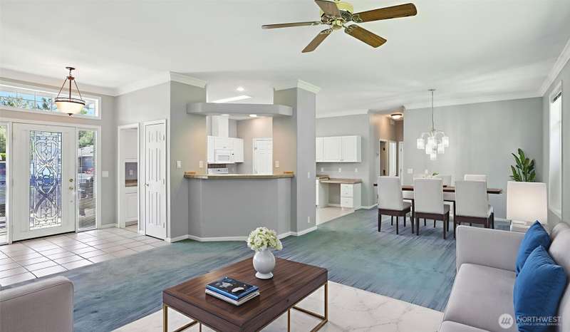 Welcome to the gated adult 55+ community of Golden Valley! This well-cared for 1775sf home is situated on a prime lot with great street appeal. A gardener's delight with rose arbor, raised garden beds, and vibrant colors creating an inviting atmosphere with a private backyard setting. Features include a very welcoming covered front porch, 10' celings and large picture windows providing ample natural light. Designed for entertaining, the spacious kitchen overlooks both the DR and LR. Primary bedroom includes a 5pc bath w/ soaking tub & walk-in closets. Additional 2 BRs, den/office and full common bath. Don't miss out on this nicely maintained home with new roof, hardieplank siding, heat pump and newer hot water tank.