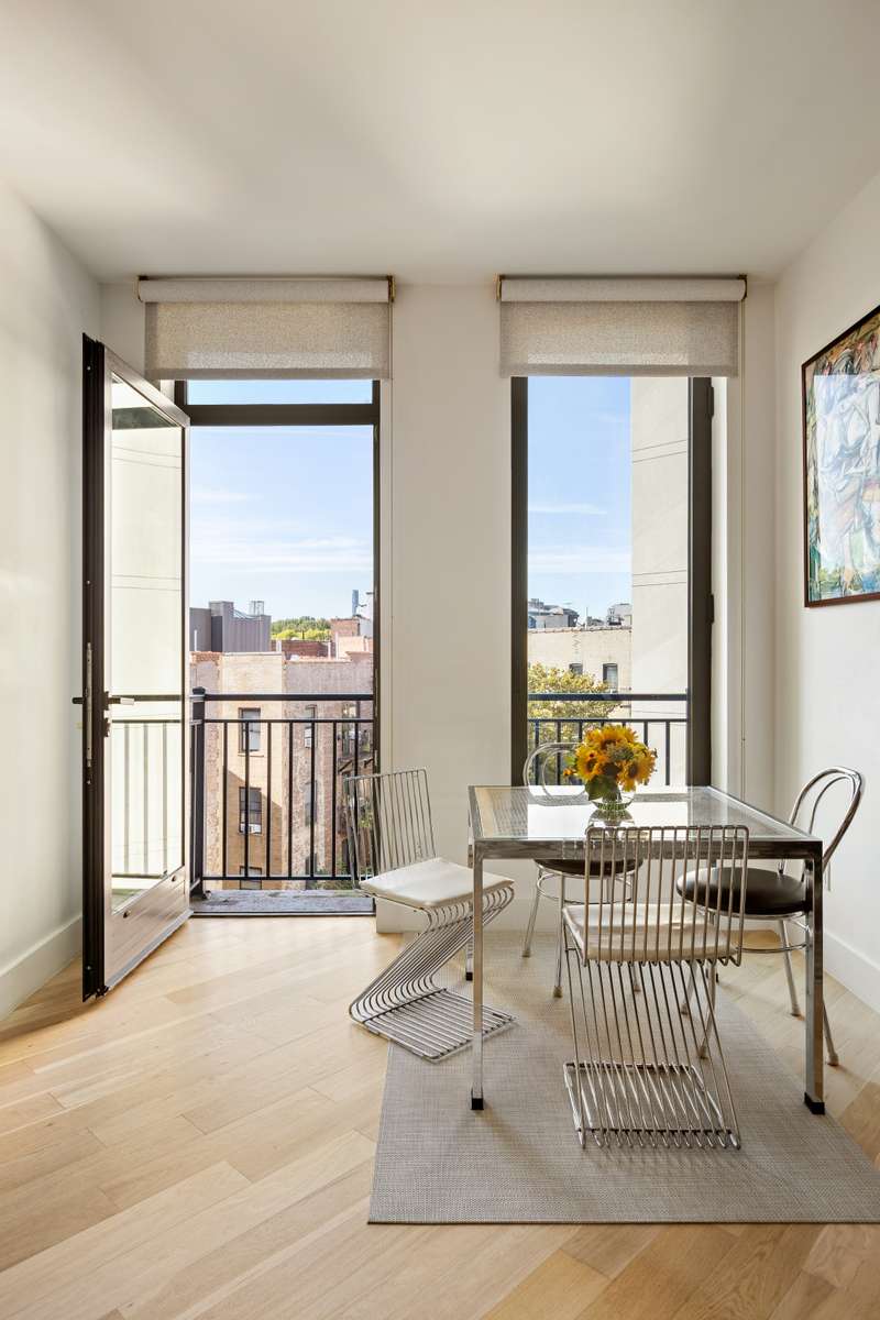 Upon entry, you're welcomed into a bright and airy space with impressive ceiling heights, oversized north-facing windows adorned with custom shades from The Shade Store, and wide-plank white oak flooring that adds warmth and elegance throughout. The open-concept living and dining area is anchored by a Juliet balcony, inviting in fresh air and natural light while creating an ideal setting for relaxing or entertaining.