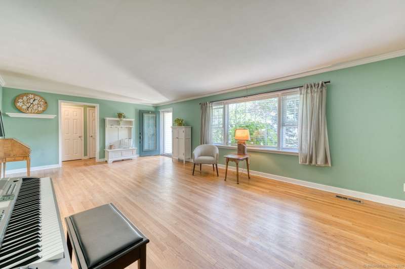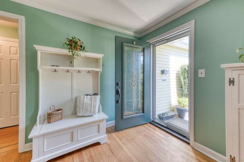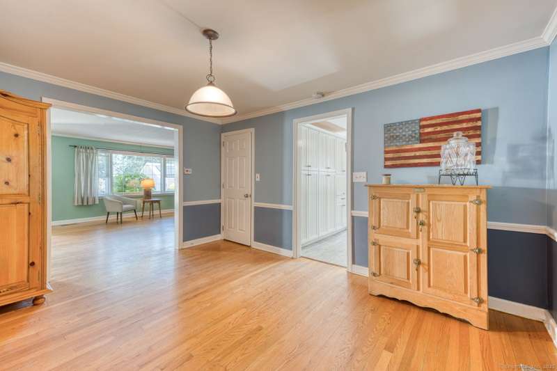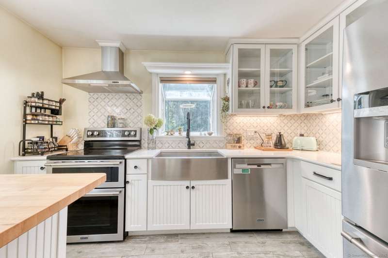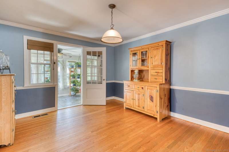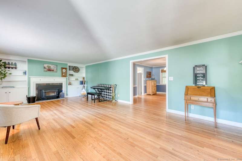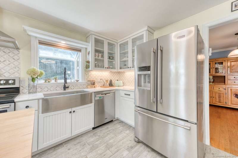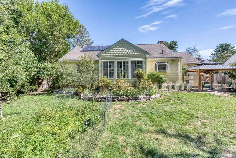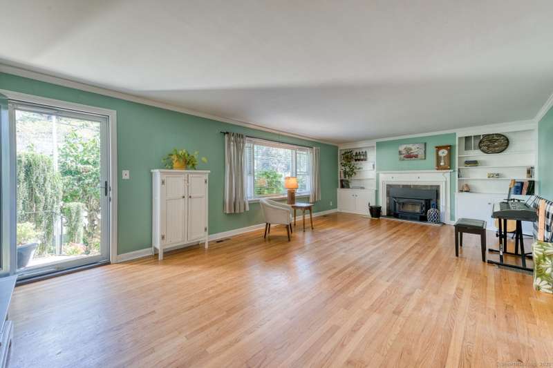 This beautifully remodeled ranch is the perfect fit! The open floor plan features a stunning custom kitchen with abundant cabinet storage, stainless steel farm sink and movable island. The spacious, light-filled living room includes a cozy fireplace with insert, built-in bookshelves, and a charming bay window. The dining room, conveniently located off the kitchen, is ideal for everything from an intimate dinner for two to hosting a larger gathering. Enjoy your morning juice or coffee or evening beverage in the sunroom overlooking the garden. Two comfortable bedrooms and a full bath complete the main level. Don't miss the beautiful hardwood floors throughout! Downstairs, you'll find even more living space-a large den or flex room, laundry area, music/media room, additional full bath, storage room, and utility space. Step outside to a backyard designed for relaxation and entertaining, with a patio and pergola perfect for gatherings, or plant your own garden and enjoy the harvest. Nestled