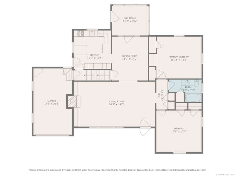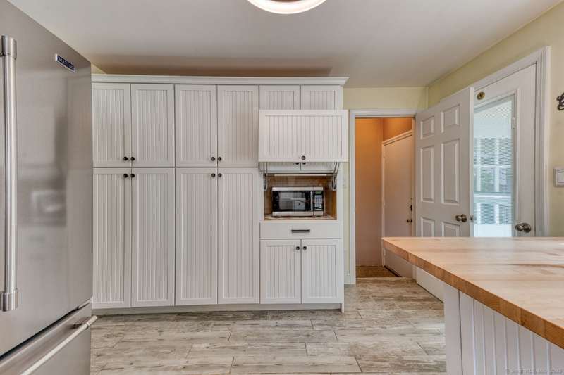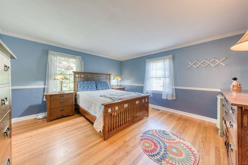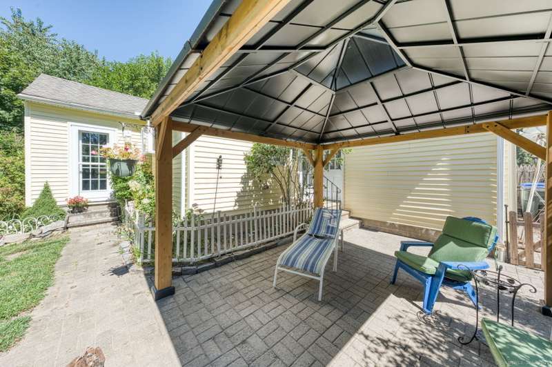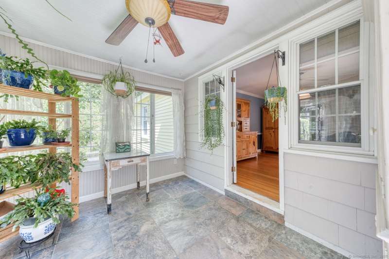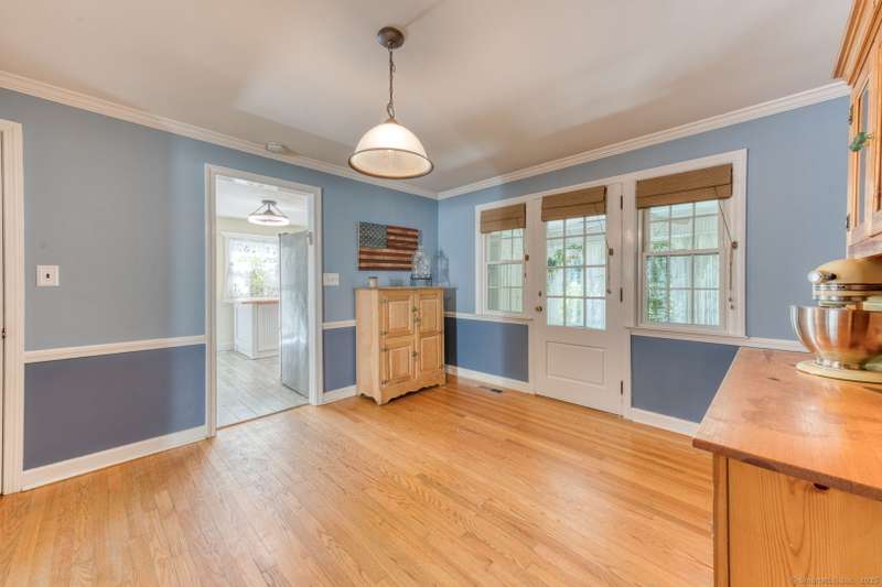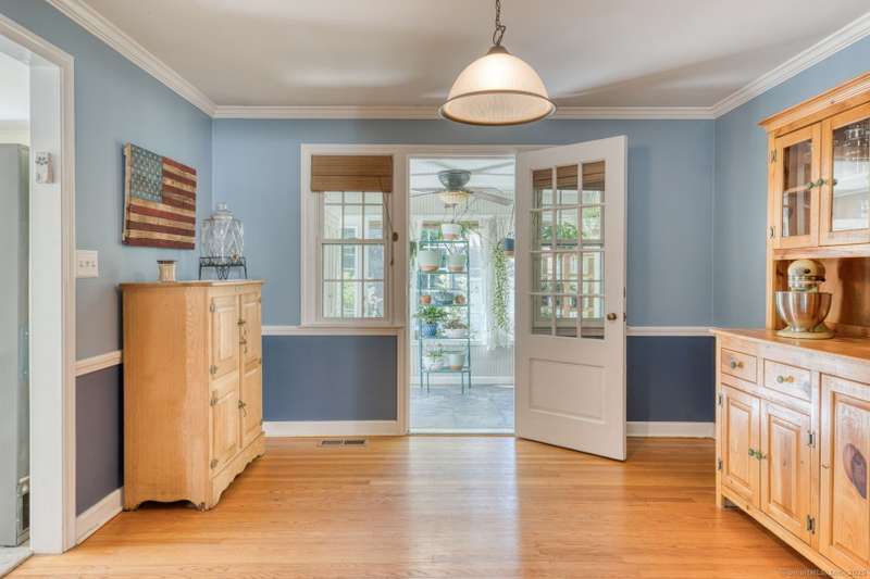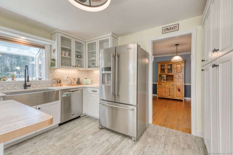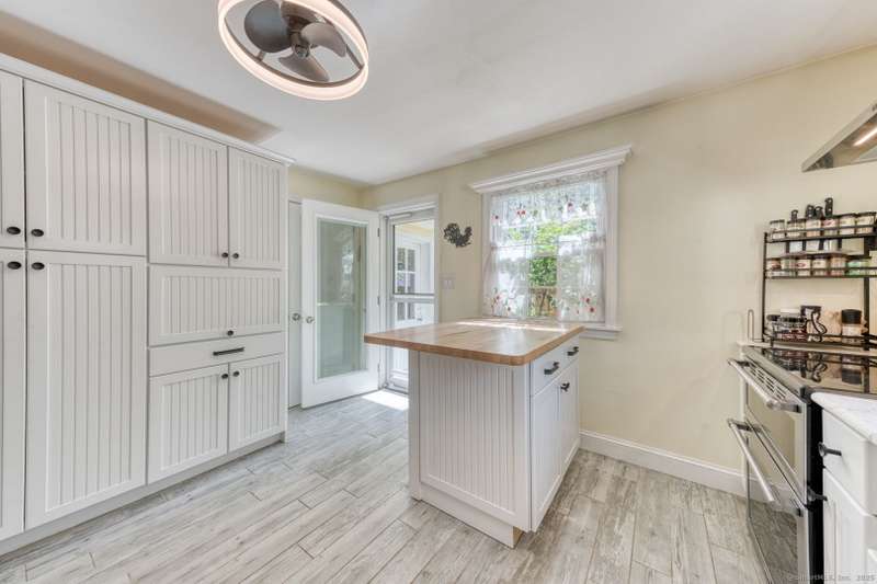 This beautifully remodeled ranch is the perfect fit! The open floor plan features a stunning custom kitchen with abundant cabinet storage, stainless steel farm sink and movable island. The spacious, light-filled living room includes a cozy fireplace with insert, built-in bookshelves, and a charming bay window. The dining room, conveniently located off the kitchen, is ideal for everything from an intimate dinner for two to hosting a larger gathering. Enjoy your morning juice or coffee or evening beverage in the sunroom overlooking the garden. Two comfortable bedrooms and a full bath complete the main level. Don't miss the beautiful hardwood floors throughout! Downstairs, you'll find even more living space-a large den or flex room, laundry area, music/media room, additional full bath, storage room, and utility space. Step outside to a backyard designed for relaxation and entertaining, with a patio and pergola perfect for gatherings, or plant your own garden and enjoy the harvest. Nestled