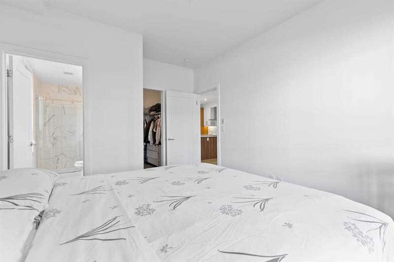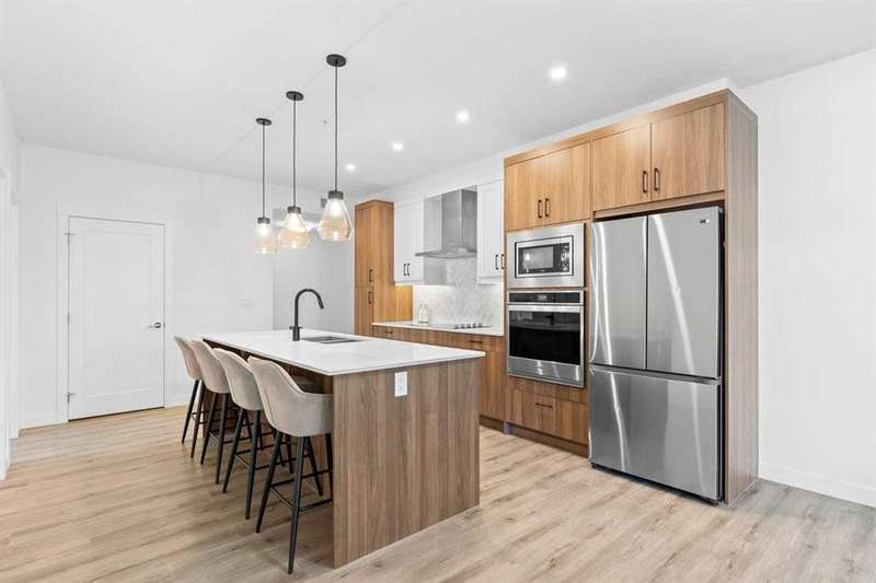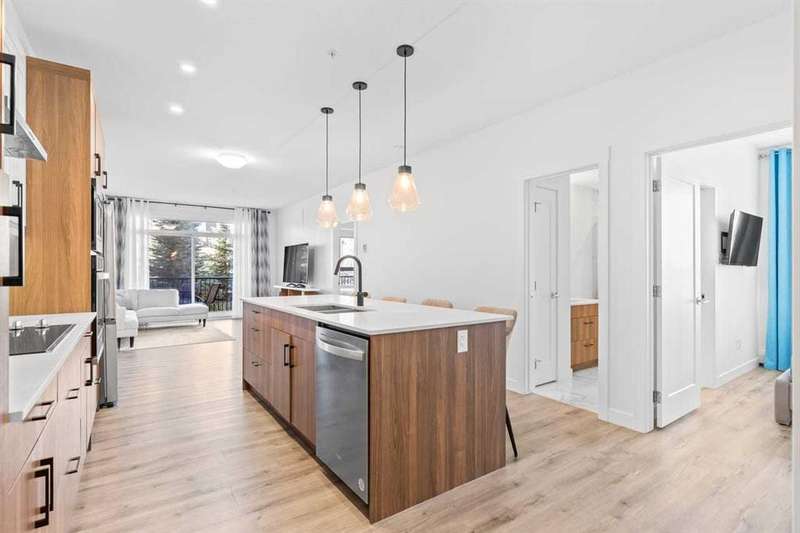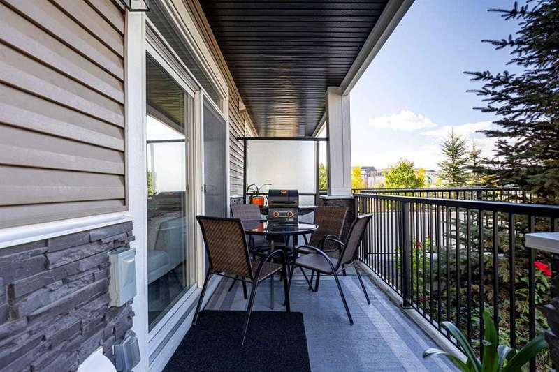 Looking for space + style? This 958 sq. ft. 2 bed/2 bath condo in Walden has tons of upgrades, 2 parking stalls, and a private deck with gate to green space. A true gem in the heart of the community! The unit can be accessed either through the main building entrance or via its own private ground-level entrance. The kitchen and bathrooms showcase custom tilework along with quartz island that comfortably seats four. A chimney-style range hood, counter-depth fridge, smooth cooktop, granite sink, pot lights, and under-cabinet lighting complete this stunning kitchen. The primary bedroom easily fits a king-sized bed and nightstands, and connects to a large walk-through closet leading to a beautiful ensuite with a frameless glass shower, quartz countertops, two sinks and built-in cabinetry. The second bedroom fits a kingsize bed too and offers direct access to the main 4-piece bath. The heated underground stall is conveniently located near the entrance and direct access to the assigned storage locker. With its rare floor plan, extensive upgrades, and unbeatable outdoor space, this condo is truly a gem in family friendly Walden.