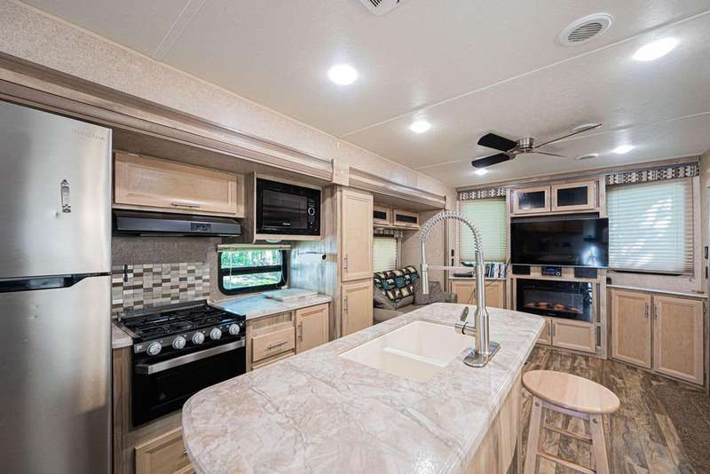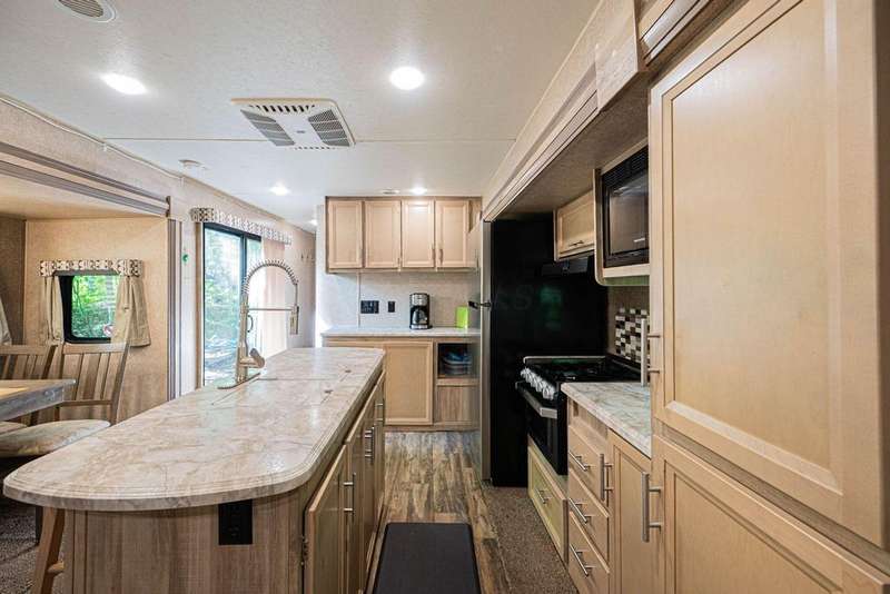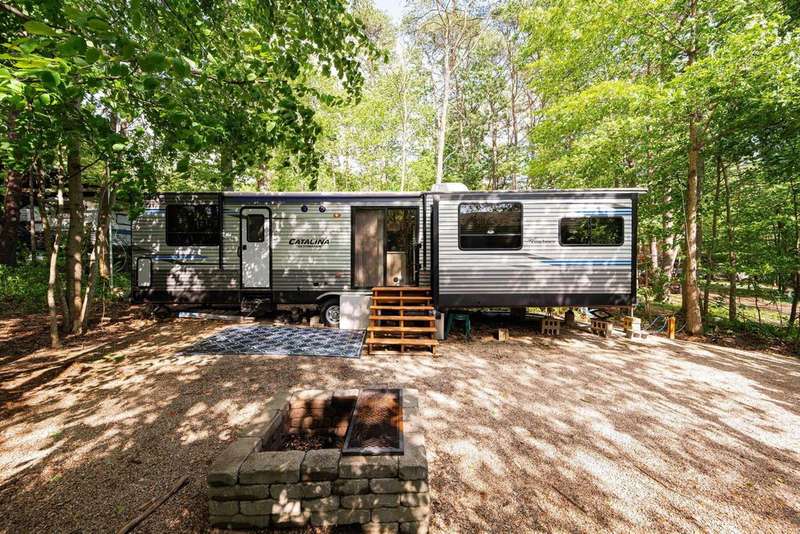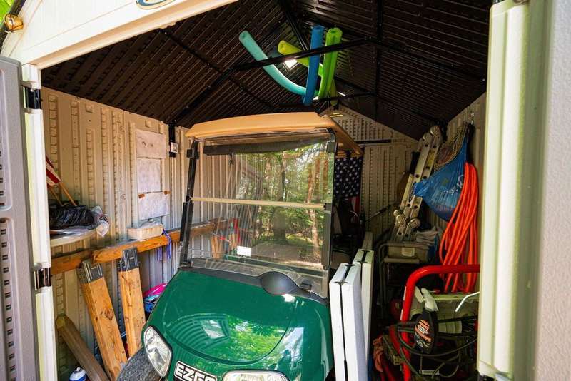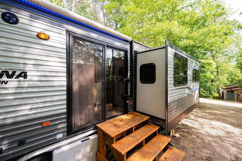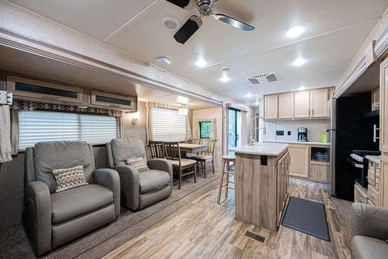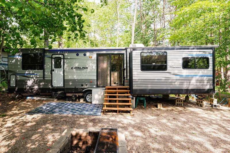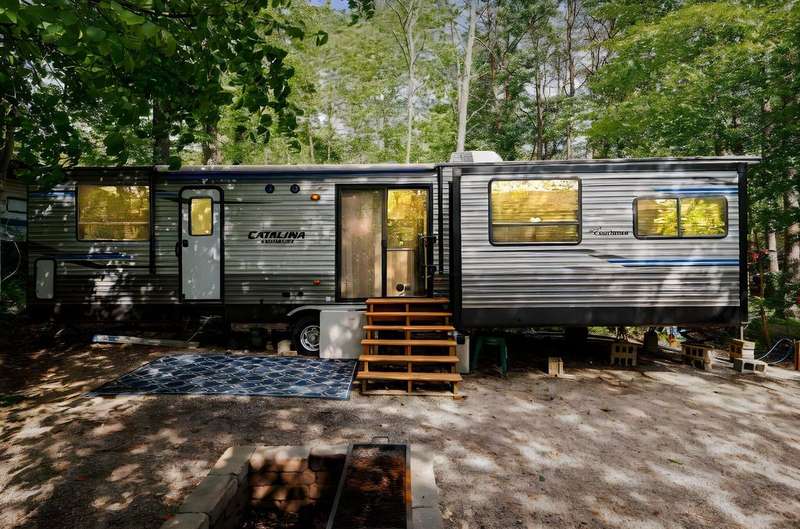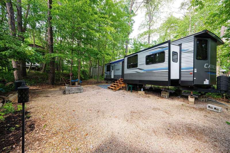 Own a slice of paradise in Hocking Hills with this well-appointed 32' 2019 Coachman Catalina Destination Series, perfectly situated in Lost Hollow Campgrounds. This seasonal retreat comfortably sleeps four adults and includes a king-size bed, fold-out couch, two recliners, a smart TV, and a full-size kitchen with island, dining table, and washer/dryer hookups. Additional features include propane heat, spacious closets, a ceiling fan in the bedroom, and a cell booster for reliable internet. Outside, enjoy your private wooded campsite complete with a firepit, storage shed, and a 2018 Textron EZ-GO RXV golf cart for easy access around the grounds. The automatic awning with LED lighting adds comfort and convenience to your outdoor living space. Lost Hollow offers a wide range of resort-style amenities including two swimming pools, shower houses, laundry facilities, a restaurant, chapel, playgrounds, mini golf, and basketball and tennis courts. With electric, water, and sewage hookups readily available, this turn-key getaway provides the ultimate escape from the hustle and bustle of everyday life. Please note: this is a private, seasonal-use community and rentals are not permitted.