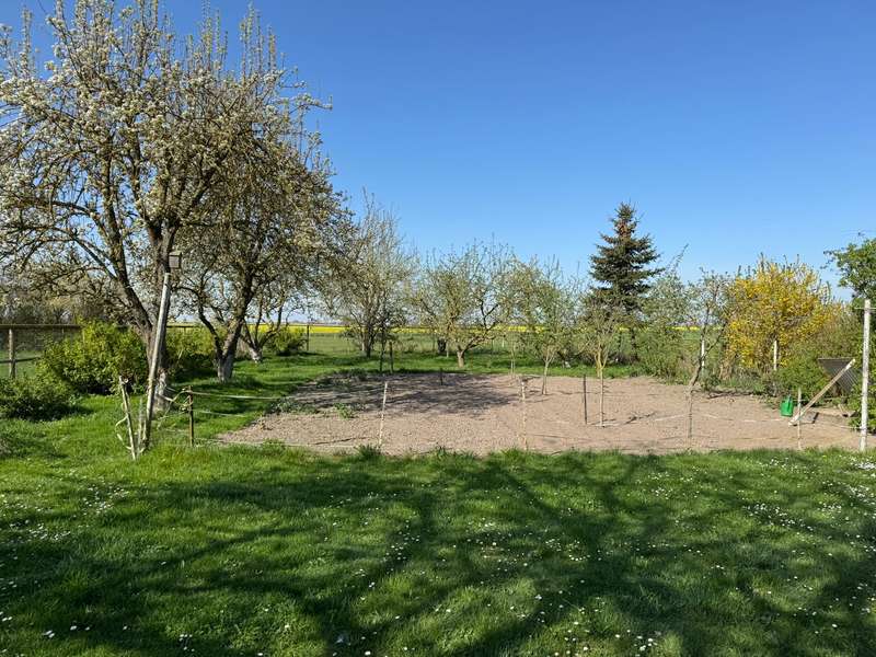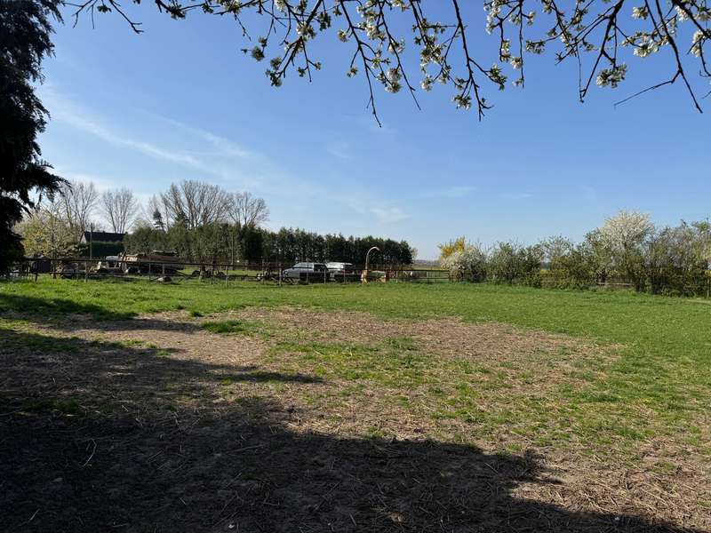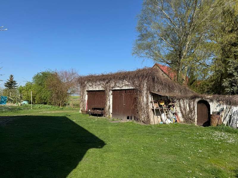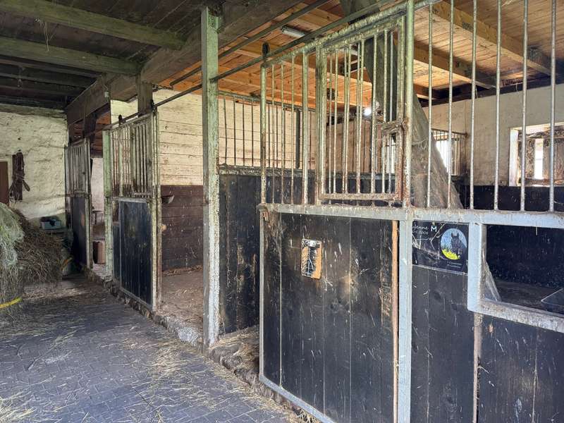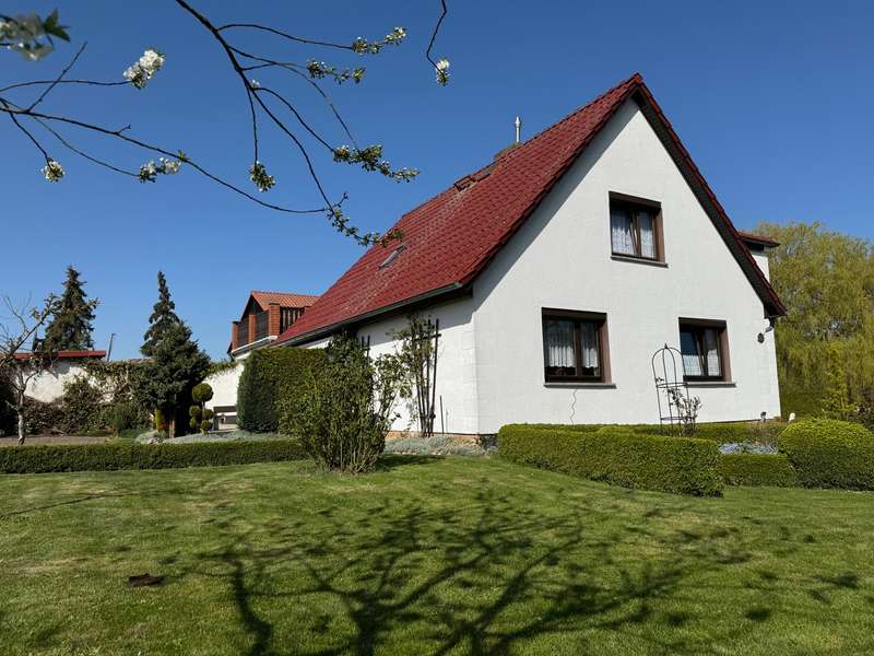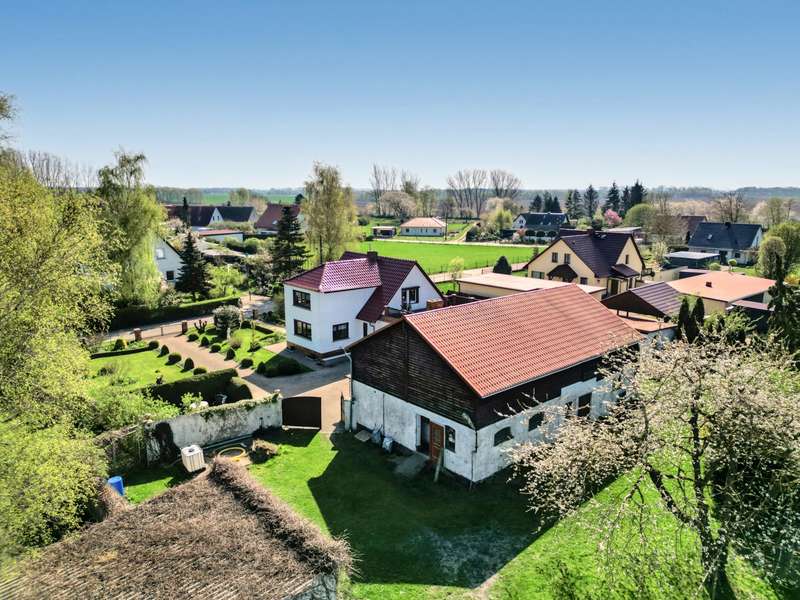 A detached house with a partial basement from 1955 is for sale, situated on a spacious plot of around 3,444 m² - further open spaces can be leased by arrangement. With a living space of around 145 m², the property offers enough space for comfortable living and a variety of uses. The house is very well maintained, which offers potential buyers the opportunity to realize their personal ideas and wishes. The property has been extensively modernized since reunification (including burner oil heating 2022, windows and shutters 1994, roof 1994). The house has a total of four rooms, three of which are bedrooms, providing plenty of space for a family. Two bathrooms (1 bath and 1 shower room) ensure comfort and functionality in daily use. The property also has a spacious veranda on the first floor, a kitchen including fitted kitchen, a hallway and a gallery on the upper floor. One of the three bedrooms on the upper floor offers direct access to a spacious roof terrace. The double garage and a large additional garage offer ample space for vehicles and storage. The barn located in the courtyard (first floor in solid construction; floor area 130m²) and other outbuildings open up a wide range of possible uses, especially for craftsmen, hobbyists or animal lovers. The well-preserved barn has 4 horse boxes and a hayloft, among other things. A private paddock and the possibility of using an adjoining plot of land with a large pond round off the offer for animal lovers. The location of the property offers plenty of space for recreation and outdoor leisure activities. The extensive grounds allow for intensive use of the outdoor areas, whether for agricultural purposes or leisure activities.