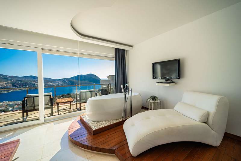 This elegant villa, located in a prime position with stunning sea and mountain views in Kalkan, appeals to those seeking a comfortable lifestyle with its modern architecture and luxurious features. With a private swimming pool, children’s pool, jacuzzi, and barbecue area, you can enjoy sunbathing and relaxation at any moment. Each of the five en-suite bedrooms has sea views, with two of the rooms featuring a bathtub and private balcony.