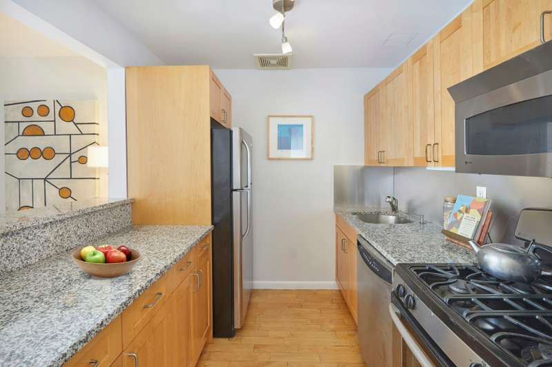 The galley kitchen is a dream come true for any home chef, featuring newer appliances, a dishwasher, and light cabinetry and granite countertops. Whether you're whipping up a quick breakfast or throwing a dinner party, this traditional, separate galley kitchen with pass-thru offers everything you need. The unit also includes the convenience of in-unit washer and dryer.