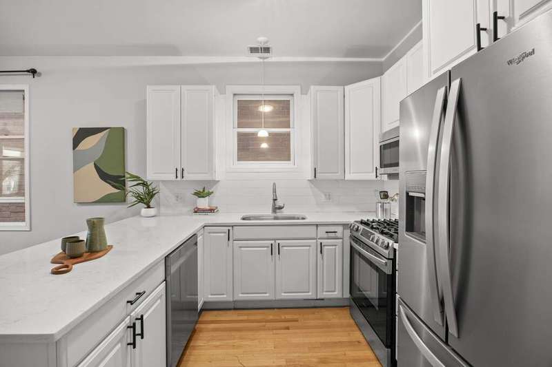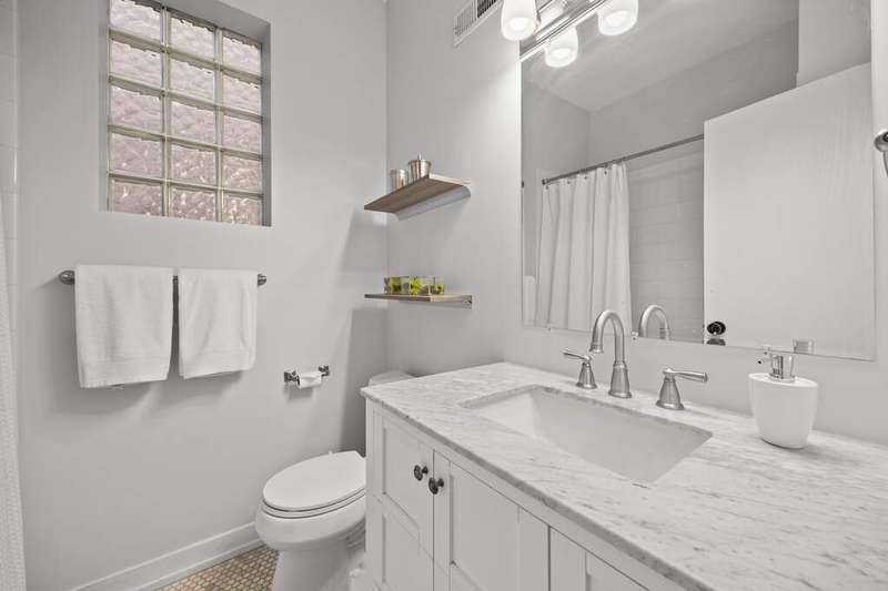 Heart of the Southport Corridor 2 bedroom/ 2 bath home on tranquil tree-lined street. Surrounded amongst elegant single-family homes, this condo provides a well thought-out floorplan which allows for an actual dining space, plenty of living room, hardwood floors throughout, a functional kitchen layout and an office or exercise nook. The stunning white kitchen has gleaming quartz countertops, subway tile backsplash and stainless appliances. A breakfast bar allows for seating for four. The wide living room provides a wood burning fireplace, ample space for furniture and dining table placement along with a bonus nook. Both bathrooms have been updated with timeless design including carrara marble, subway tile and handsome mosaic tile floors. Primary bath enjoys heated floors. The large primary suite has massive closet space and plenty of size to accommodate king sized bed and additional furniture. Off the rear of the home, a spacious deck provides room for grilling, lounging and privacy with no attached stairwell. A garage space and separate storage complete this wonderful residence. Steps from everything on Southport including, Little Goat, Ella Elli, Crosby's kitchen, Jeni's Ice Cream, trendy boutiques, Brown Line train and so much more! Welcome home to Southport Corridor living at it's finest!