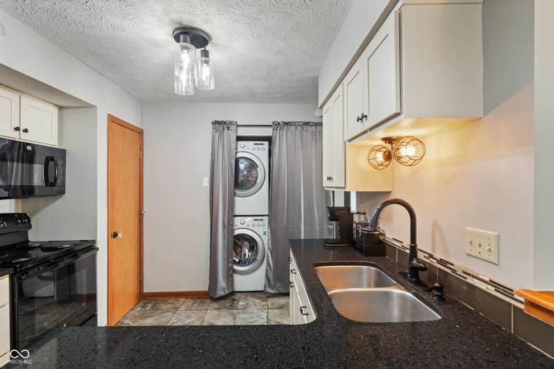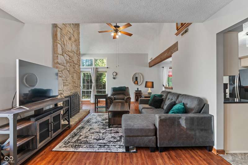 Nestled in a residential area of Indianapolis, Indiana, discover the condominium at 9593 Bay Vista West DR, in great condition and awaiting your personal touch. This attractive property offers a blend of comfort and style across two stories. The living room stands as an inviting space, defined by its high ceiling and vaulted ceiling, creating an airy and expansive atmosphere, with a natural stone floor to ceiling fireplace that promises cozy evenings and a warm ambiance. The floor to ceiling windows offer natural light making a perfect reading nook. You'll also enjoy the hardwood floors throughout the unit. The kitchen features shaker cabinets and stone countertops, providing a stylish and functional space for culinary adventures, with a kitchen peninsula offering a casual dining spot or extra prep area. The bathroom is equipped with a tiled walk in shower, providing a spa-like experience. There is a nice sized loft, open to the living room that would make a great home office space. This condominium offers 1252 square feet of living area on a 4392 square feet lot, complete with two bedrooms, one full bathroom, and one half bathroom. The primary bedroom offers double closets. Enjoy outdoor relaxation on the patio, an extension of your living space into the residential area. This property represents a wonderful opportunity to embrace a comfortable and convenient lifestyle. This condo will have all new siding and a brand new roof prior to closing! Hvac was replaced in 2021. Water heater is brand new. Bayside Woods offers a community pool, tennis court and clubhouse for entertaining family and friends. A must see!