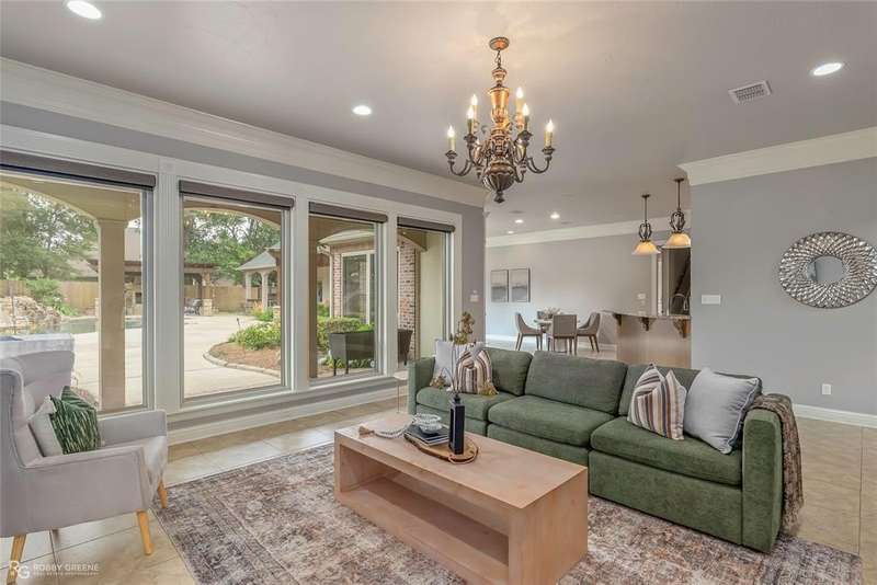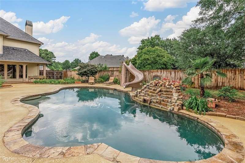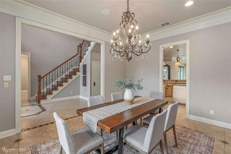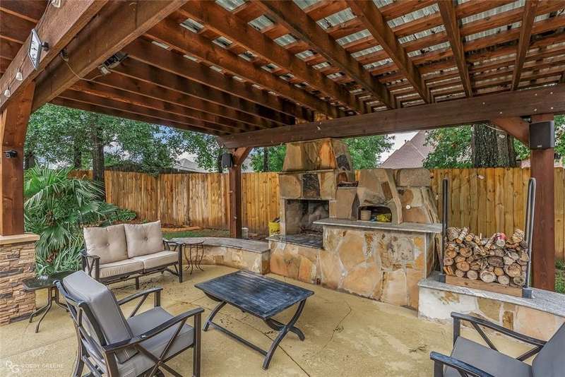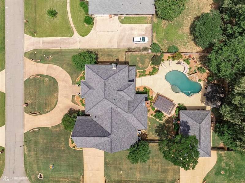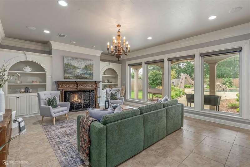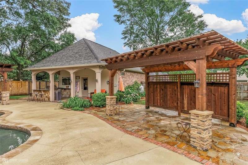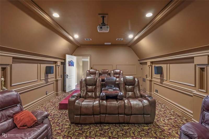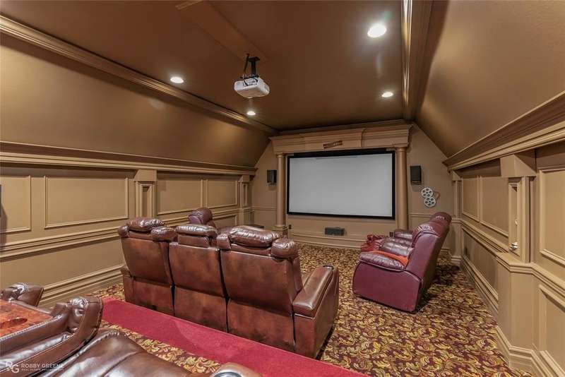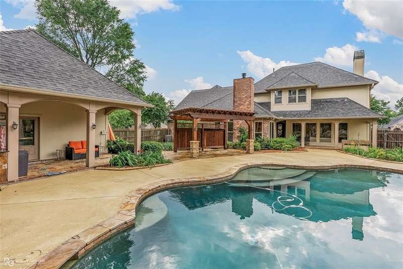This stunning residence offers a sprawling 4,871 square feet of refined living space with 5 bedrooms and 3.5 baths, perfectly blending timeless elegance with modern amenities. From the moment you arrive, the curb appeal captivates with stately brickwork, manicured landscaping, and a circular drive that sets the tone for the luxury within. Step through the grand double doors into a light-filled interior with soaring ceilings, ornate crown molding, and elegant tile and hardwood flooring. Two generous living areas provide flexibility for formal entertaining and relaxed everyday comfort, each featuring beautiful fireplaces, custom built-ins, and views of the lush backyard oasis. The chef’s kitchen is outfitted with granite countertops, custom wood cabinetry, stainless steel appliances, a double oven, built-in microwave, and a spacious island with bar seating all bathed in warm under-cabinet lighting. Adjacent are two formal dining spaces. The expansive primary suite is a private sanctuary featuring trey ceilings, large windows, and backyard access. The en-suite bath offers spa-like serenity with a deep jetted tub, walk-in shower, dual vanities with marble countertops, and a dedicated vanity space—all surrounded by luxurious tile and wall-to-wall mirrors for maximum grandeur. This is the master closet of your DREAMS, so much space! Upstairs, you’ll find a dedicated home theater with tiered recliner seating, wall paneling, and a projection system—perfect for movie nights or game-day viewing. Outside, the backyard transforms into a resort-style retreat. Take a dip in the sparkling inground pool or lounge poolside under the covered patio. The custom outdoor kitchen under the timber-framed pergola features a built-in stone oven, grill area, seating wall, and prep space for unforgettable cookouts. Brand-new pool water heater, a separate pool house with a new HVAC unit, and a new privacy fence. Total of 4 garage spaces with pristine epoxy flooring. Don't miss this beauty!