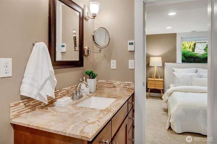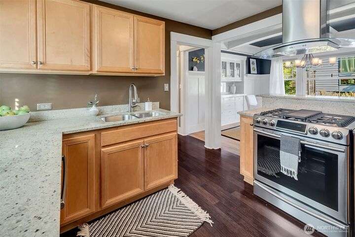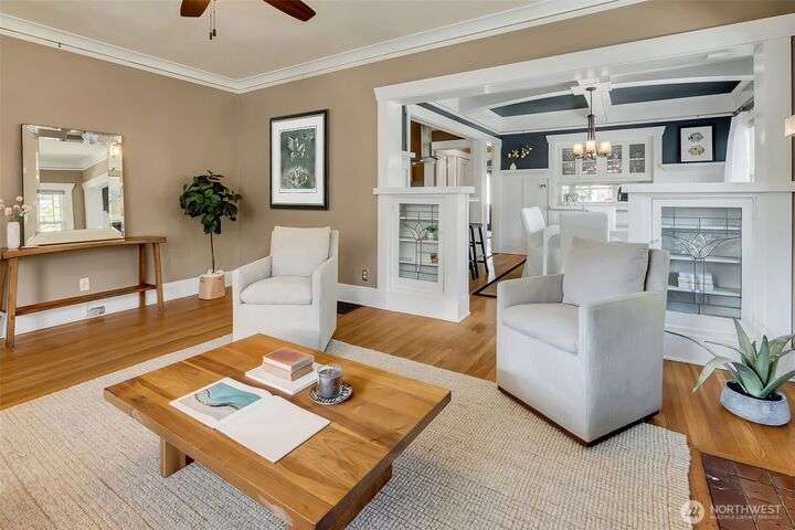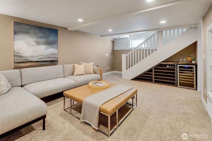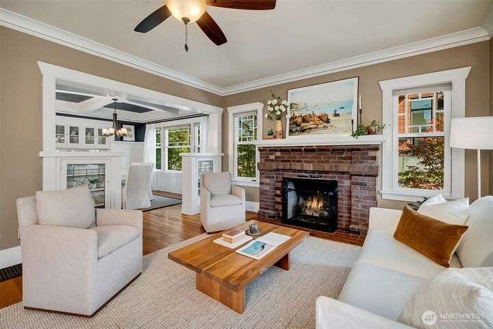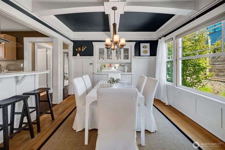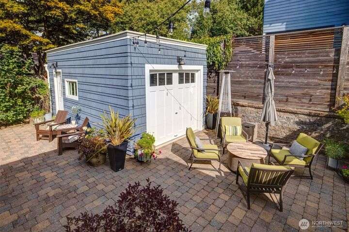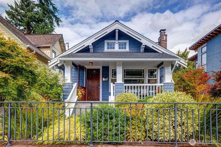 Quintessential Craftsman bungalow, beautifully updated for modern living while preserving timeless charm. Leaded glass, box-beam ceilings, built-ins, oak hardwood floors, & a gas fireplace highlight its character, while the updated kitchen flows seamlessly into the living spaces. French doors open to a covered deck overlooking a professionally landscaped fenced yard with irrigation & a paver patio. The lower level offers a turnkey media room & primary suite with a walk-in closet. The detached garage has a workshop/storage room & a custom entertaining bar space. Completely move-in ready w/ new systems throughout plus A/C & Off-st parking for 4 cars! Ideally located near Green Lake & Tangletown shops, eats, & UW. EZ access to I-5 & downtown