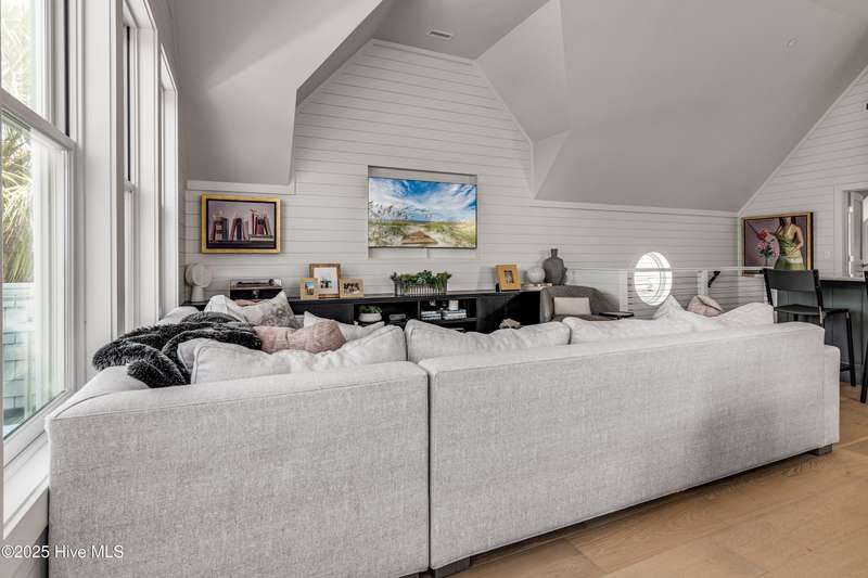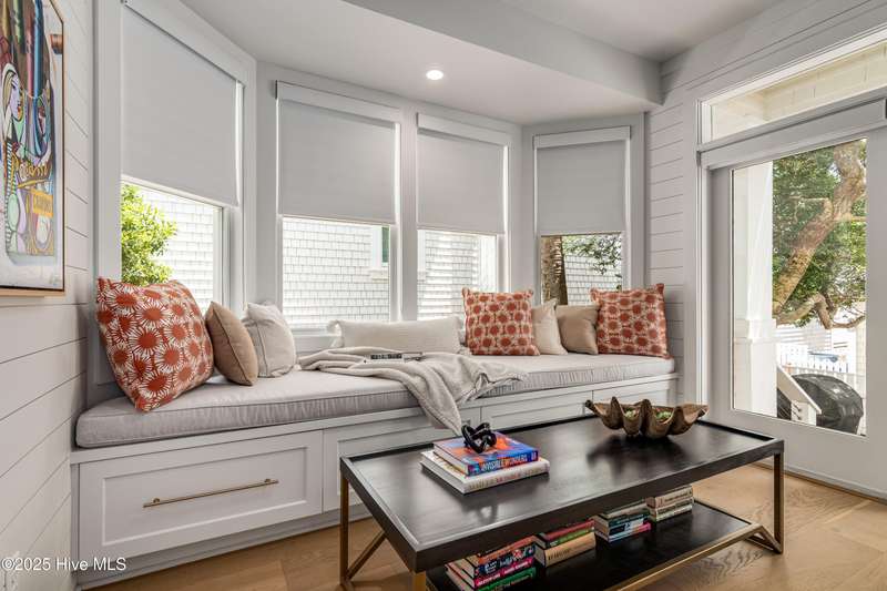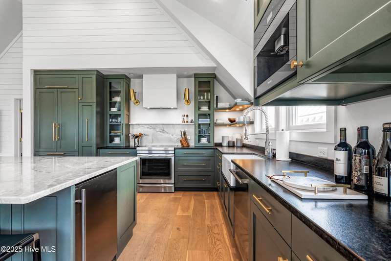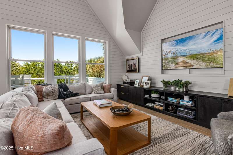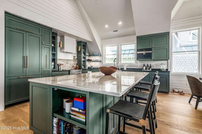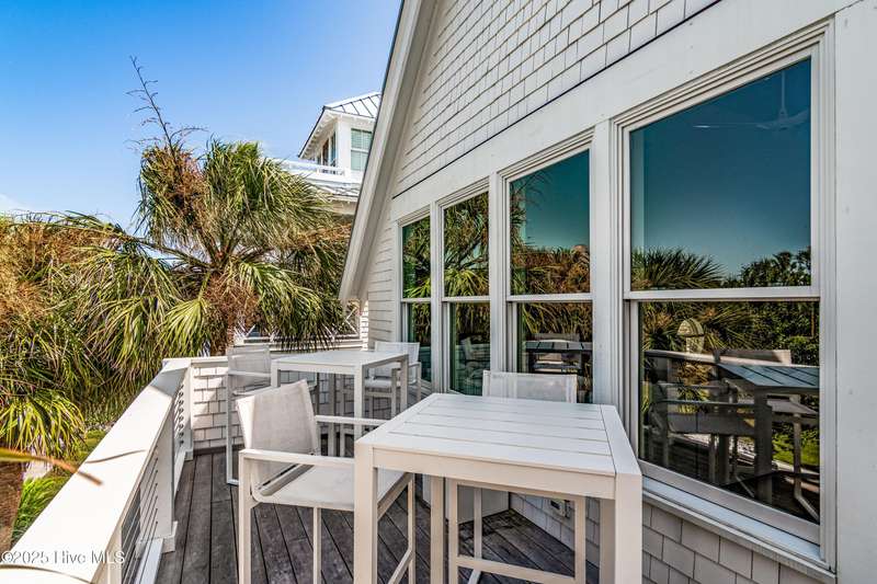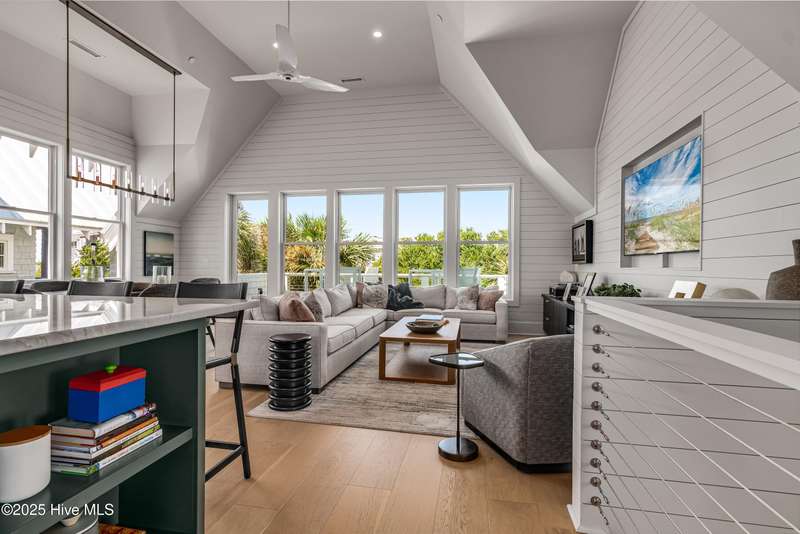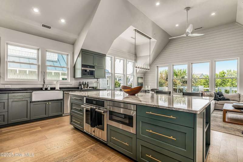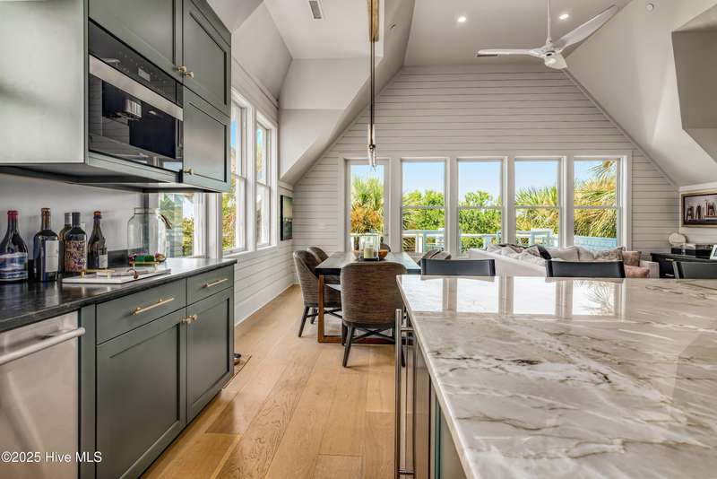 DOWN TO THE STUDS RENOVATION, that was featured in the 2024 HAVEN magazine done by an experienced full time BHI resident. This natural light-filled three bedroom, 3.5 bath retreat in sought-after Harbour Village faces the tranquil Commons Lawn. The floorplan's foyer is outfitted with a hall tree. Drop your stuff and follow the handsome engineered wide-planked hardwoods to the first suite-a large King with a Carolina closet behind a barn door and its own ensuite with a tub/shower. This room, like the rest of the house, offers high ceilings, clean lines and emanates a tasteful, modern designer vibe. Down the hall is this level's sunlit Primary King Suite which features a built-in desk, Carolina closet and a private bath with dual vanity. Outside its door is a bright, bayed gathering space/reading nook with an oversize window seat and access to the back grilling patio. The laundry and a powder room complete this floor. Upstairs reveals a sunny two-story vaulted open floorplan surrounded on three sides by windows. The gigantic, dream kitchen pampers even the pickiest chefs with its high-end Thermador and Jennair stainless appliances, Miele coffee system, additional beverage fridge, HUGE island with breakfast bar, myriads of soft closing storage, yards of quartzite counters, and brushed hardware finishes. The handsome dining area offers views from inside or you can munch al fresco and savor ocean vistas and the sound of waves from the dining table on the house-length porch. The comfy living space provides plenty of seating and is perfect for conversation, game-playing or movie-watching. This level's Primary King Suite includes its own sitting area, an extensive walk-in, and its own bath with a dramatic marble shower. This property boasts an UPGRDED FIRE SURPRESSION SYSTEM, recent painting, decorator details, a back-alley garage ( could construct 4thBR above garage) and conveys with two four-seat golf carts. Memberships available under separate purchase