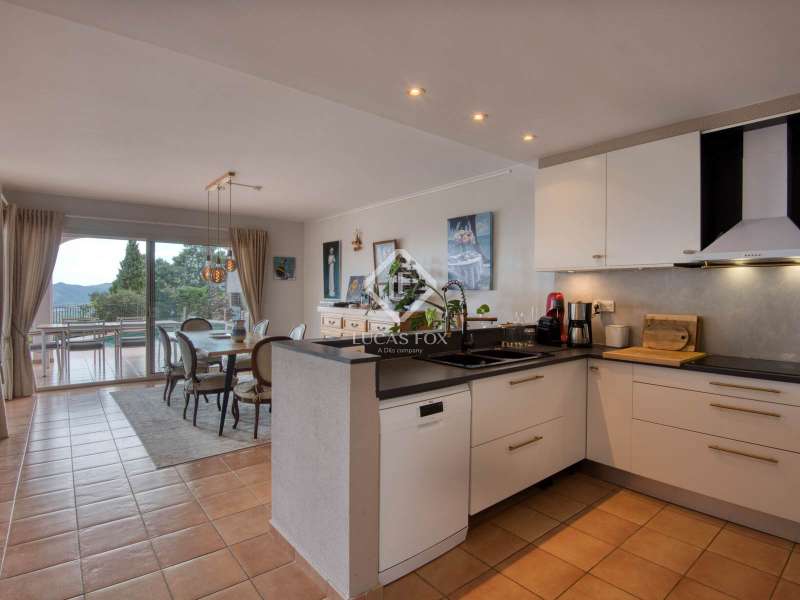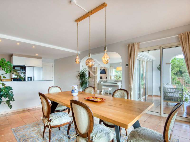 This elegant 361 m² villa stands out for its functional design, its southerly aspect , and its large windows that allow abundant natural light to enter and offer magnificent views of the sea and the mountains surrounding the property. The property is spread over two distinct floors. On the main floor , we find a guest toilet, a ensuite bedroom and dressing room, as well as a spacious living-dining room with a fireplace and an study area, providing warmth and comfort. The open-plan kitchen connects conveniently to this room and offers direct access to a chill-out area , the covered exterior dining area with a built-in barbecue, and the private pool, ideal for relaxing and enjoying the Mediterranean climate. Finally, there is the garage, which is connected to the kitchen. The lower floor features a versatile open-plan space, perfect as a study, reading room, or games room, a single bedroom , and two bedrooms with private bathrooms. This floor has radiator heating, while the main floor has underfloor heating, offering absolute comfort year-round. Exterior, there's a saltwater pool with an electrolysis system and automatic pH control. The villa also includes high-speed fiber optic cable, a must-have for those looking to combine remote work in such a location. The property is located in the prestigious Mas Nou development , one of the most exclusive on the Costa Brava. It boasts a privileged and peaceful location, close to the best beaches, golf courses, luxury amenities , and high-end restaurants. Furthermore, its excellent location ensures easy access to Girona, Barcelona, and the rest of the region.