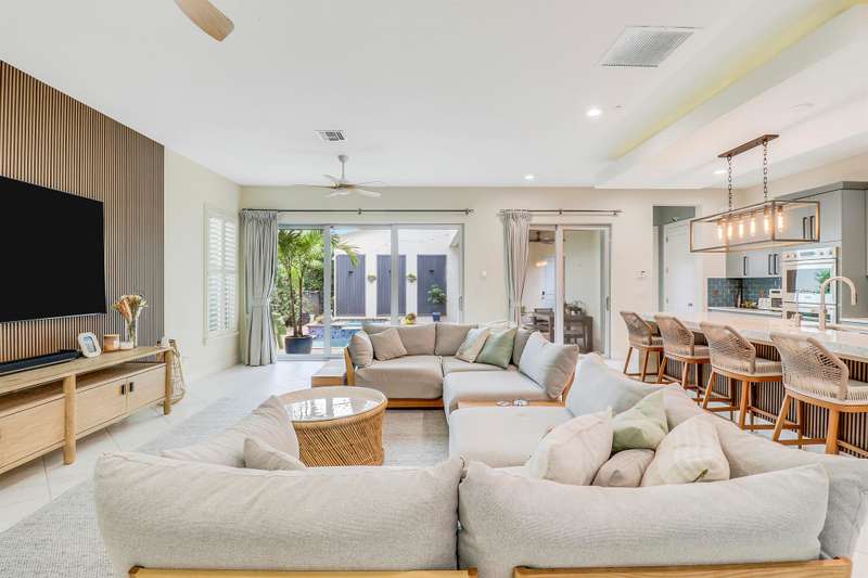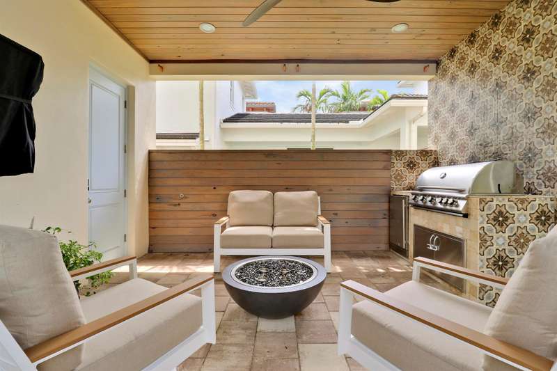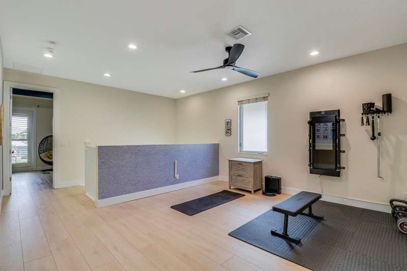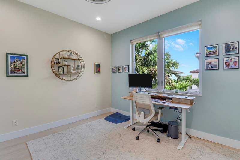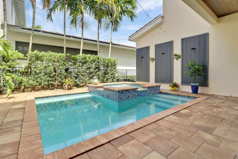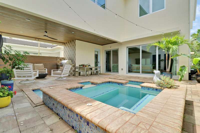 This stunning move-in ready home features porcelain floors downstairs, vinyl plank floors upstairs, custom wallpaper, designer paint, light fixtures, wood slat panels, and window treatments. The gourmet kitchen offers granite countertops, high-end appliances, and a built-in refrigerator. A stylish lounge with wet bar has replaced the downstairs office--perfect for entertaining.Upstairs, the owner's suite includes 2 walk-in closets, a spa-style bathroom and a private balcony. There's also 3 additional bedrooms, plus a home gym and a 5th bedroom, currently used as an office.Enjoy a private outdoor oasis with pool, hot tub, and summer kitchen. A 3-car garage offers ample storage, while security cameras and keypads provide peace of mind.Close to the I-95 and the Turnpike, 20 mins to PBI.