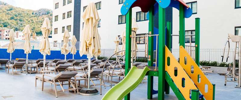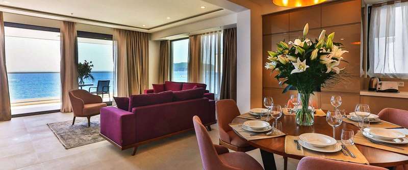 The apartments are bright, cozy, and furnished in a sleek, modern style using high-quality, eco-friendly materials. They are sold turnkey, with furniture, household appliances, textiles, and accessories. Built-in furniture uses glossy MDF; kitchen countertops are made of durable, wear-resistant DuPont Corian. Upholstered furniture is fire-resistant, easy to clean, and moisture-repellent. Each master bedroom has a king-size bed and blackout curtains, and the floor-to-ceiling panoramic windows in the living room showcase breathtaking views of the Adriatic Sea. The complex is secured with a video surveillance system, ensuring only authorized individuals can enter.