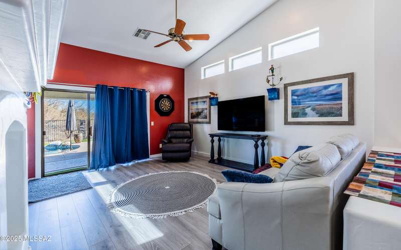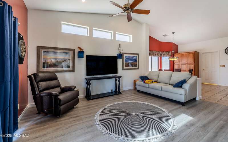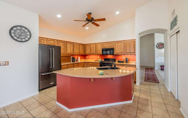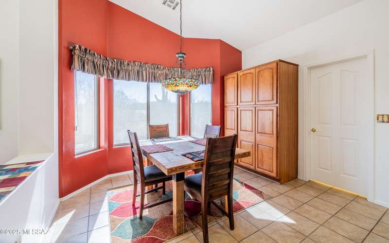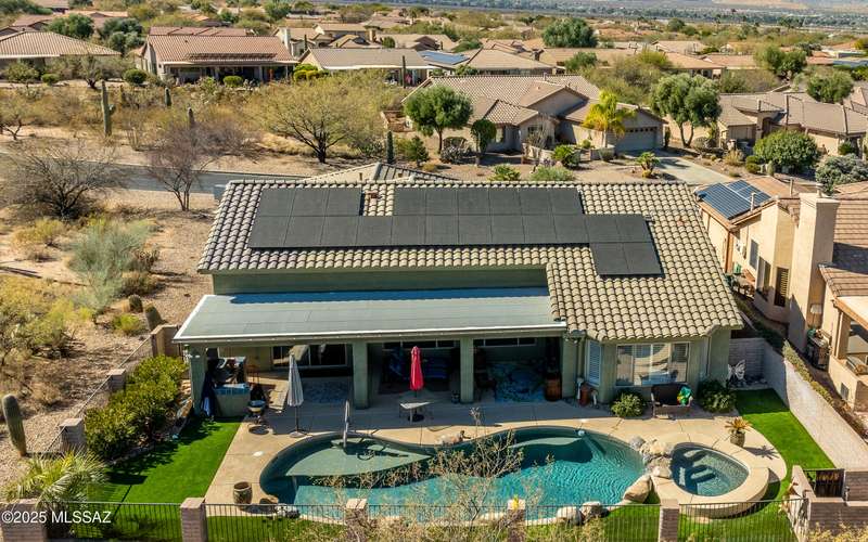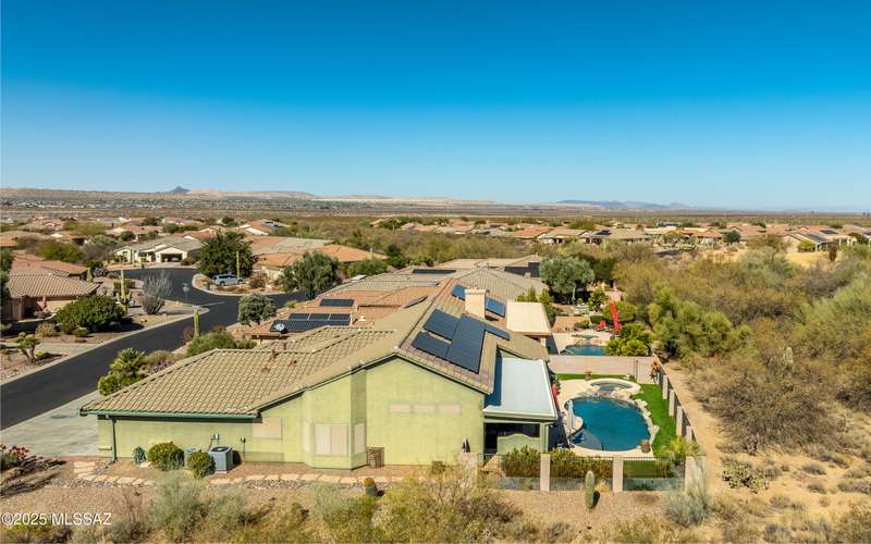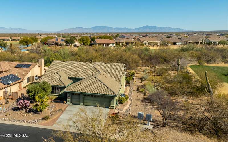 Welcome to this beautiful 2,361 sq ft home featuring 3 spacious bedrooms, 2 baths, and Den. 2-car garage, and Golf Cart Garage in Quail Creek. Enjoy breathtaking desert & mountain views from the covered patio, complete with a built-in BBQ. The property boasts an inground pool and spa, perfect for relaxing and entertaining.The kitchen is a chef's dream with granite counters and newer stainless steel appliances. Convenience is key with a dedicated laundry area and lots of pantry storage. Enjoy the magnificent sunrises from your covered patio. New epoxy floor in garage. Home is located next to a golf lesson area with putting green and sand traps, and close to the Madera clubhouse. This home offers a perfect blend of luxury and leisure. Solar on home is leased, $153/month.