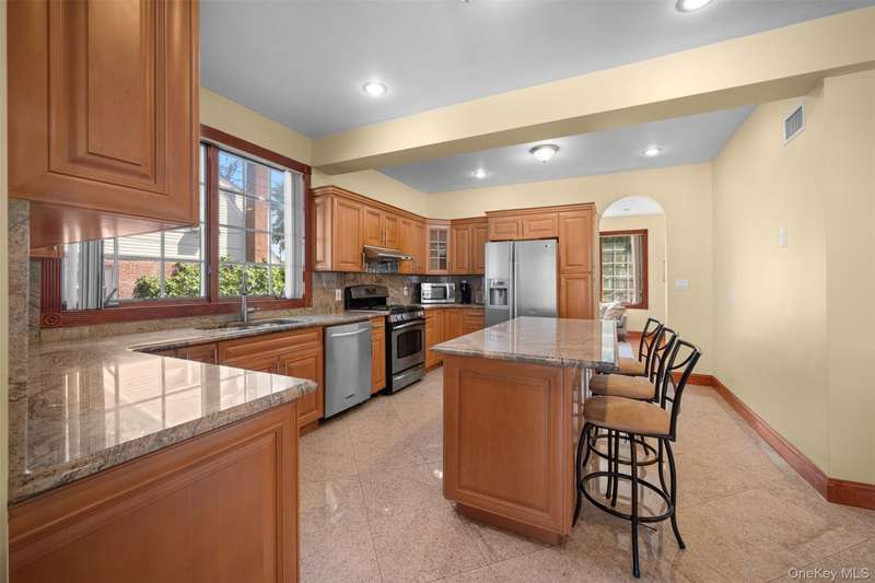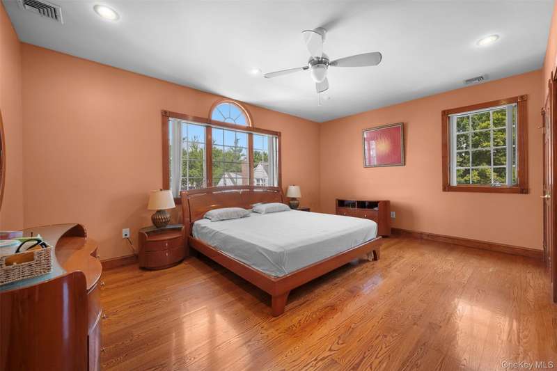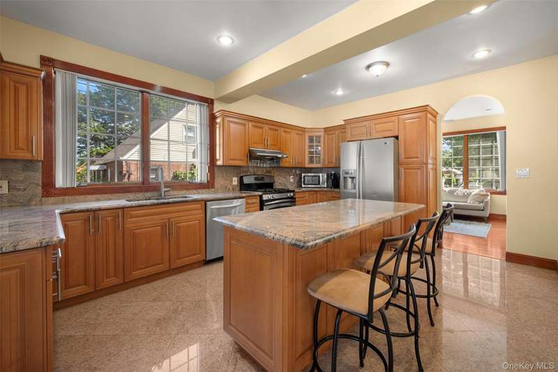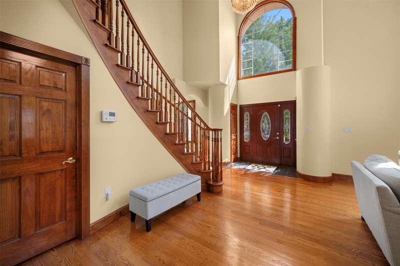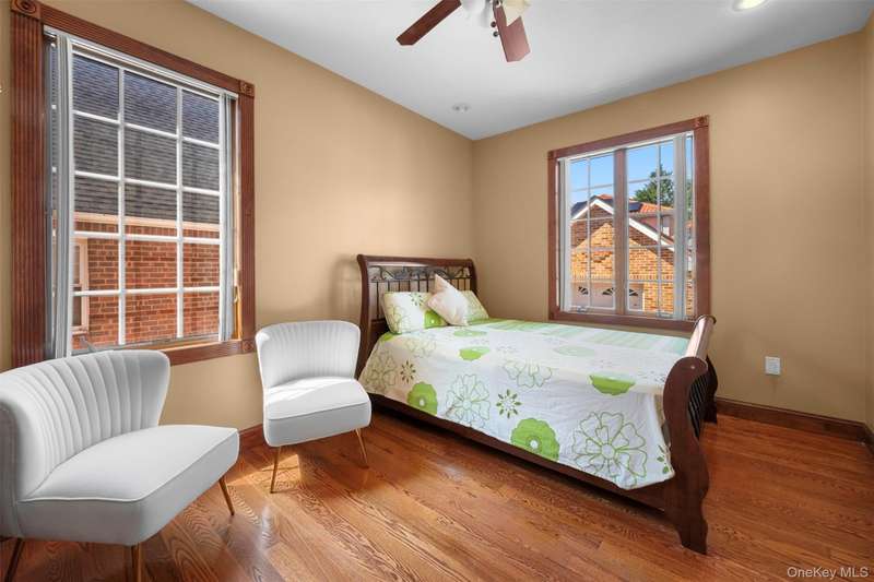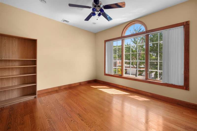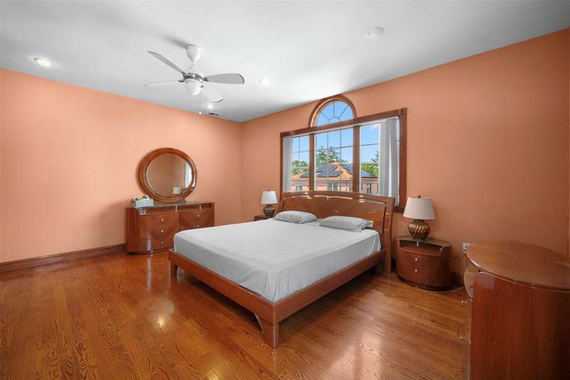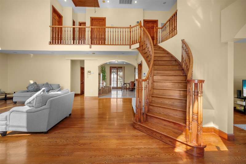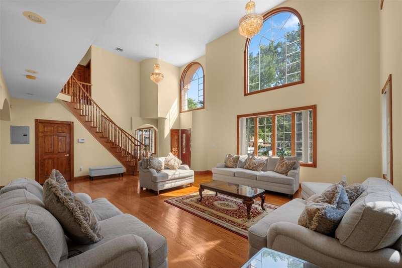 This beautifully reimagined custom brick home with soaring columns offers luxurious living with modern updates from the ground up, situated on a 60x100 lot. Boasting 3,105 sq ft of refined space, this residence features five spacious bedrooms and three and a half bathrooms, including a first-floor bedroom perfect for guests or generational living. Step into the formal living room adorned with oversized Anderson windows, two elegant chandeliers, and a grand circular staircase. Designed with ample natural light, the space is surrounded by large windows that let sunlight pour in throughout the day. The open layout and bright ambiance make this living room an ideal setting for relaxing, entertaining, or spending quality time with loved ones. Custom-made doors throughout the home add unique charm and craftsmanship. Step into a beautifully lit family room that radiates warmth and comfort. Elegant arched walkways lead in and out of the room, adding architectural character and a soft flow between living spaces. The chef's kitchen is a dream, featuring custom cabinetry, granite countertops, stainless steel appliances, and a sunny eat-in area. The formal dining room is ideal for entertaining with French doors opens to a rear deck with awning, leading to a private backyard. Upstairs, find four generously sized bedrooms. The primary suite offers a spa-like retreat with a soaking tub, walk-in closets, and ample natural light. The fully finished tiled basement adds valuable space with a rec room, surround sound, half bath, laundry room, utility room, and private access to the backyard. Additional features include hardwood floors and recessed lighting throughout, two-zone central heating system, an elegant design with modern conveniences, an ADT security system, and close proximity to schools, parks, shopping, transportation, and houses of worship. This is more than a house - it's a place to call home.