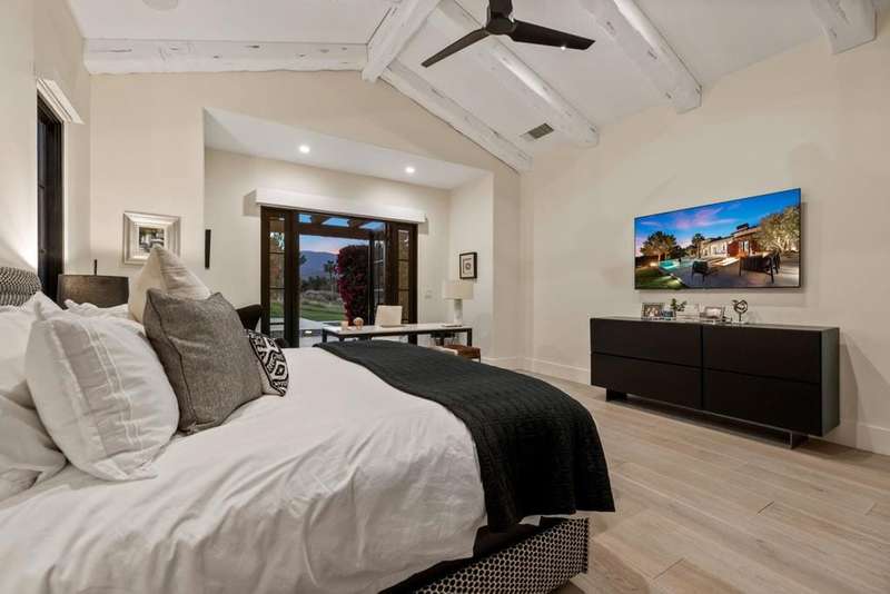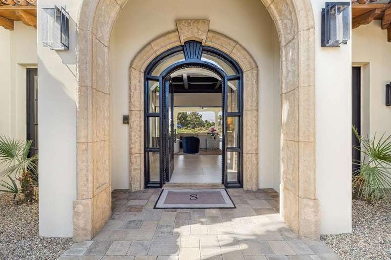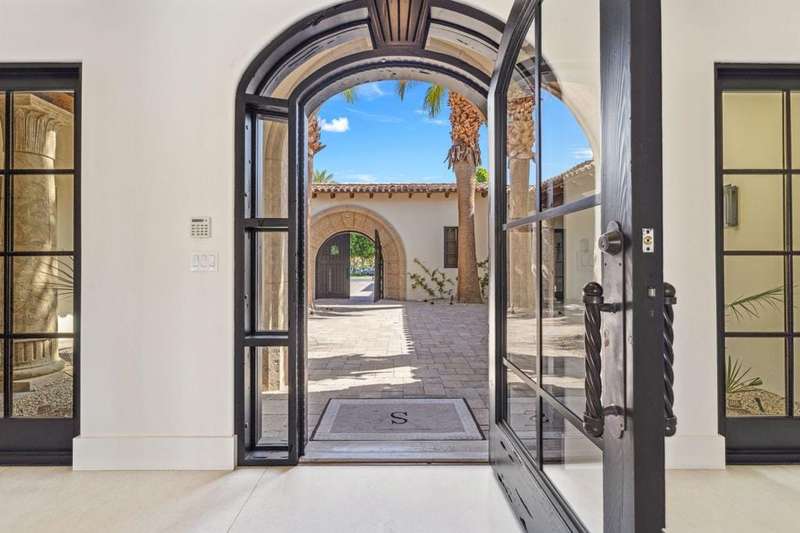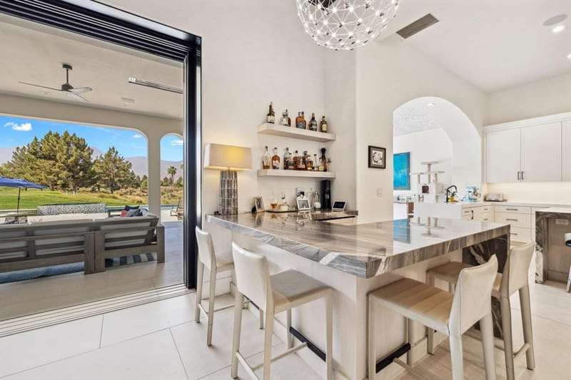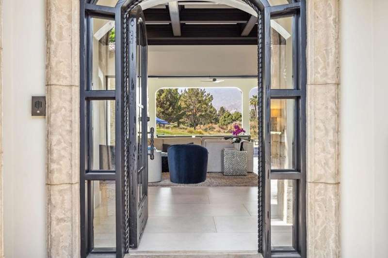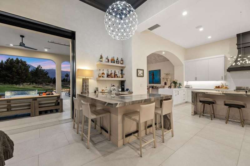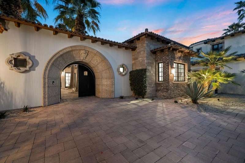 Welcome to one of the most remarkable properties in the prestigious Hideaway community of South La Quinta. Perhaps one of the largest and most private residences in the entire community, this 20K sq ft lot expands into acres of unobstructed southwest facing mountain views. With no other homes in sight from the interior view, this residence provides what is unparalleled privacy that is unique and will remain forever. The property has been transformed by the current owners over the last 12 years, expanding the initial lot through a land purchase from the club in 2014 and then subsequent work over the years has resulted in what can only be described as exposing a previous diamond in the rough. Positioned on the 16th hole of the Clive Clark course, this home is perfectly positioned at the end of a rare single lined cul-de-sac. This 5-bedroom, 5 1/2-bathroom residence all on one floor, features dual master suites, a fully enclosed courtyard entry that sets the tone for the refined living within. The interior showcases timeless architectural details including arched doorways and a modern wood coffered ceiling in the great room. A recent complete re-model blends classic Hideaway style with a modern flare, the result is a true turnkey opportunity for those looking for something special. Wall-to-wall pocket doors seamlessly connect indoor and outdoor living, leading to a sprawling covered patio with a built-in outdoor grill, firepit, and fireplace. The resort-style backyard is a true desert paradise, featuring a 40 ft pool with an elevated spa and baja shelf that leads to a perfect setting with a special view. The updated rear of the property is accentuated with fire features both at the pool's edge and an elevated outdoor entertaining area with firepit. Adjacent to the firepit is your own lighted bocce ball court. The property has a professionally designed outdoor sound system encompassing buried subwoofers and 16 speakers for an unparalleled and private listening experience. 53731 Via Mallorca, a rare and refined offering in one of the desert's most exclusive enclaves--this is Hideaway living at its finest.