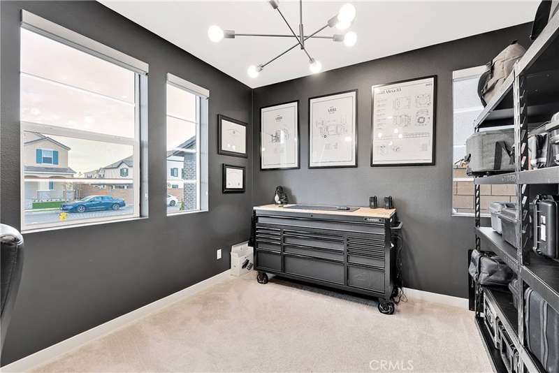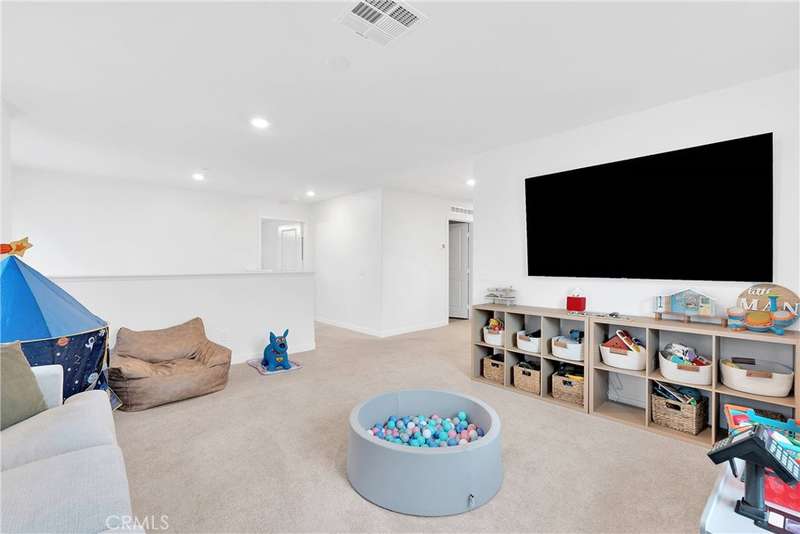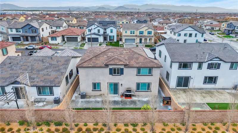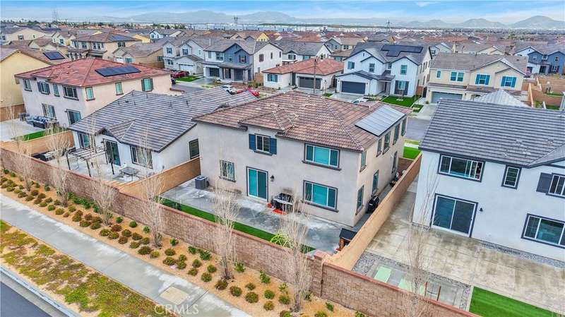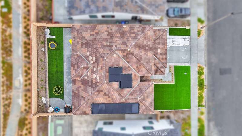 Designed with energy efficiency in mind, the home includes Tesla solar panels, a Tesla battery pack, and a 220V outlet for EV charging in the oversized three-car tandem garage. Both upstairs bathrooms offer dual sinks for added convenience. The front and backyard are beautifully landscaped with artificial turf and concrete, ensuring a low-maintenance outdoor space.