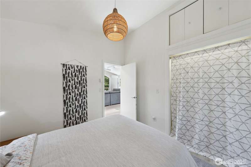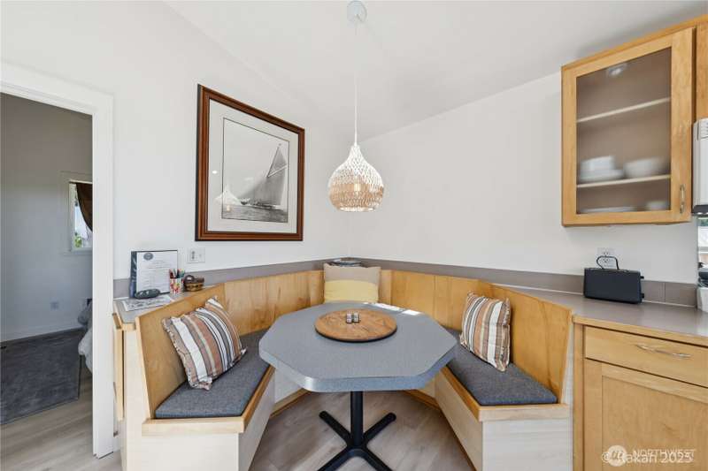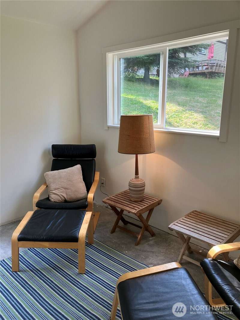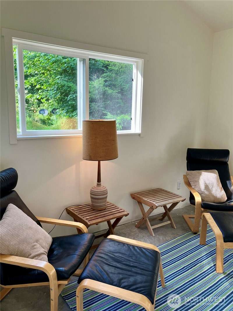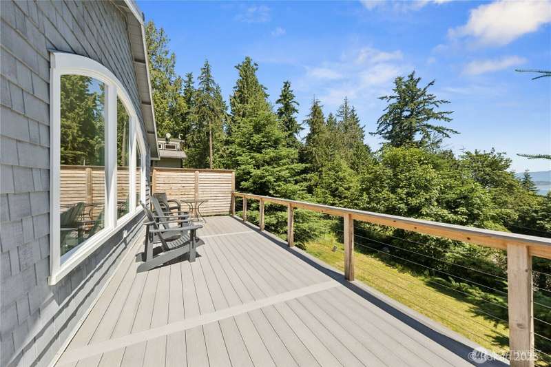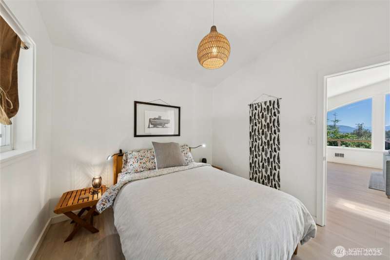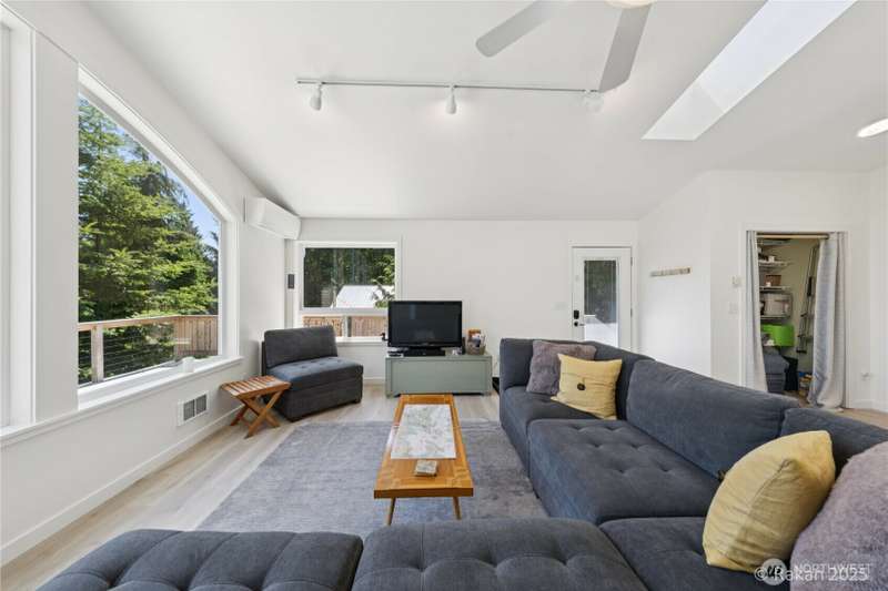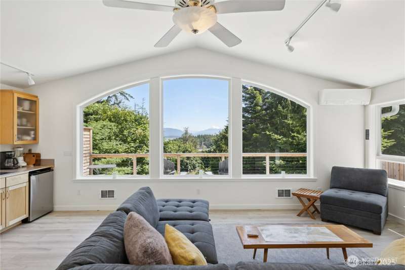 Turn-key, Guemes Island contemporary cabin with a wall of windows to let the natural light in. Stunning views of Mt Baker, Huckleberry Island and the bay from inside and on the deck. Open concept with a built-in dining nook, living area and kitchen with a wall of cabinets. One bedroom and one full bathroom. LVP Flooring by Gaia throughout. Ductless mini split heats the main area with wall heaters in the smaller rooms. The 720 SF garage is fully finished with counters, a sink, a second fridge, washer and dryer and half bath. Separate 192 SF Studio. This community has three coves to enjoy. Cooks Cove has a boat ramp. This home is now used as a profitable Airbnb. There are outdoor stairs to the main living area and deck.