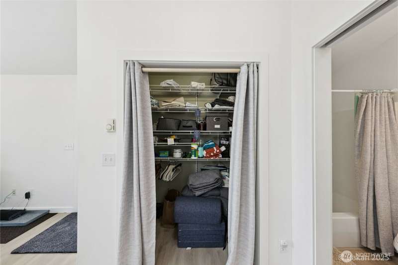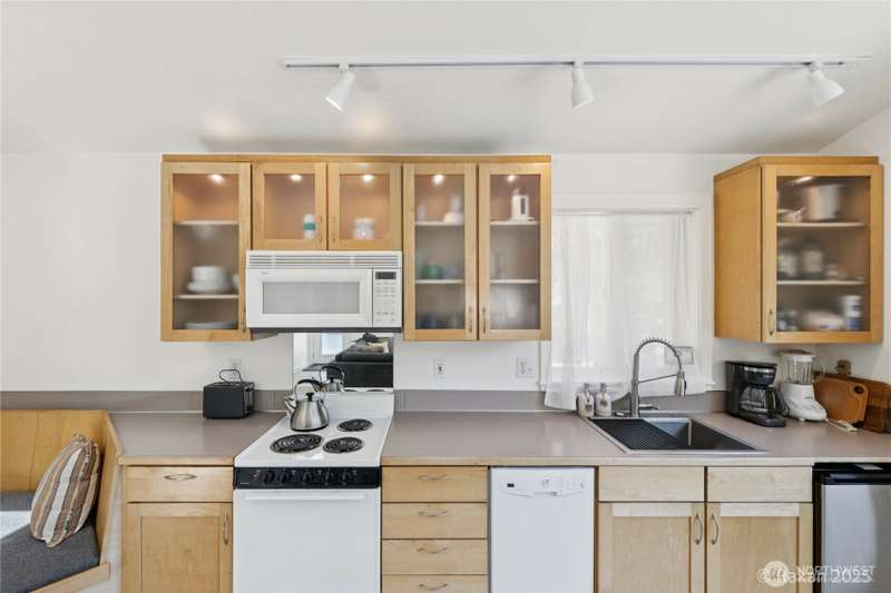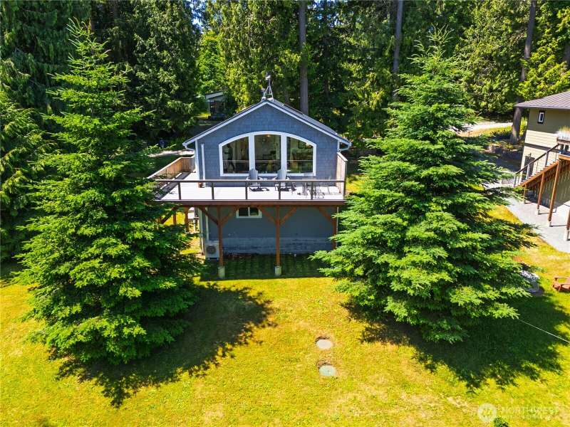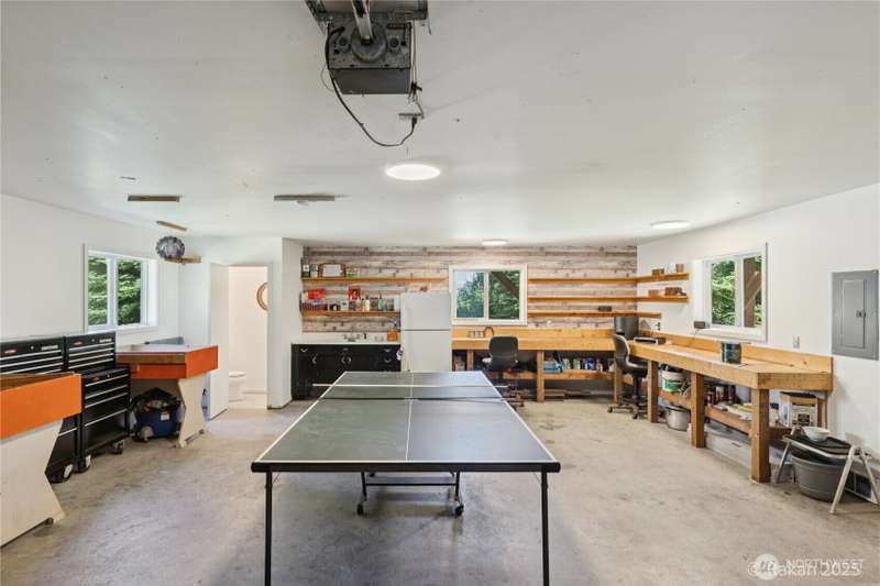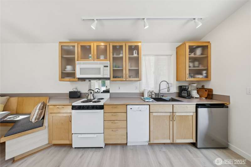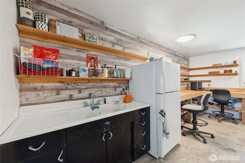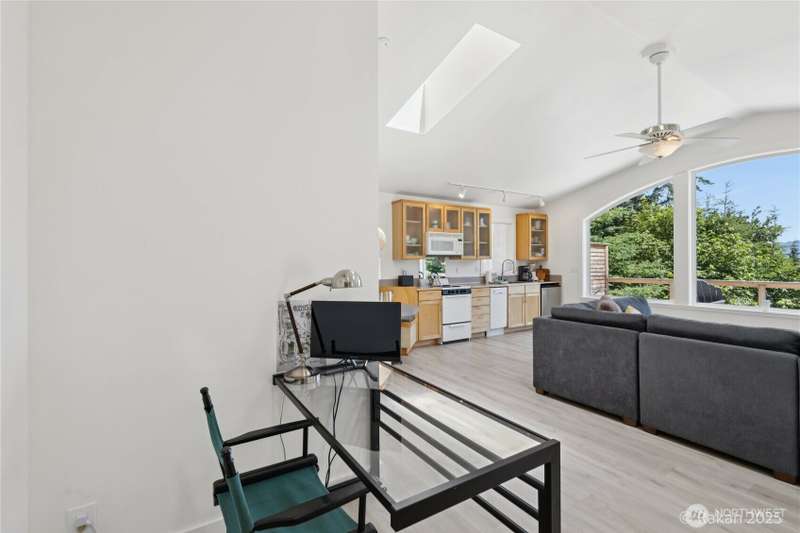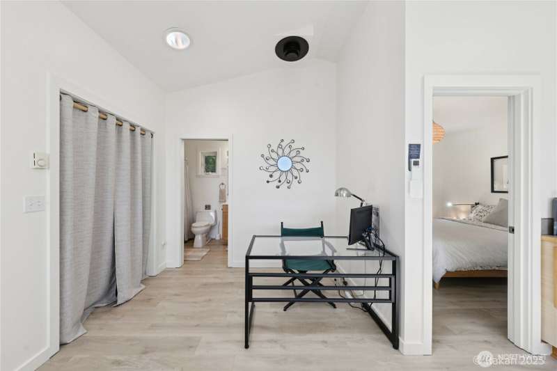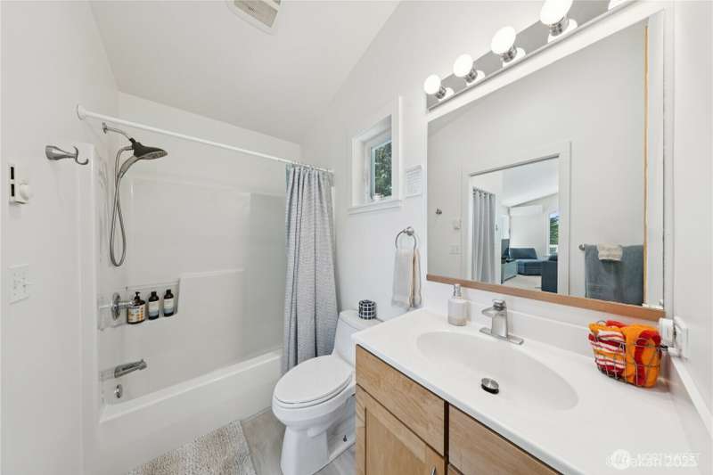 Turn-key, Guemes Island contemporary cabin with a wall of windows to let the natural light in. Stunning views of Mt Baker, Huckleberry Island and the bay from inside and on the deck. Open concept with a built-in dining nook, living area and kitchen with a wall of cabinets. One bedroom and one full bathroom. LVP Flooring by Gaia throughout. Ductless mini split heats the main area with wall heaters in the smaller rooms. The 720 SF garage is fully finished with counters, a sink, a second fridge, washer and dryer and half bath. Separate 192 SF Studio. This community has three coves to enjoy. Cooks Cove has a boat ramp. This home is now used as a profitable Airbnb. There are outdoor stairs to the main living area and deck.