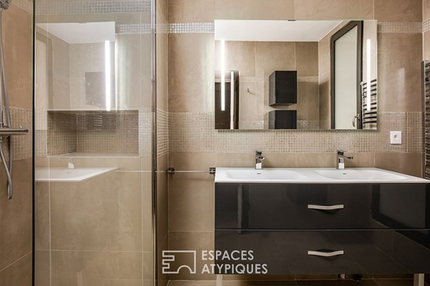The house has benefited from a complete renovation with beautiful features that combine modernism and old-world charm. From the entrance, a corridor leads to the different rooms. Two bedrooms with cupboards are located with a bathroom each. This is followed by a first living room filled with light thanks to the bay windows. It benefits from a view and access to the garden, regularly maintained by a gardener, quiet and not overlooked. A fitted office, a laundry room and two toilets complete the ground floor.