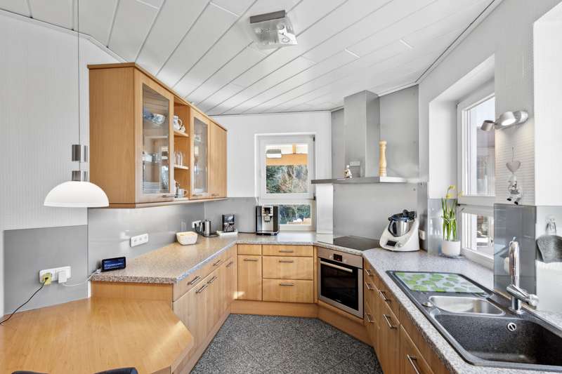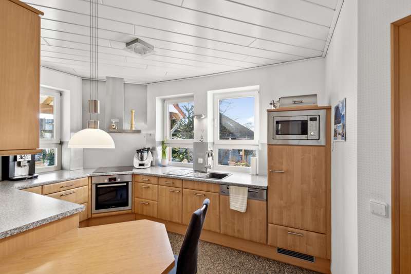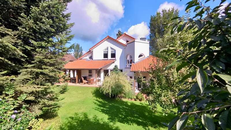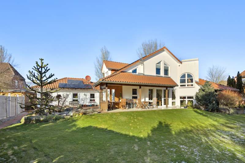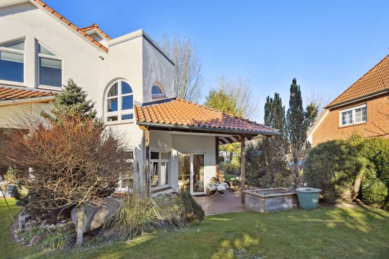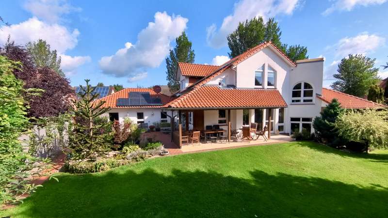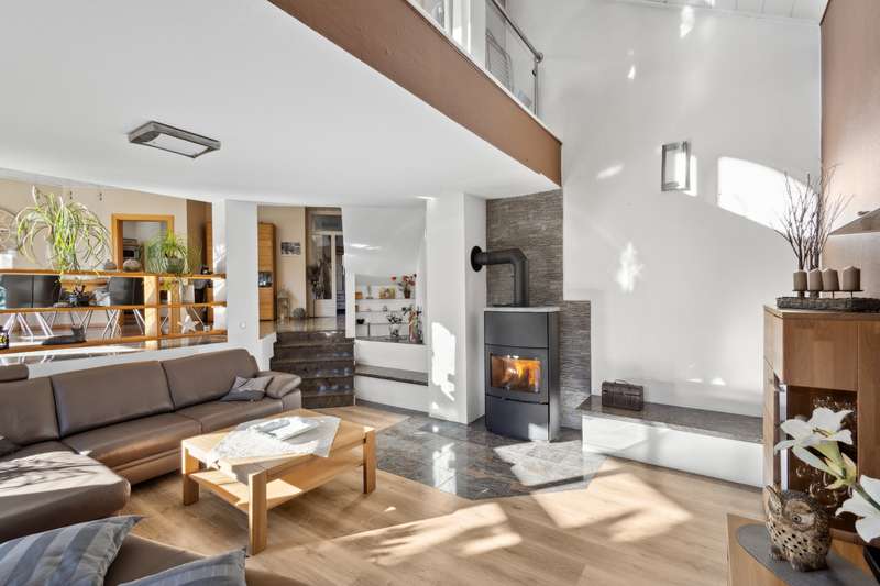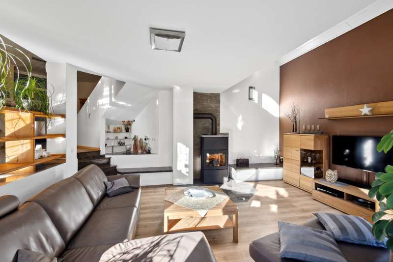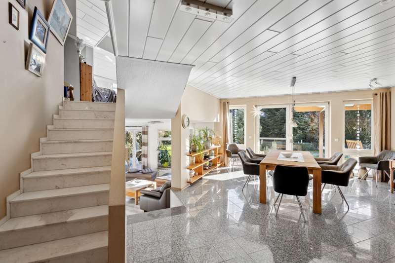 This spacious architect-designed house with high-quality furnishings was individually planned and built in 1997 on a plot of approx. 950 m² that is hidden from view. The property impresses with a living area of approx. 194 m² and an additional usable area of approx. 24 m², spread over three levels. The well thought-out architecture and the use of high-quality materials create an exclusive living ambience. At the heart of the house is the light-flooded living and dining area with floor-to-ceiling windows that allow optimal orientation to the east, south and west. The elegant interior design extends over two levels and ensures an exceptional living experience. The spacious, covered south-facing terrace and the adjoining west-facing terrace invite you to linger outdoors. The kitchen offers direct access to the adjoining pantry and utility room and also has a separate exit to the west-facing terrace. There is also direct access into the house from the double garage, which provides extra convenience in everyday life. The high-quality interior impresses with fine materials such as white marble, granite and modern vinyl flooring. The brightly designed bathrooms, a separate dressing room, a separate guest area and a wellness area underline the upscale living comfort. Underfloor heating provides pleasant warmth, while the wood-burning stove also ensures a cozy atmosphere on cooler days. Future-oriented technology rounds off the offer: a solar system, a cistern for sustainable water use and many other well thought-out details make this property a special home. Enjoy stylish living in a quiet cul-de-sac location with optimal southern exposure and excellent infrastructure.