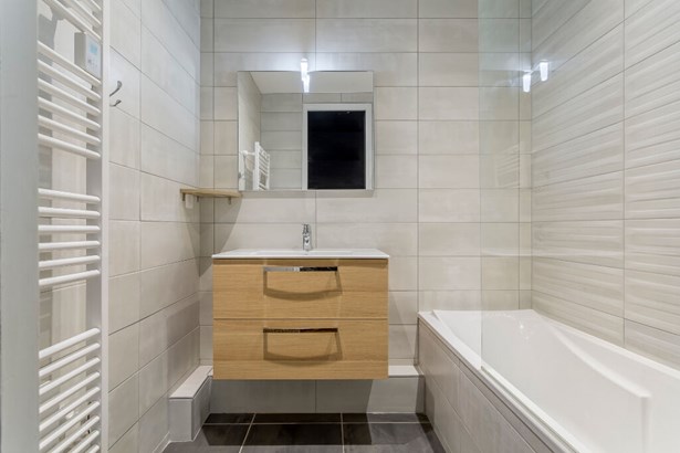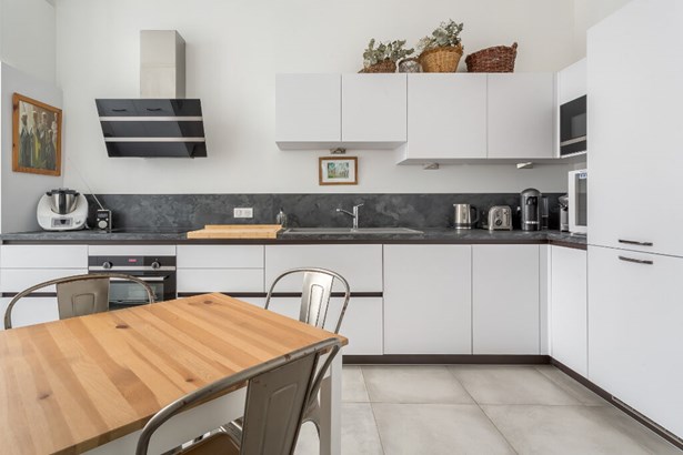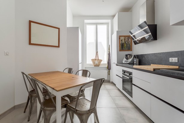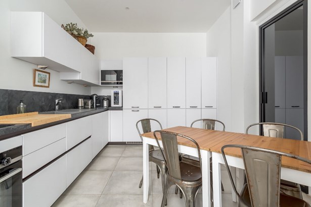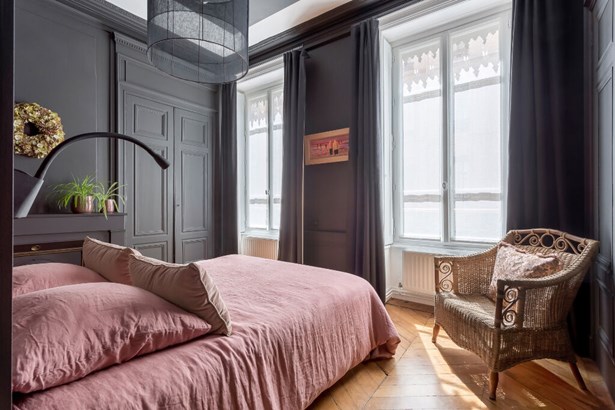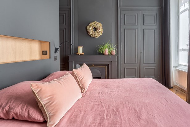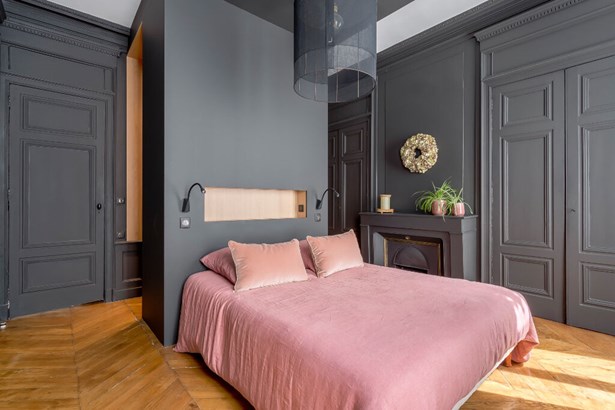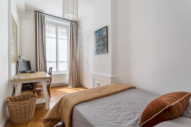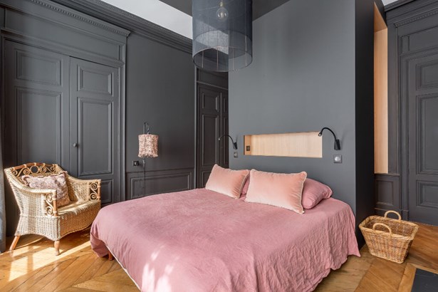 From the entrance, the choice of materials will delight lovers of old-world charm. It opens directly onto a corridor offering a wardrobe space and serving this dual-aspect apartment. The first space consists of two bedrooms, one with a dressing room, sharing a bathroom, as well as a contemporary kitchen overlooking the courtyard.