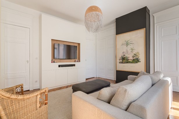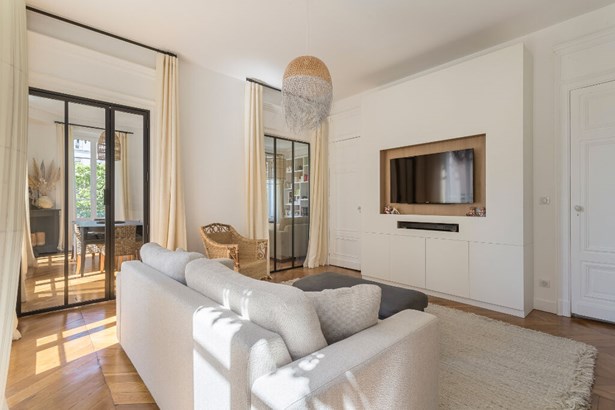 The second part of the apartment consists of a large, bright living room offering a dining area and a lounge area, with Versailles parquet flooring, an antique fireplace, custom-made cupboards and contemporary glass walls. This living room is completed by a television area, which can be used as a third bedroom, with its own bathroom.