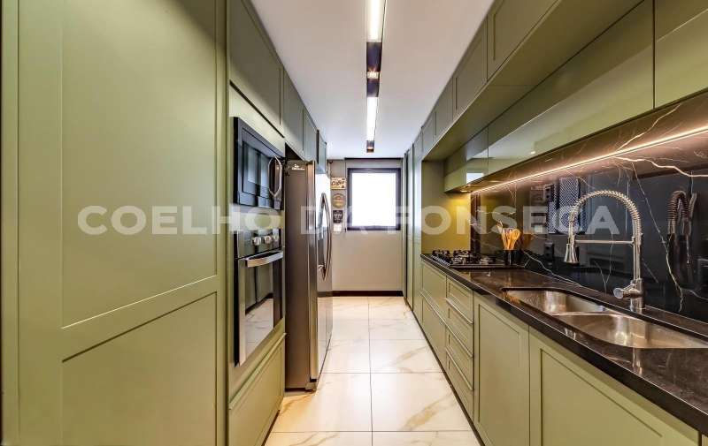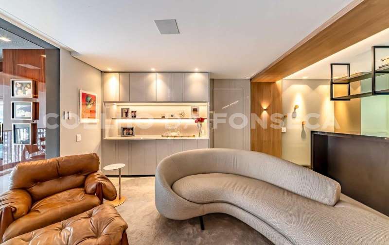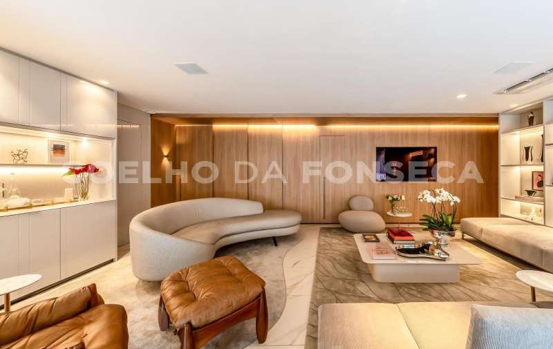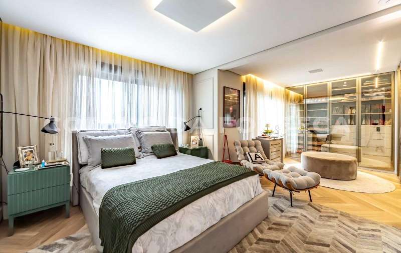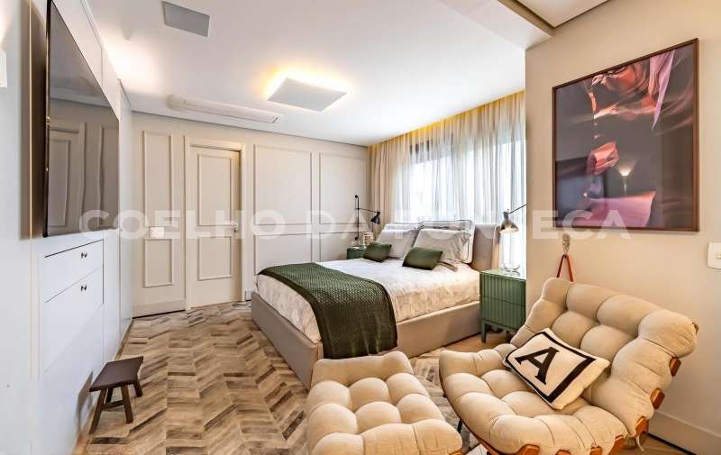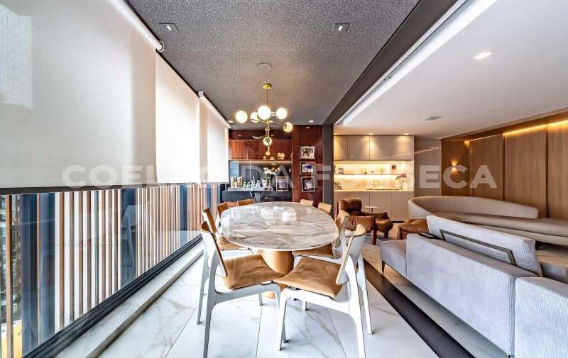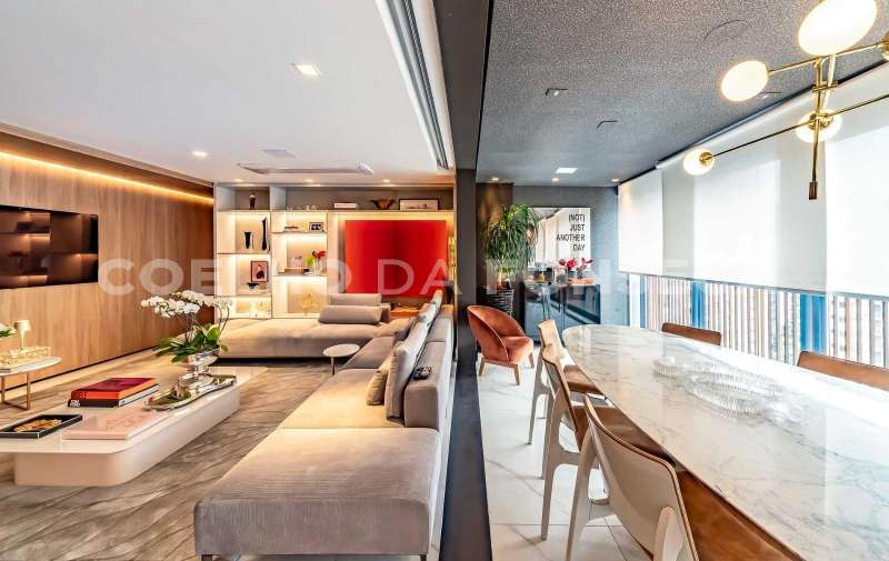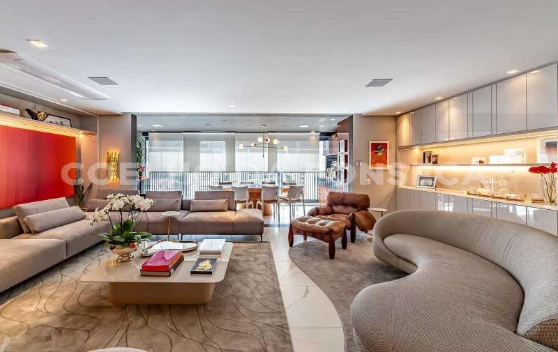 Apartamento luxuoso e com alto padrão de acabamento. Face norte, vista livre. Acabamentos de marcenaria da SCA, mobilia em laca e vidro refleta, iluminação interna nos armários. Cenários de iluminação, persianas nos dormitórios e no living e ar condicionado em todo o apartamento.