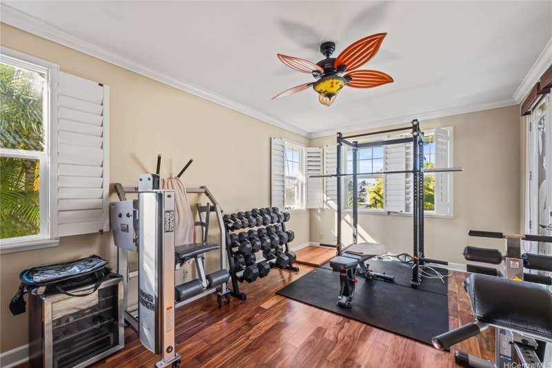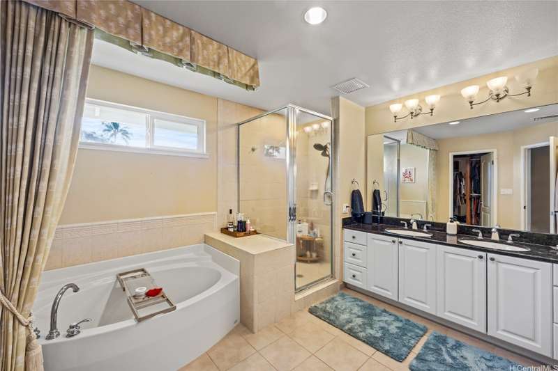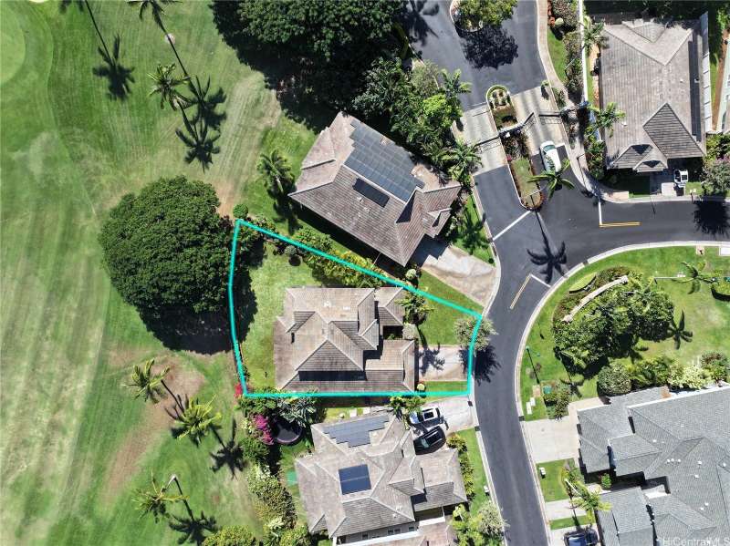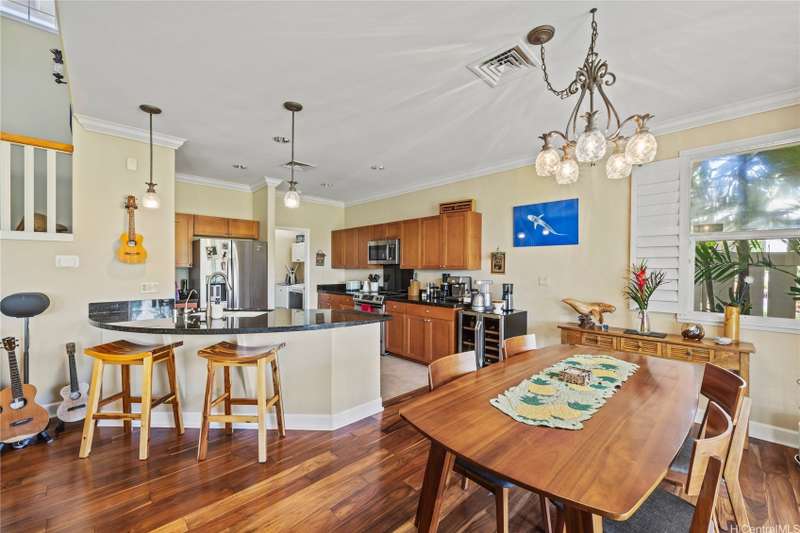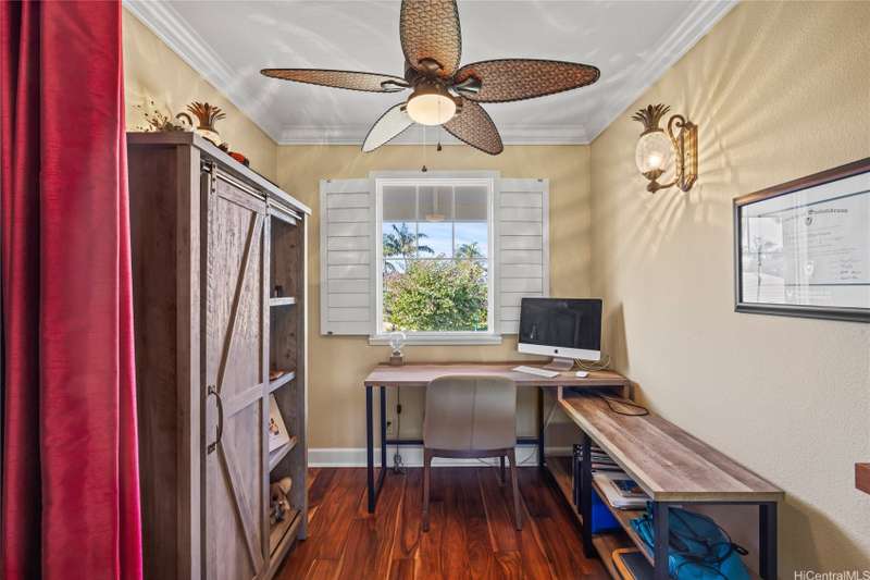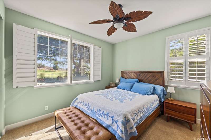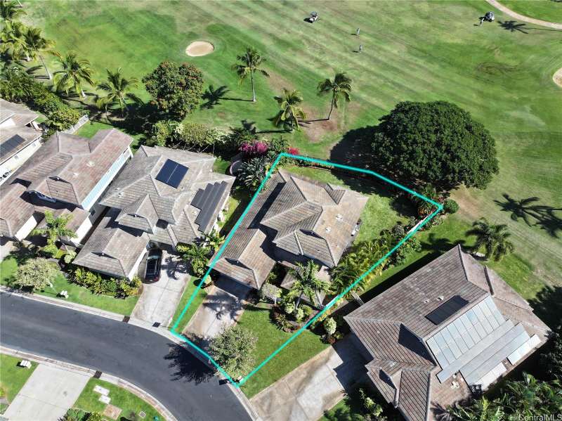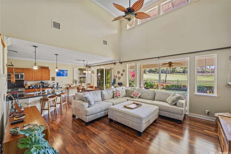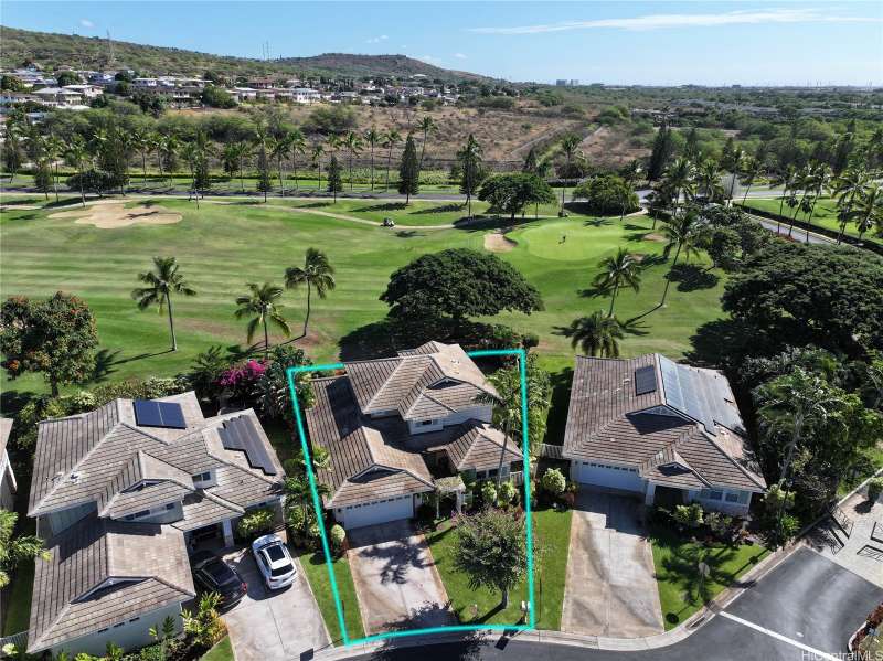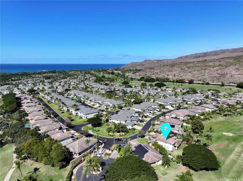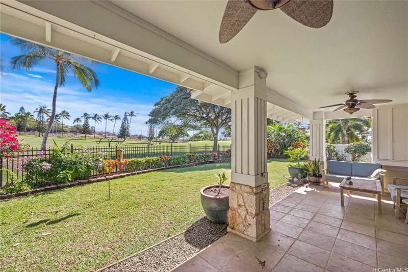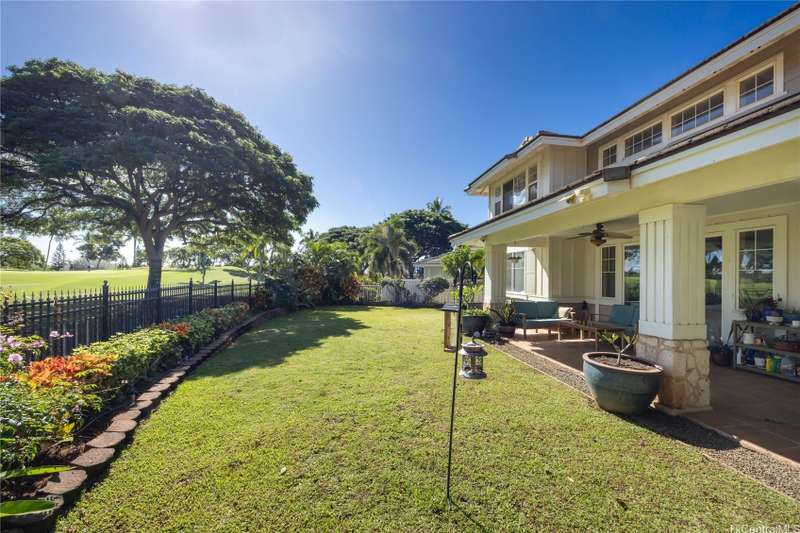 Resort style living at its best with golf course views on the 15th green! The expansive backyard is a tropical paradise completely fenced in for your pets or small children. Custom designer upgrades with acacia wood floors, plantation shutters, crown molding and tiled lanai. Spacious private primary suite on the 2nd floor. The first floor den w/separate entry can be used as a gym, office, or converted into a 4th bedroom. Stainless steel appliances in the kitchen. Living room has vaulted ceilings and windows with lots of natural light. Entertain on your spacious lanai or enjoy a morning sunrise. Drive your golf cart to any of the four lagoons, Aulani Resort and Four Seasons Resort. Perfect as a vacation home or investment! Access to Ko Olina Beach & Sports Club which includes a fitness gym, tennis courts, fitness classes, and much more!