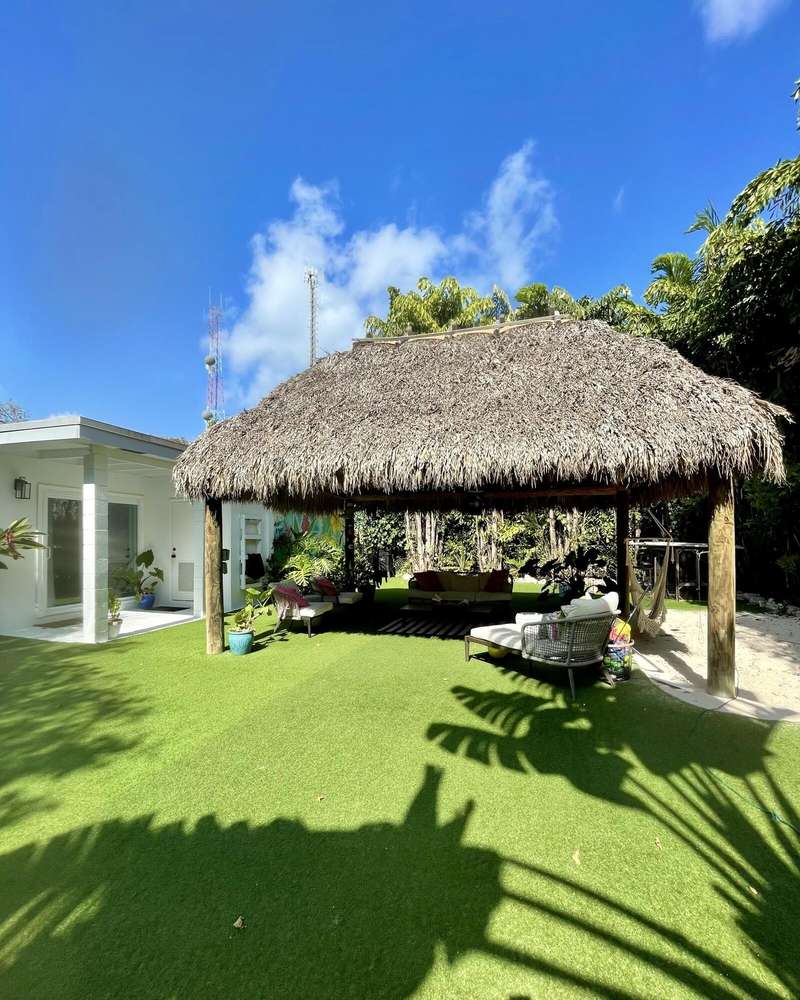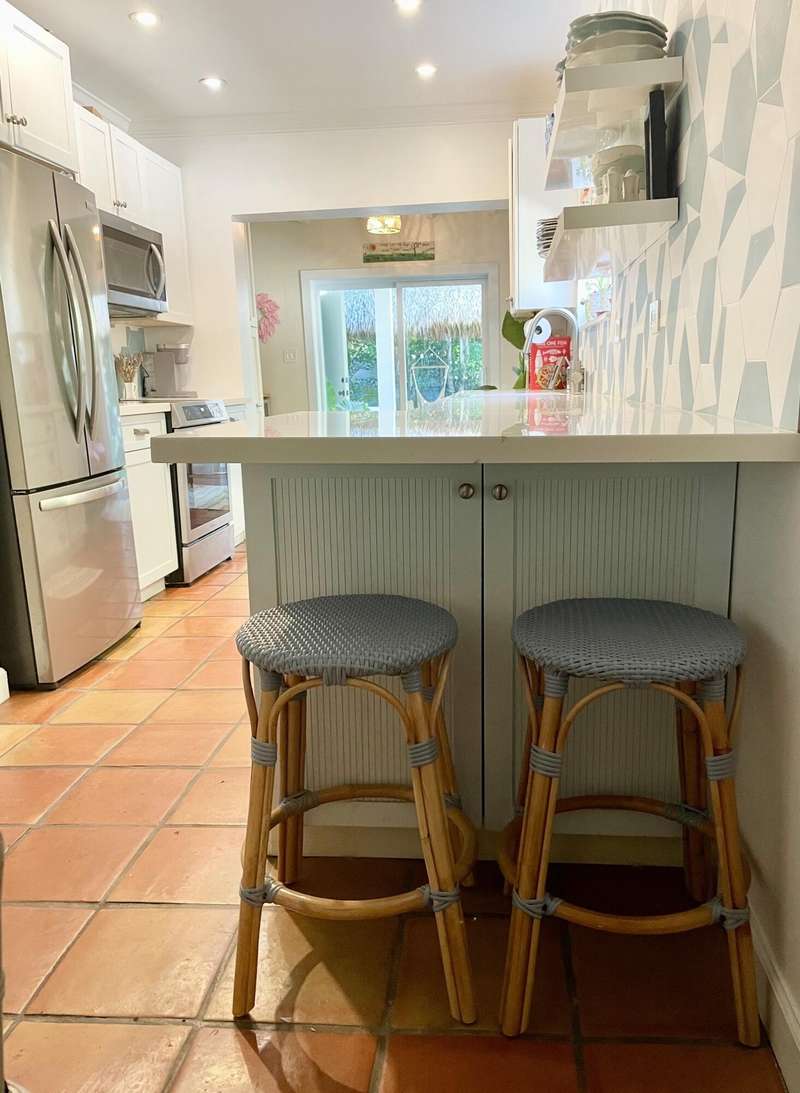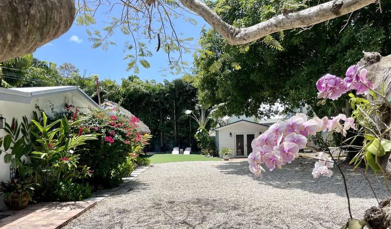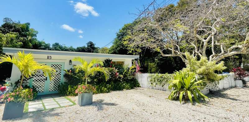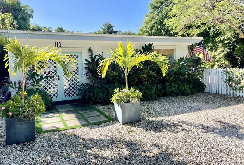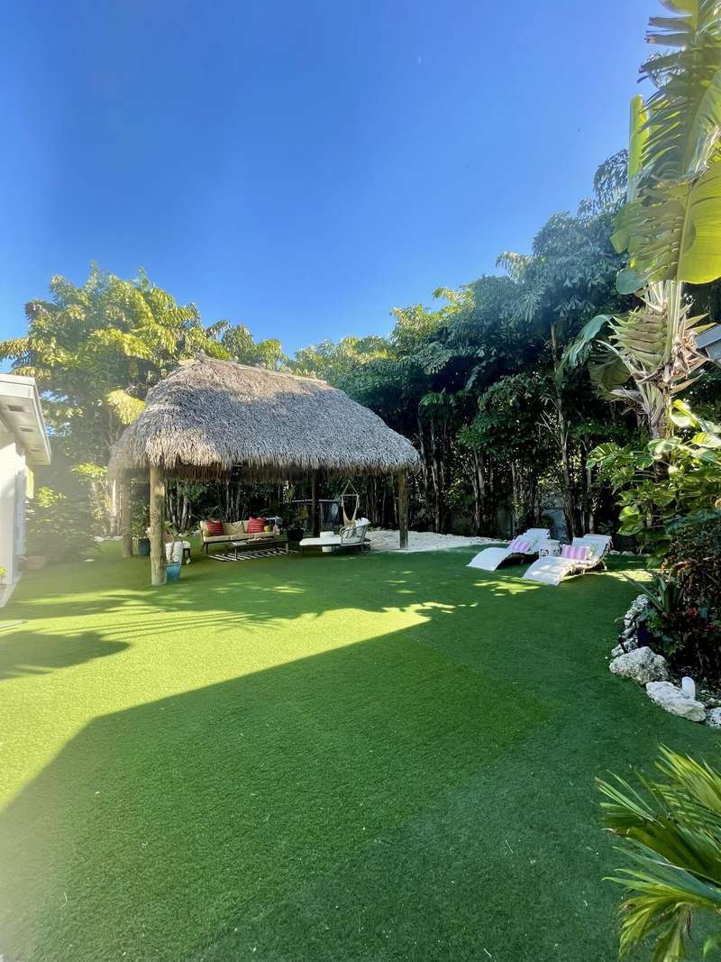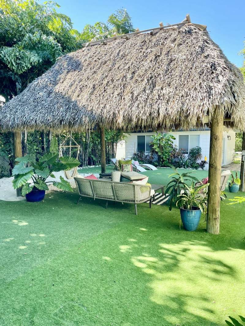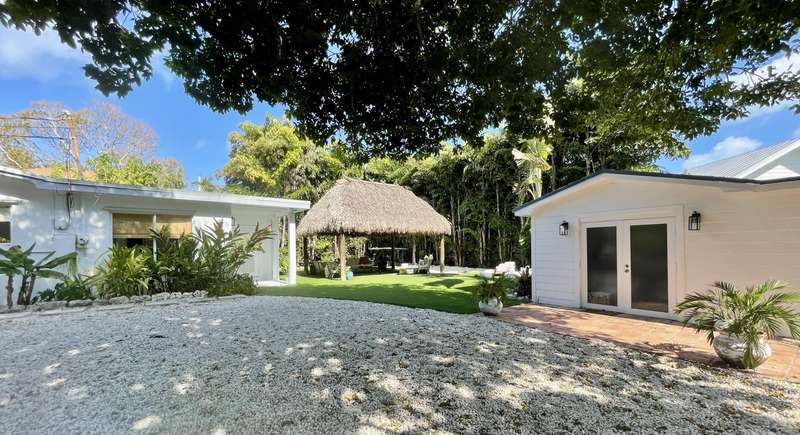 Conveniently located on Plantation Key in Islamorada, discover the charm of this bungalow situated on a rare DOUBLE LOT. The Dade County Pine ceilings and classic Saltillo tile floors are paired with modern updates to the kitchen with new appliances, including an induction range and oven, quartz counter tops and tile backsplash, pairing classic architecture with modern style and convenience. The primary bedroom includes an en suite bathroom and walk in closet. Off the kitchen you will find an entertaining space and bar area which leads to your backyard paradise, complete with a lush turf lawn and 100 sqf Tiki hut perfect for entertaining complete with ambient lighting and fans. The entire property is surrounded by professional, mature landscaping which offers both privacy and a tropical oasis.Additional features include a versatile storage outbuilding for all your outdoor gear or extra flex space. The lot has plenty of room for parking your boat, vehicle, toys or transforming into your own personal retreat with a pool or addition. The neighborhood incudes an optional HOA park just a block away with a boat ramp or kayak access, dock, fish cleaning station or enjoy the breathtaking sunsets over the bay. This home is in a quiet residential neighborhood on Plantation Key and only a mile and half from Founders Park where you can enjoy pickleball, tennis, swimming, dog park and marina or many of Islamorada's local events. Don't miss this unique opportunity to own a slice of paradise.